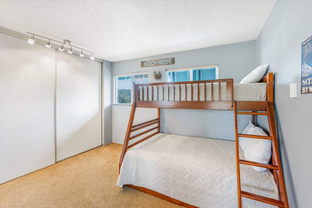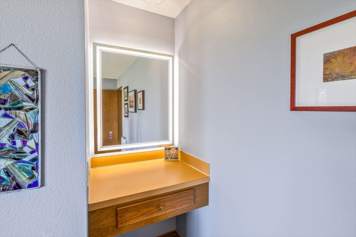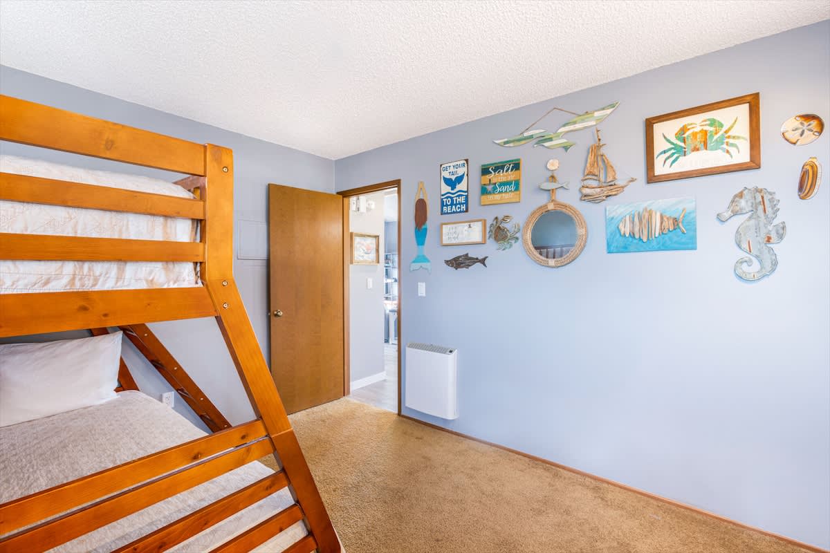 When it's time to rest, there's a comfortable queen bed with a cozy dressing nook with lighted mirror in the primary bedroom, while the second bedroom includes a double over twin bunk bed. The heated bathroom features a tub and shower combination, along with plenty of plush linens for a luxurious and comfortable stay.