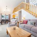 The cabin comes fully equipped with everything you need for the perfect winter stay, including a fully equipped kitchen, a wood burning fireplace, two living areas and a game room with foosball, ping pong, and an air hockey table, plus modern updates including smart locks and a digital guidebook to guide you through the home and neighborhood.