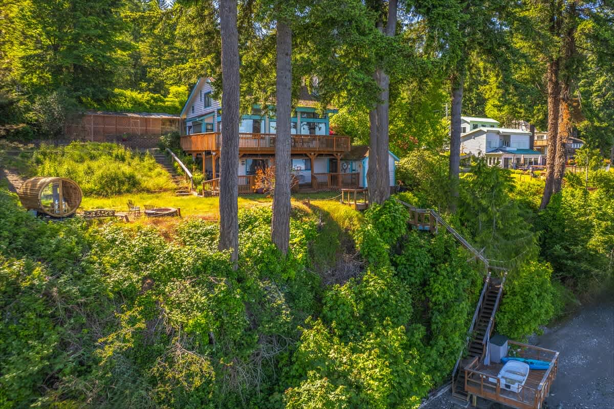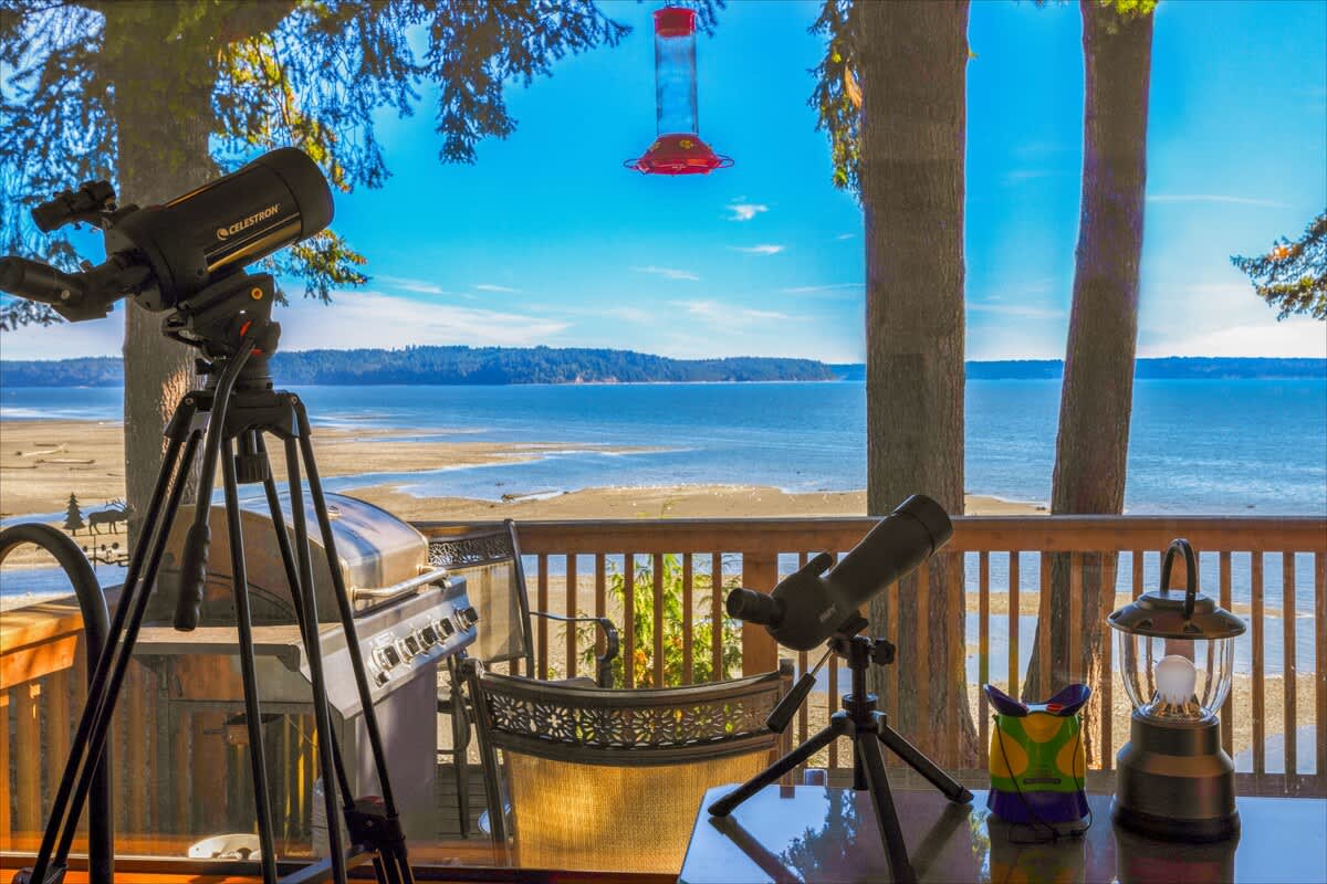 Capture the magic—your camera will love this place! The upper and lower decks boast breathtaking views of Mount Rainier, Mount Baker, and the stunning Hood Canal, where boats glide by. You might even spot an orca if you're lucky. With plenty of stylish outdoor seating for dining and lounging, plus a propane BBQ for those unforgettable al fresco meals, it’s a perfect setup. When the chill sets in, cozy up around the backyard fire pit for s'mores and sing-alongs under the stars. It’s the ultimate getaway experience!