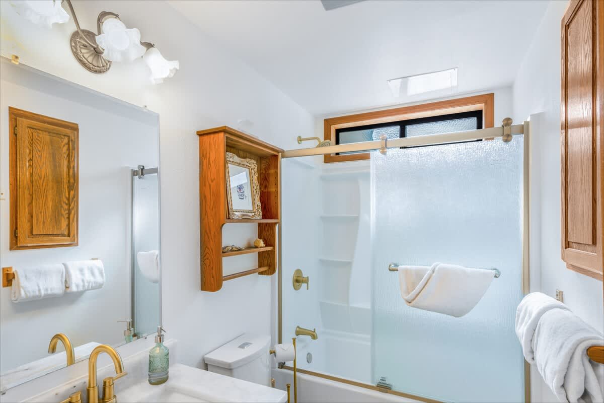 The kitchen has a full complement of new stainless appliances and all the pots, pans and cooking implements you need to whip up a big breakfast or a gourmet feast. Guests will enjoy chatting up the chef from the breakfast bar.