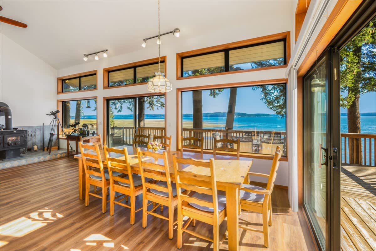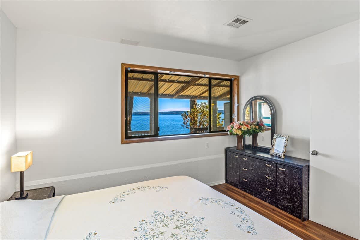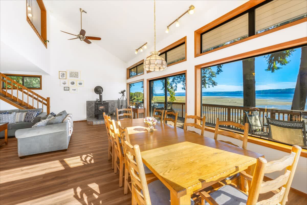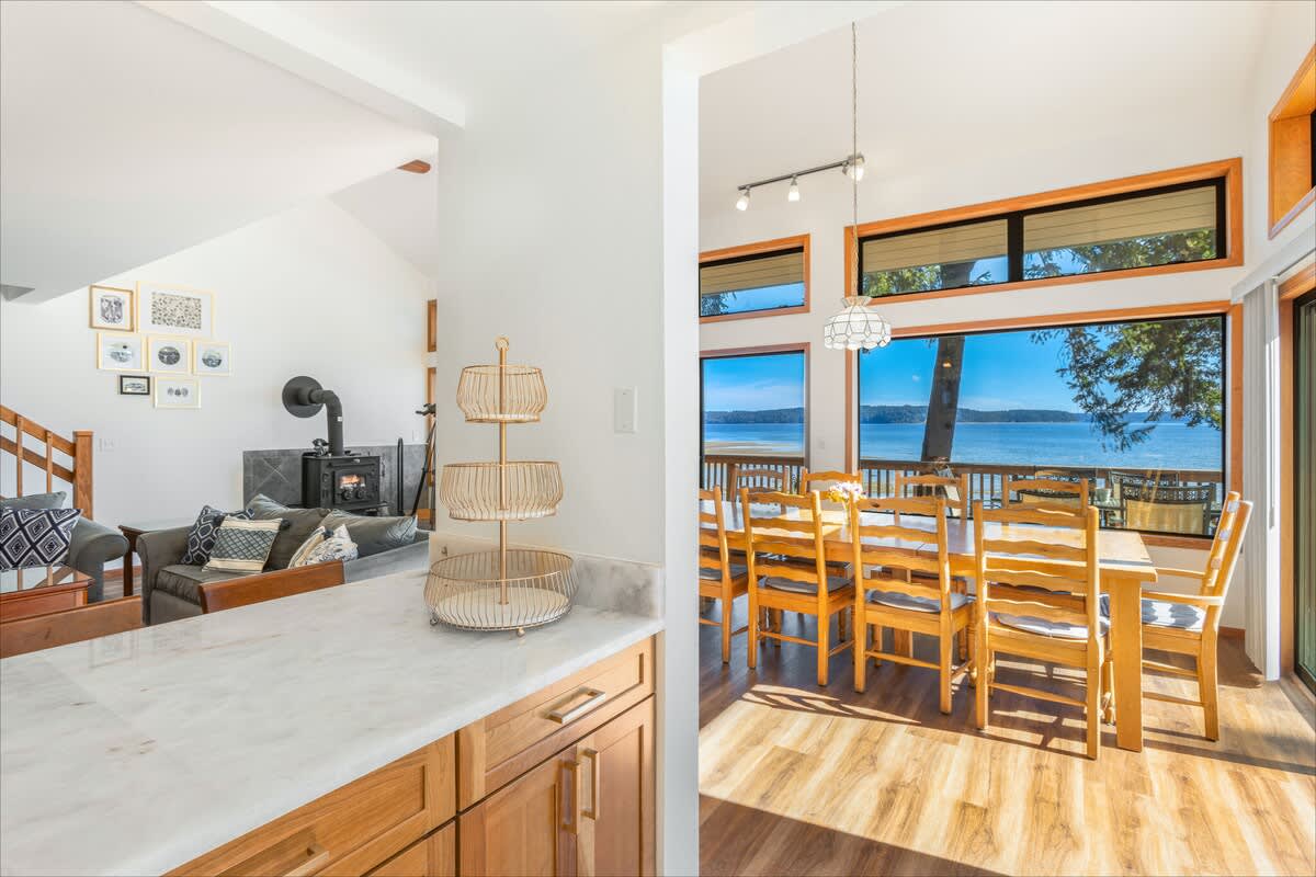 The interior was recently completely remodeled with plush living room furnishings to greet you, along with a wood-burning fireplace and majestic views of Hood Canal.