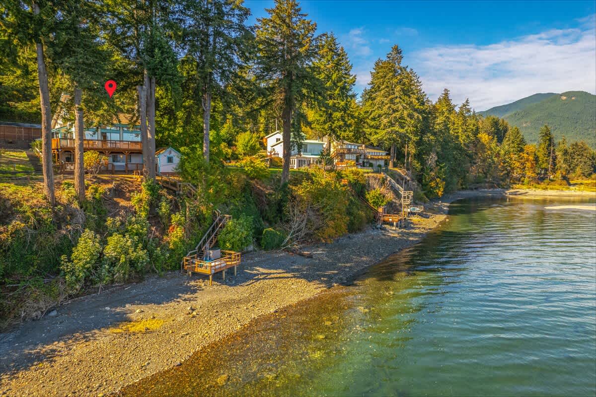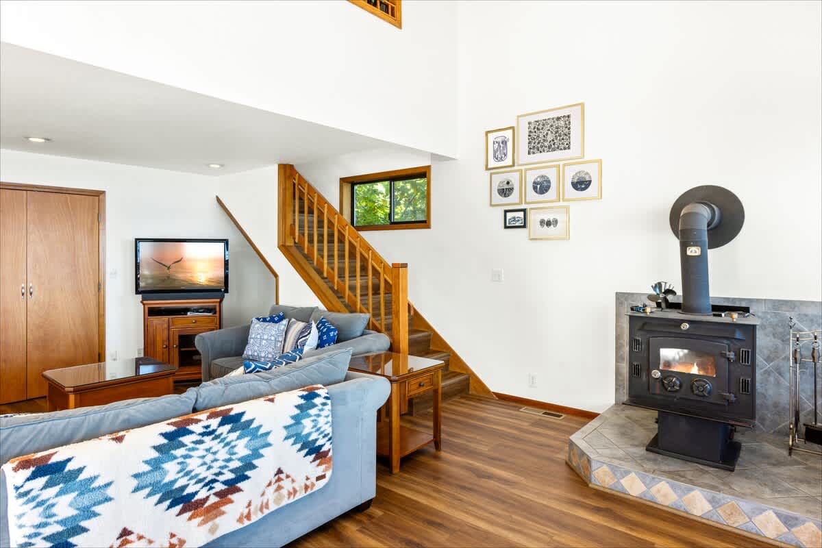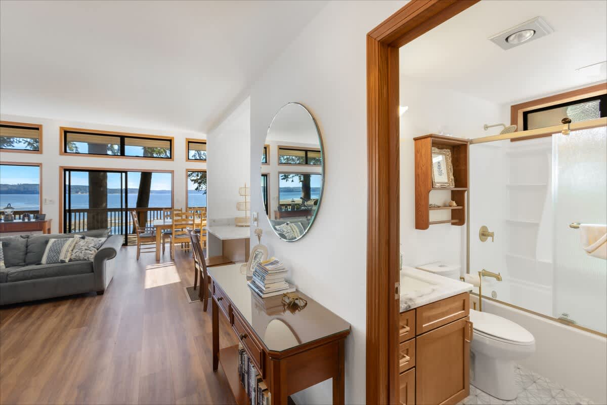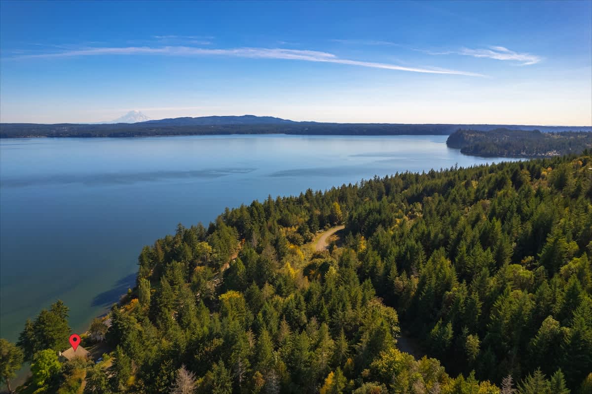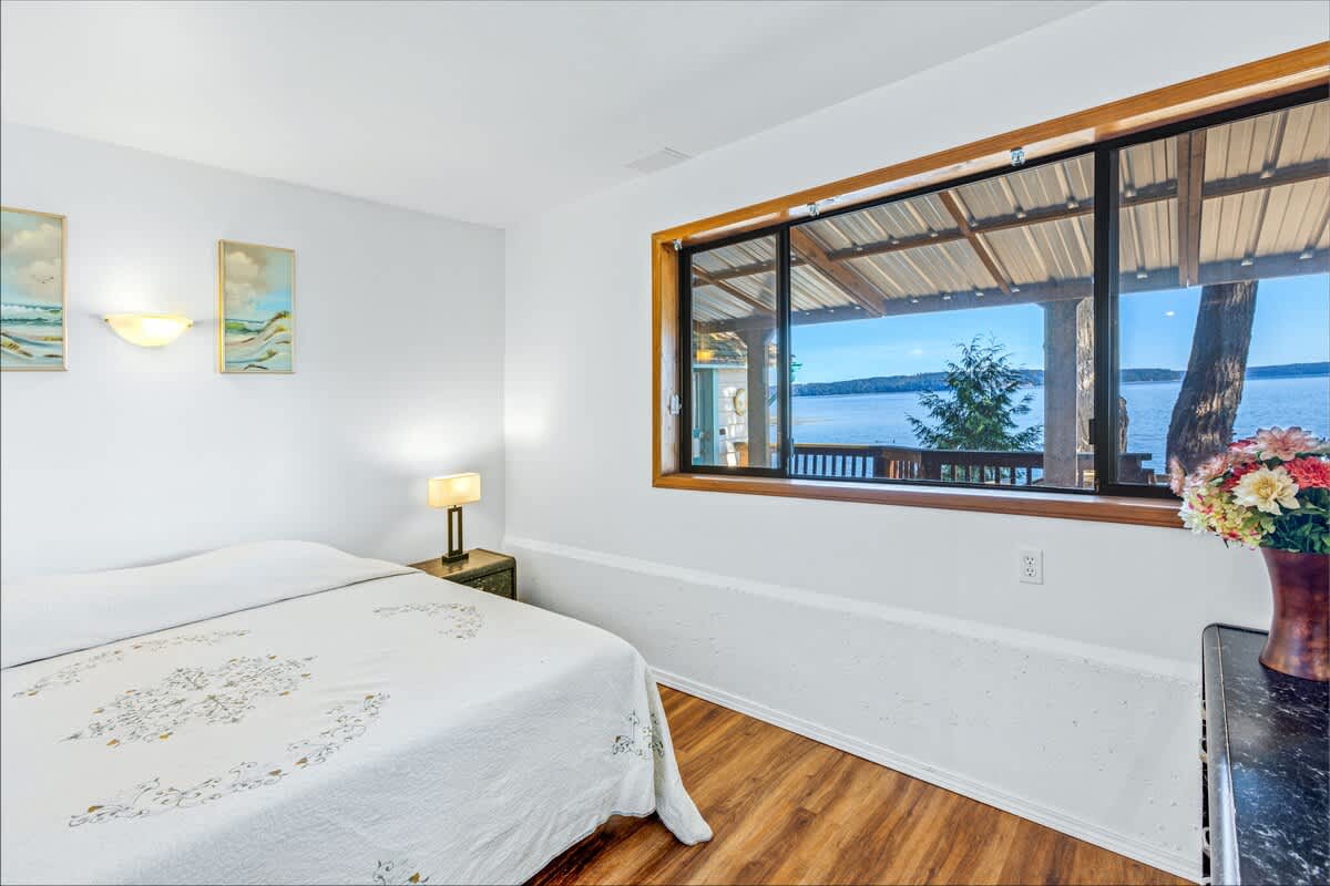The interior was recently completely remodeled with plush living room furnishings to greet you, along with a wood-burning fireplace and majestic views of Hood Canal.