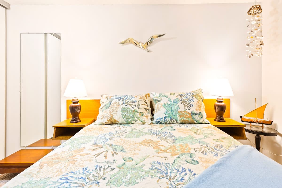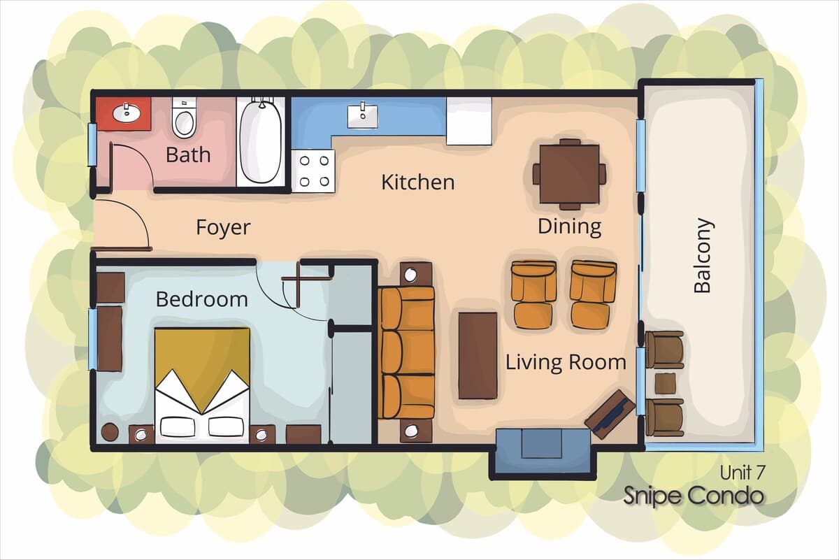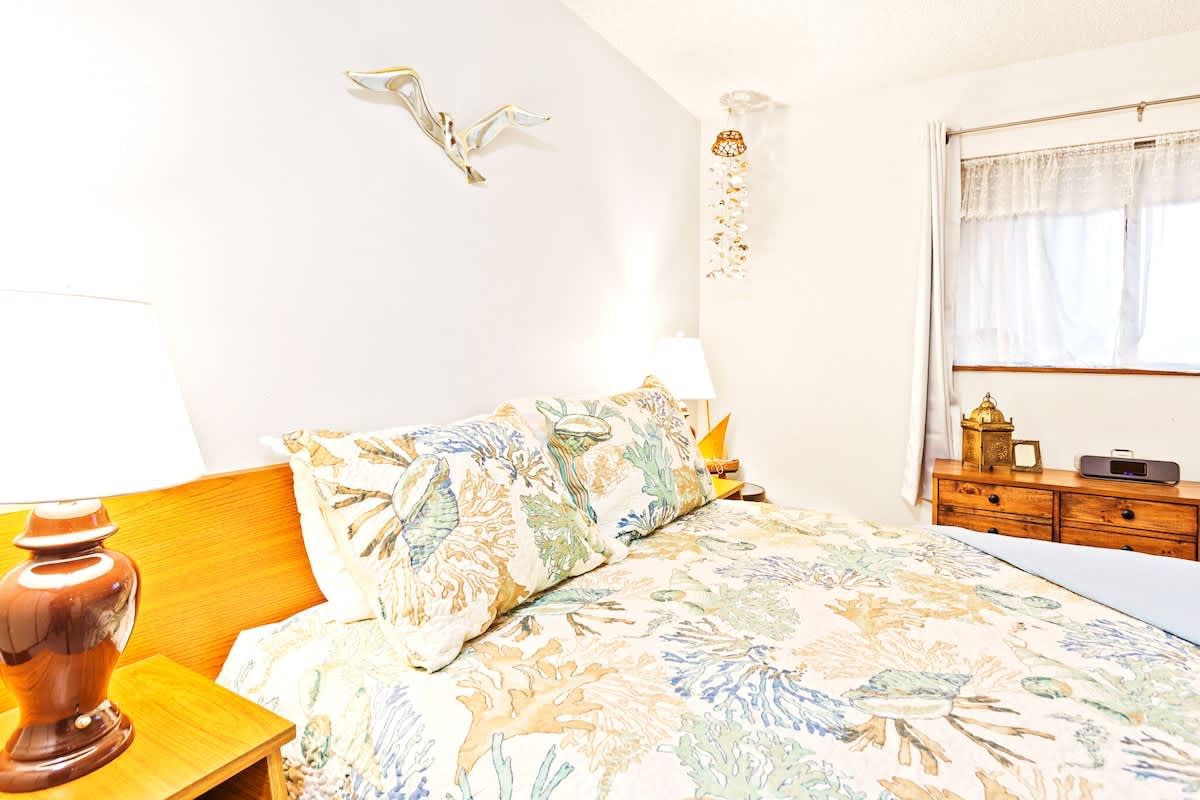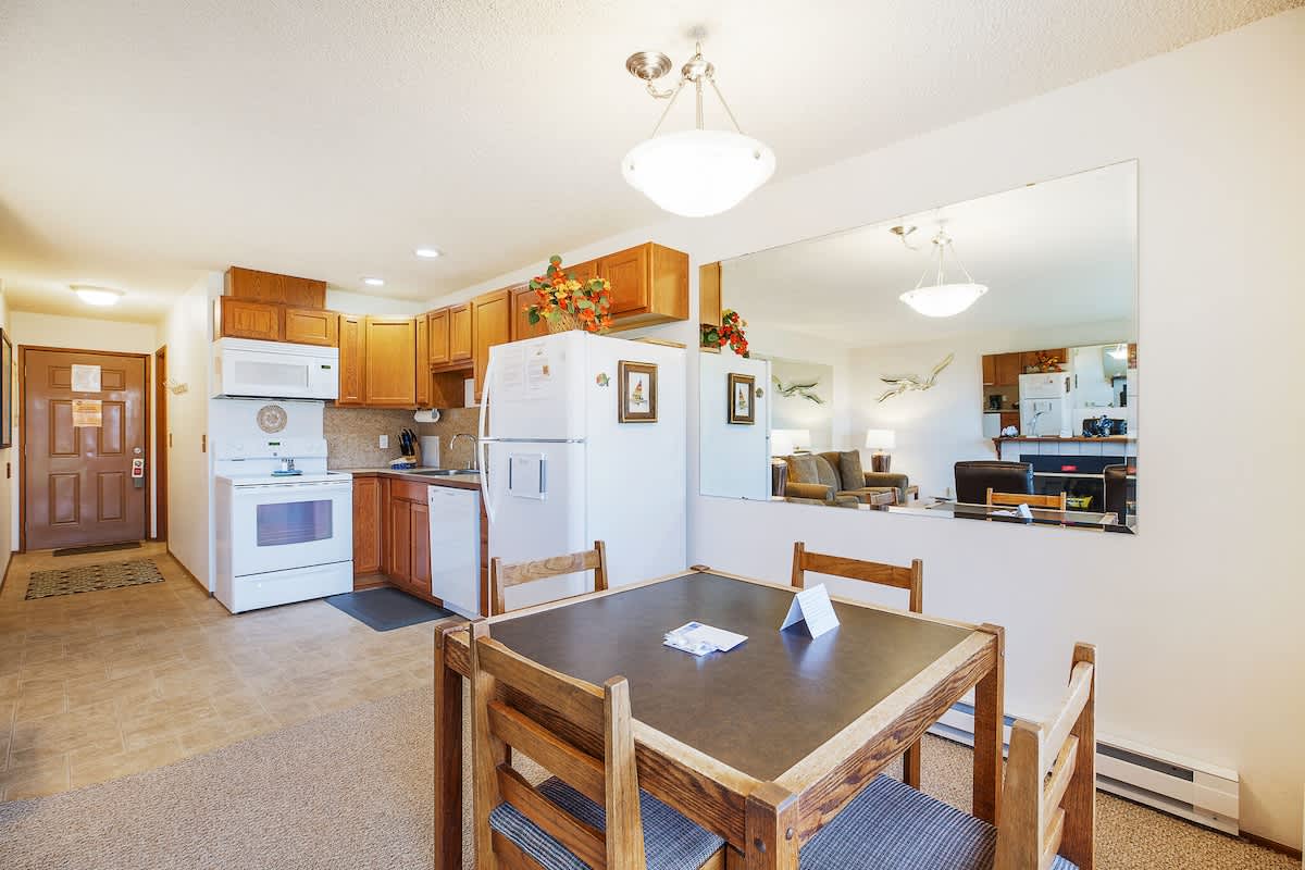 Up to four guests are welcome here between the bedroom and its queen bed and the sleeper sofa in the living area which can easily accommodate two guests. A full kitchen is stocked with pots, pans, flatware, and everything you need to cook your own meals before enjoying them at the adjacent dining area.