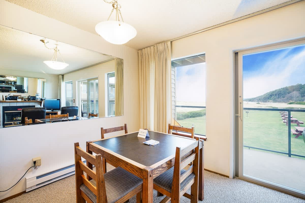 An inviting living area features a couch, coffee table and two comfortable leather recliners, all centered around a TV with DVD player. From your seats here, you can take in the tremendous view of the Pacific Ocean, the dunes, and the seabirds that flit about them. In good weather you can adjourn to the private deck and smell the sea air. Dogs are welcome with our standard per dog, per night fee.