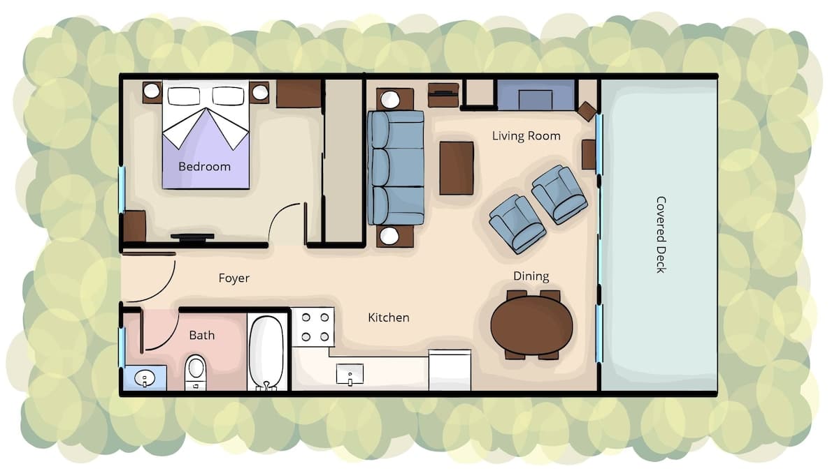 The bedroom features a high-quality queen bed and is supplemented with a sleeper sofa in the living area. A full kitchen is stocked with pots, pans, flatware and, everything you need to cook your own meals before enjoying them in the adjacent dining area.