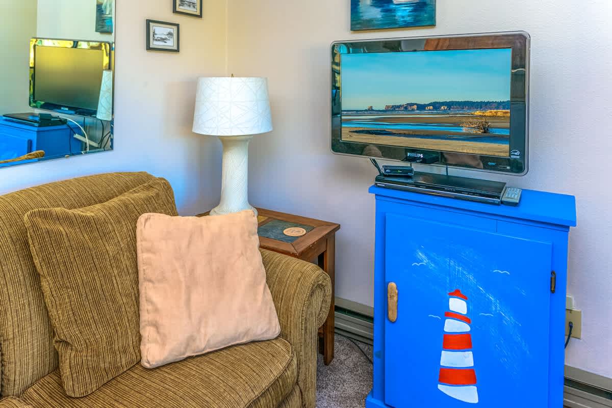 An inviting living area features a cozy couch, coffee table and two extremely comfortable recliners, all centered around a TV with DVD player and a wood burning fireplace. However, if you like to stay entertained, you'll find the best part of your stay to be the incredible views of the coast. Enjoy them from the comfort of the living room or from your private deck. Dogs are welcome with our standard per dog, per night fee.