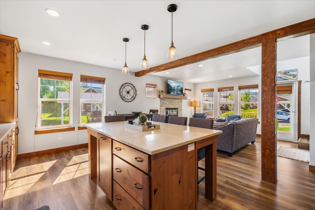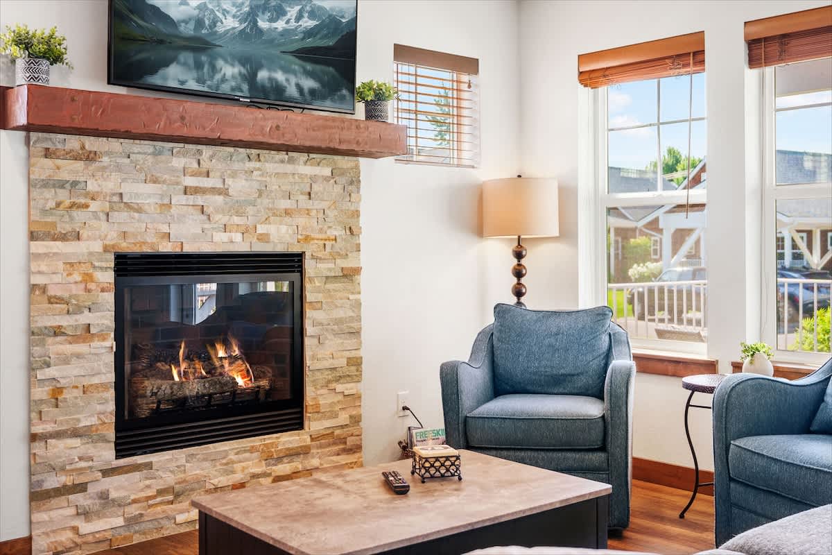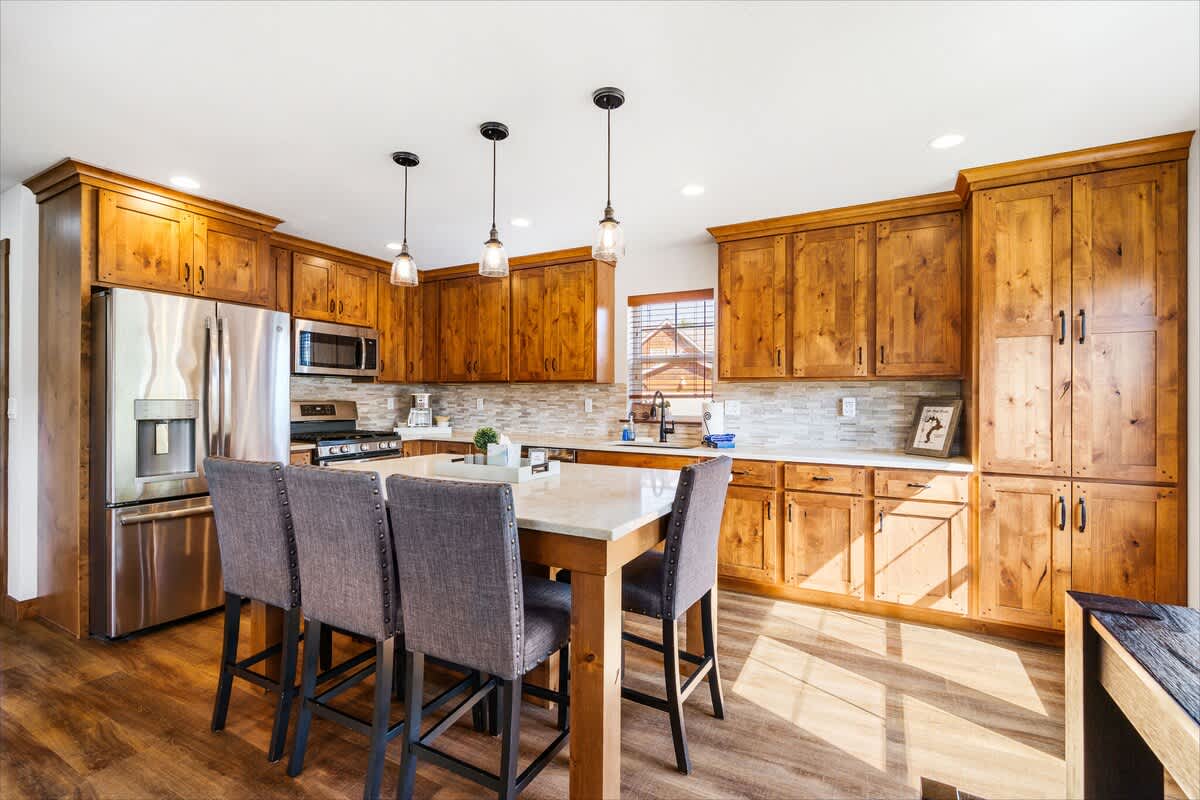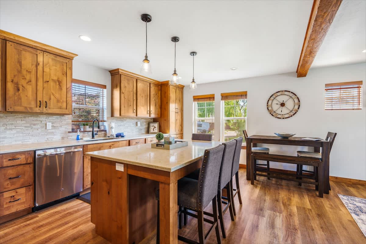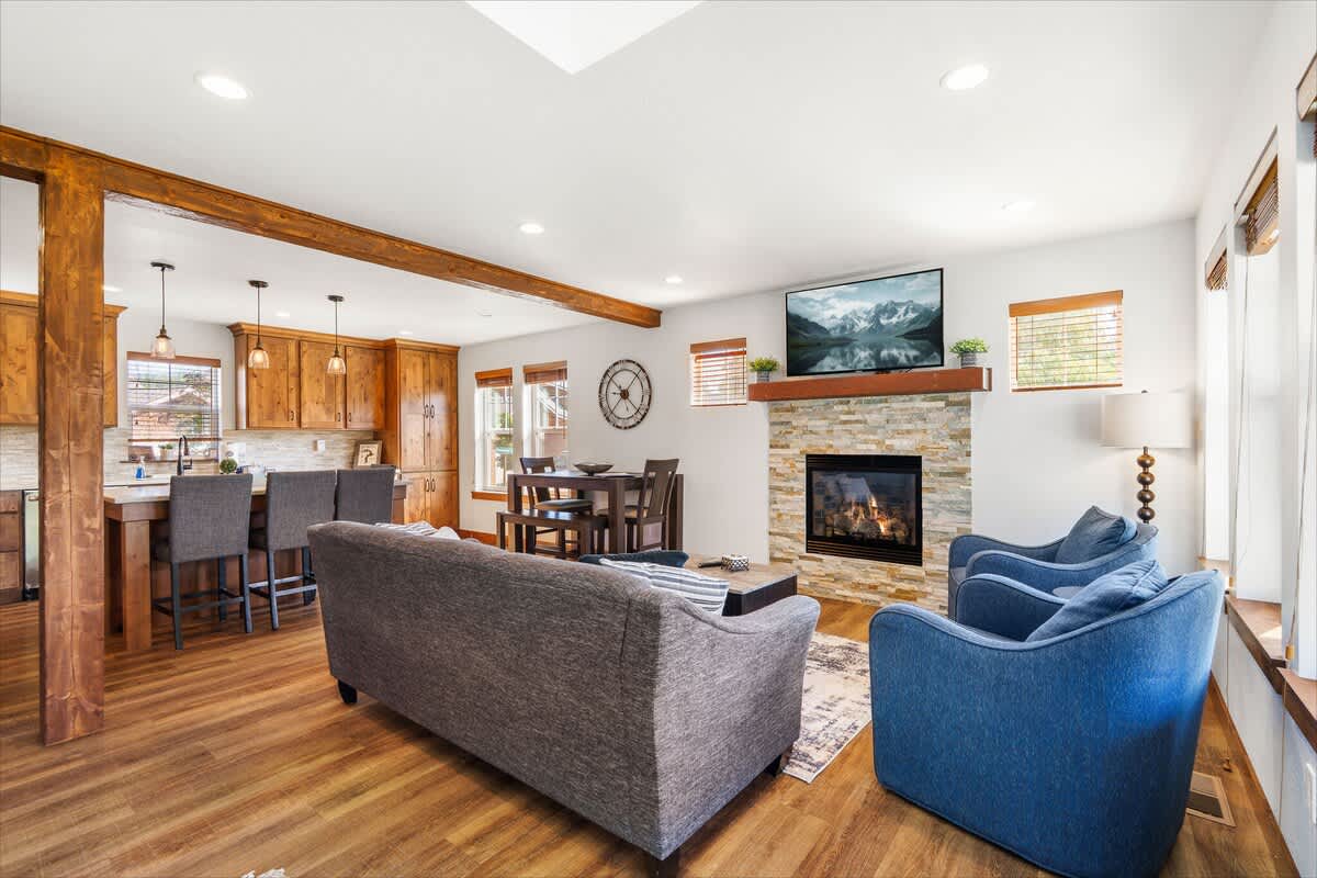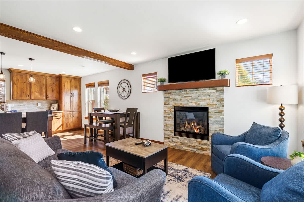 The living area is ideal for winding down with a movie on the smart TV or enjoying board games after a day of outdoor adventure. The fully stocked kitchen includes everything you need to prepare meals—complete with a dishwasher, microwave, oven, and all the cookware essentials.