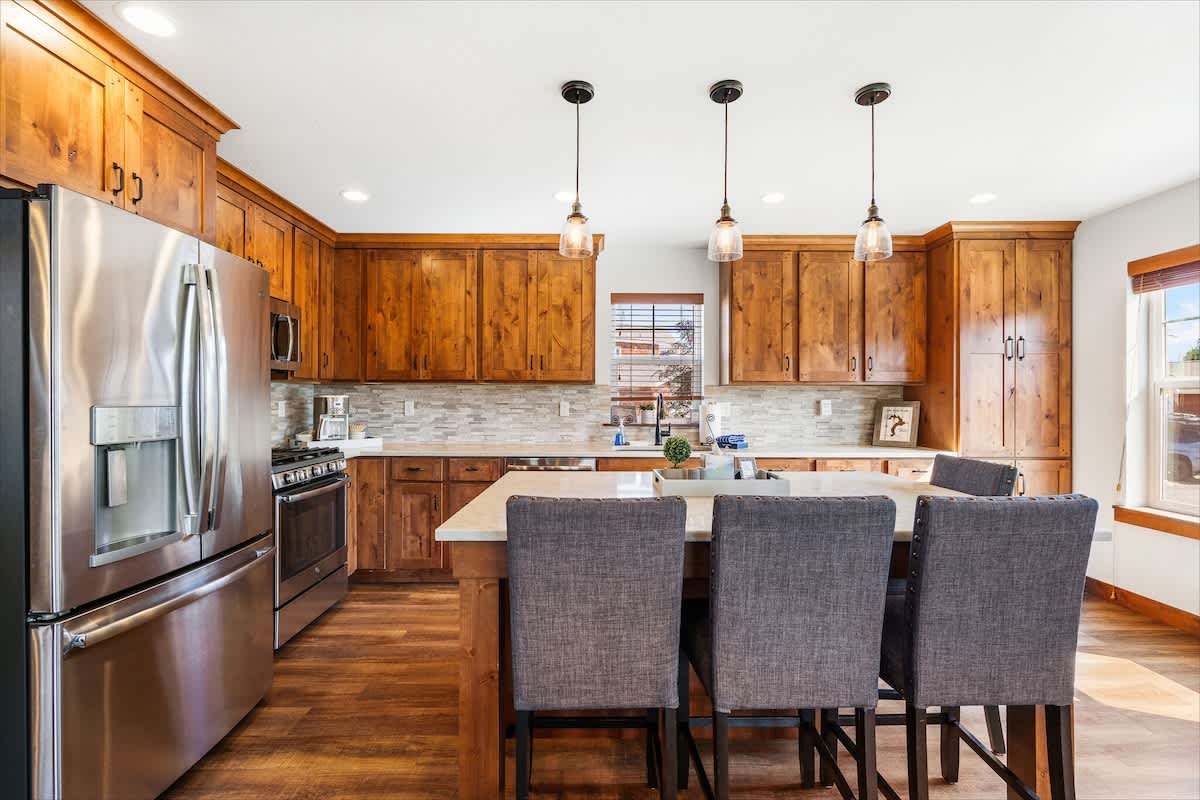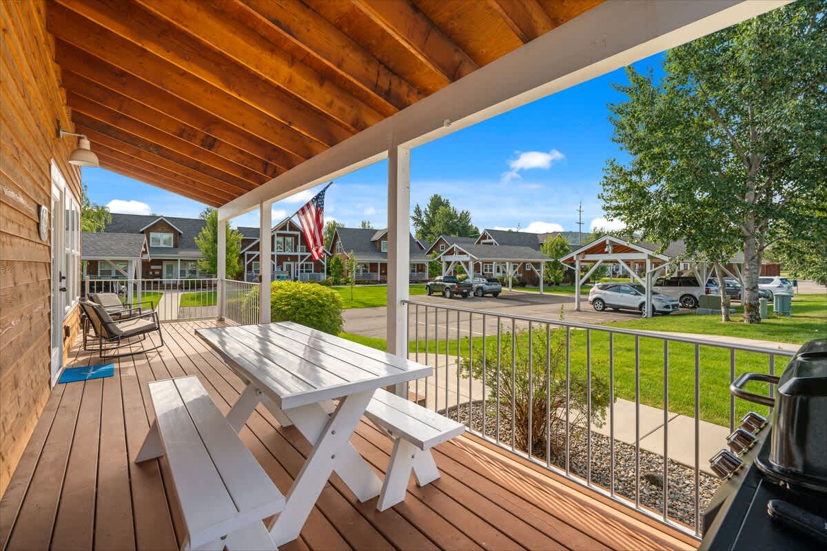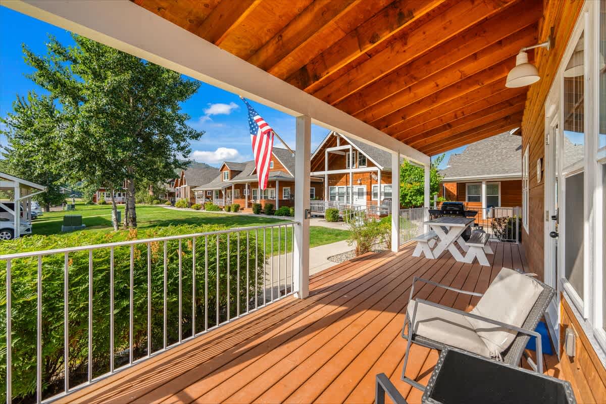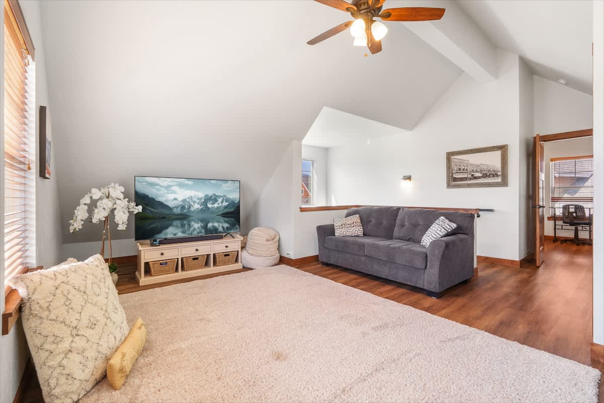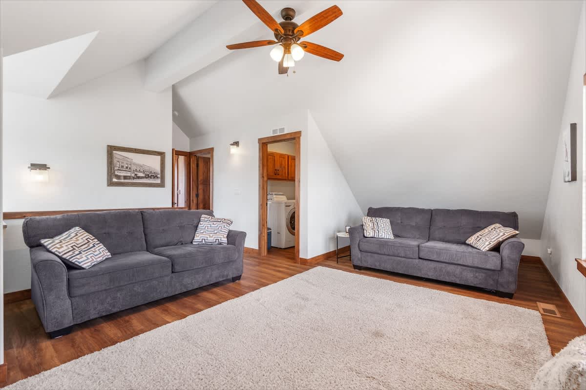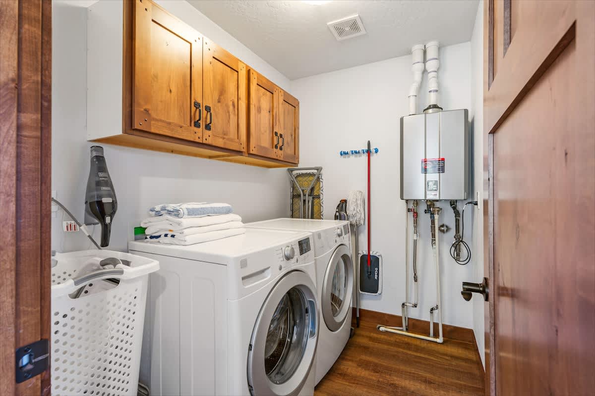 The living area is ideal for winding down with a movie on the smart TV or enjoying board games after a day of outdoor adventure. The fully stocked kitchen includes everything you need to prepare meals—complete with a dishwasher, microwave, oven, and all the cookware essentials.