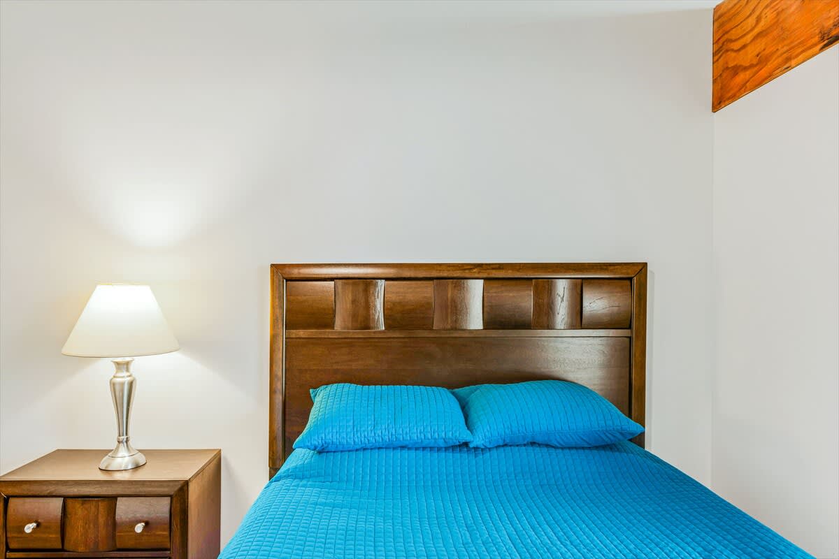 The bedroom has a large sliding privacy door as well as an entrance door on the kitchen side, giving access from both sides of the room. A comfortable queen-sized bed is roomy enough for two and a third person can be accommodated on the cozy living room couch.