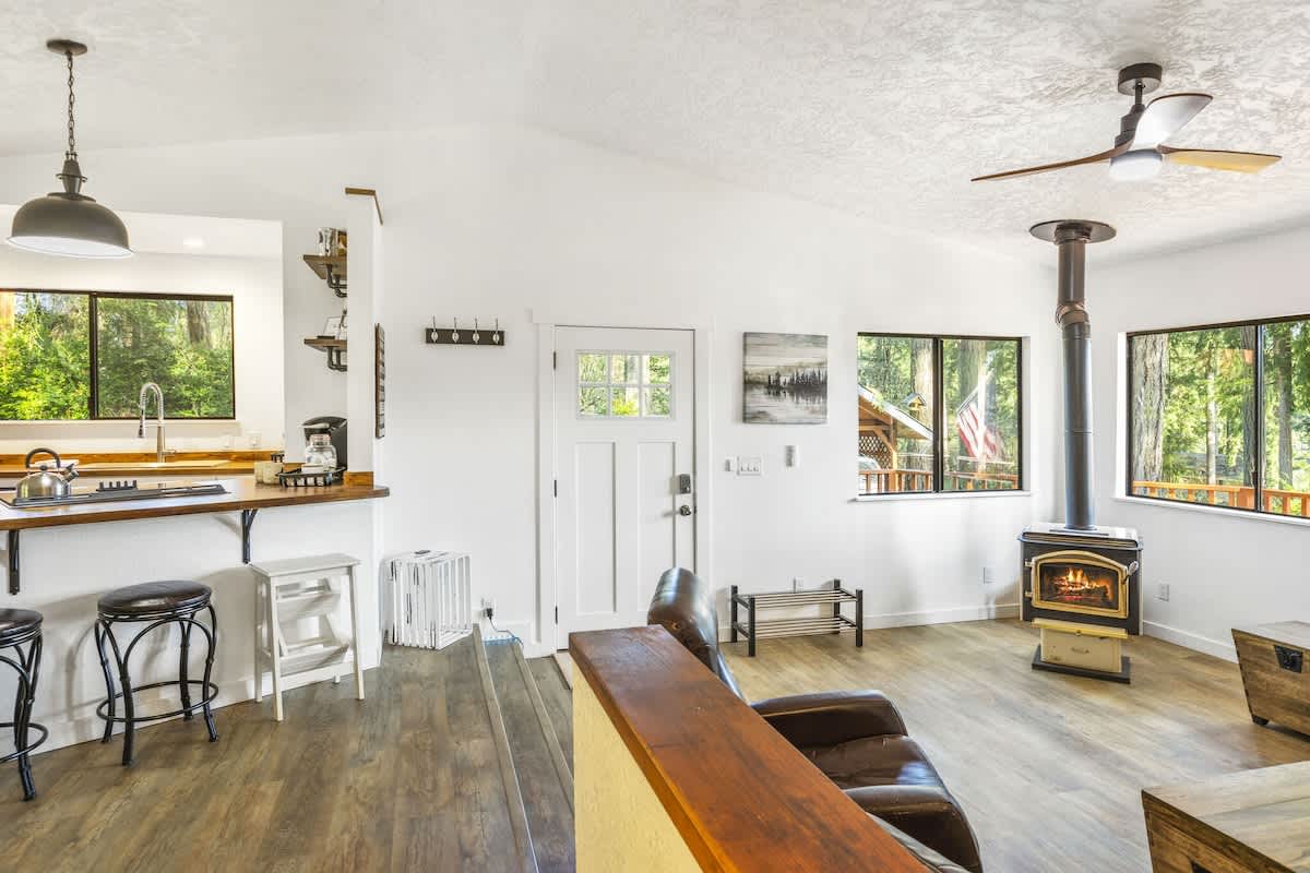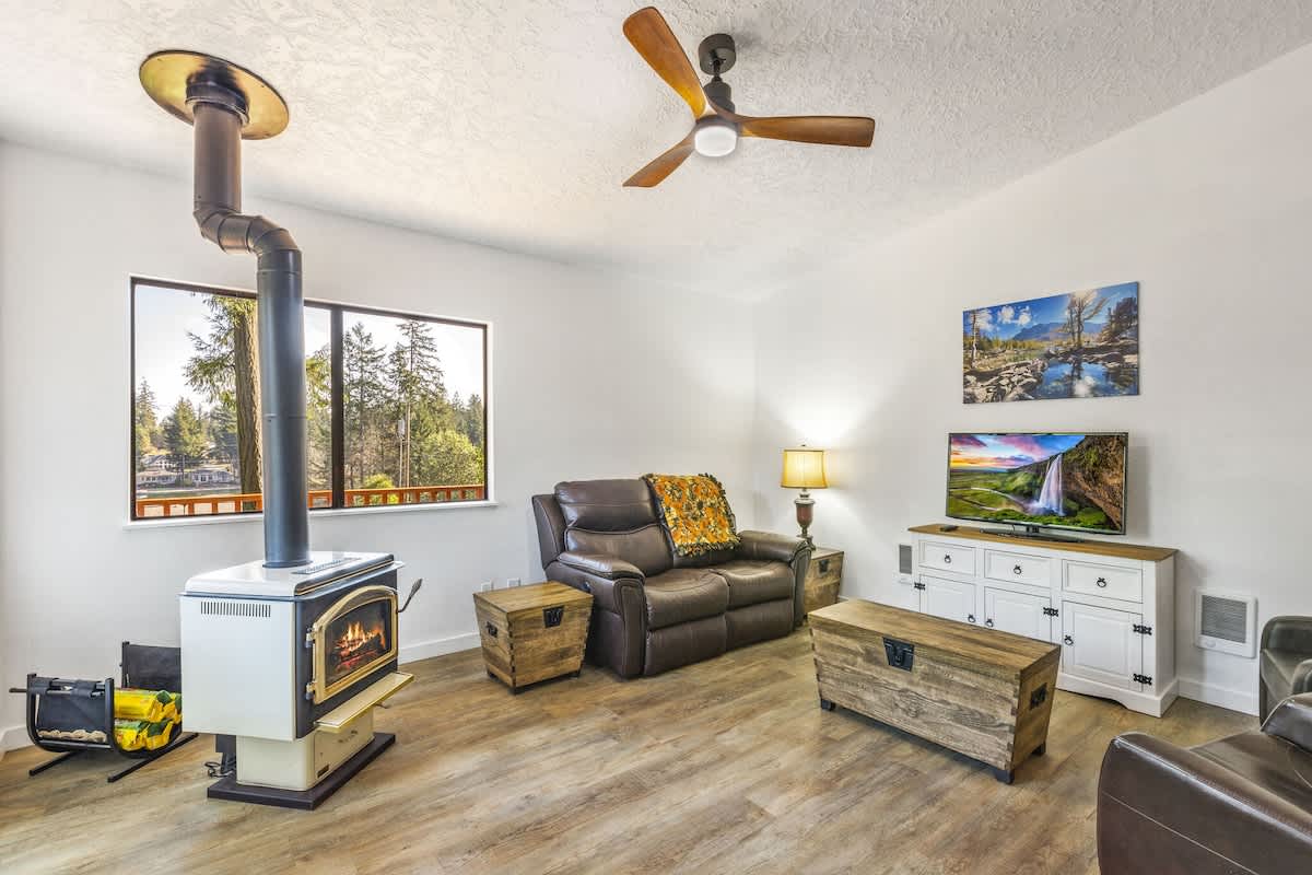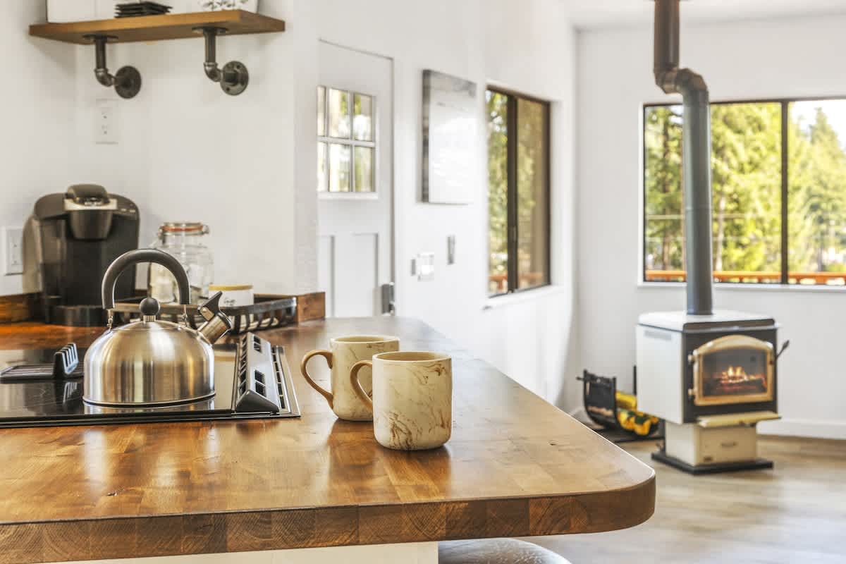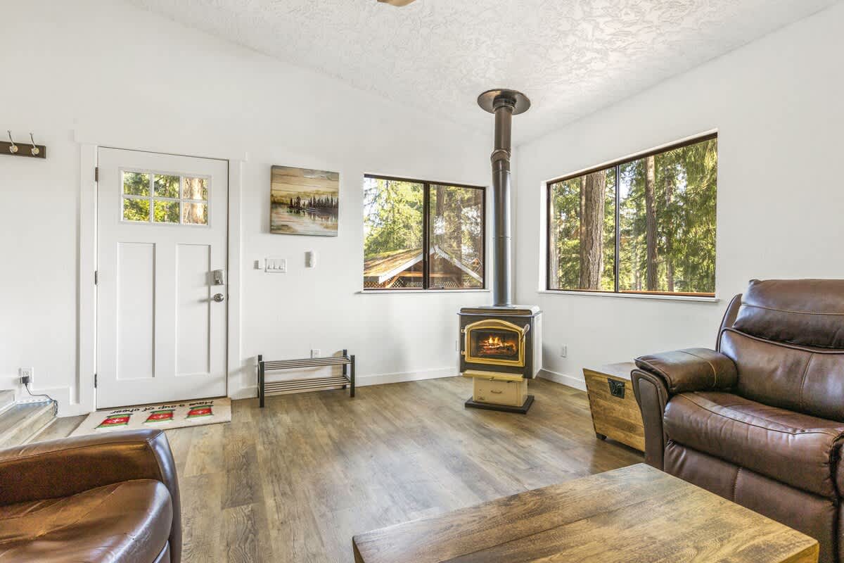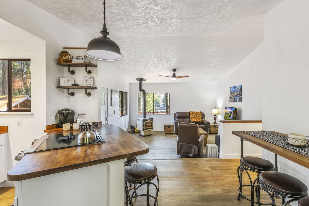 The coziness is on display in the living room where a rustic wood burning stove will warm you on chilly nights, while you nestle into the comfortable furnishings. The well-appointed kitchen features wood countertops, updated appliances, and an island overlooking the living and dining area. In addition to plenty of pots, pans and dinnerware, the kitchen also includes a microwave, toaster and gourmet coffee maker.