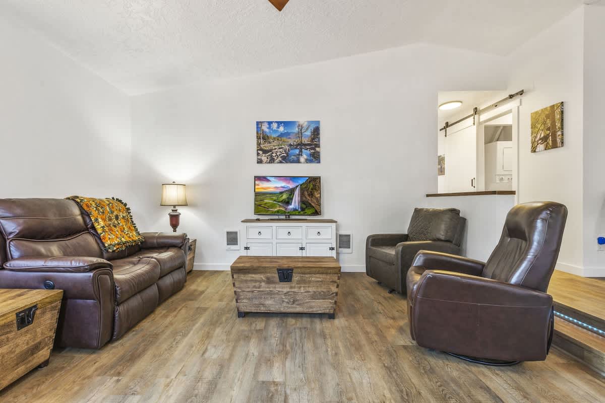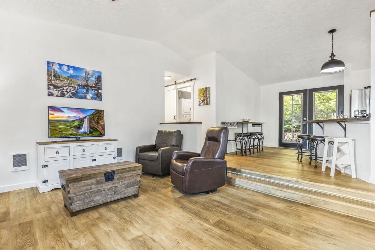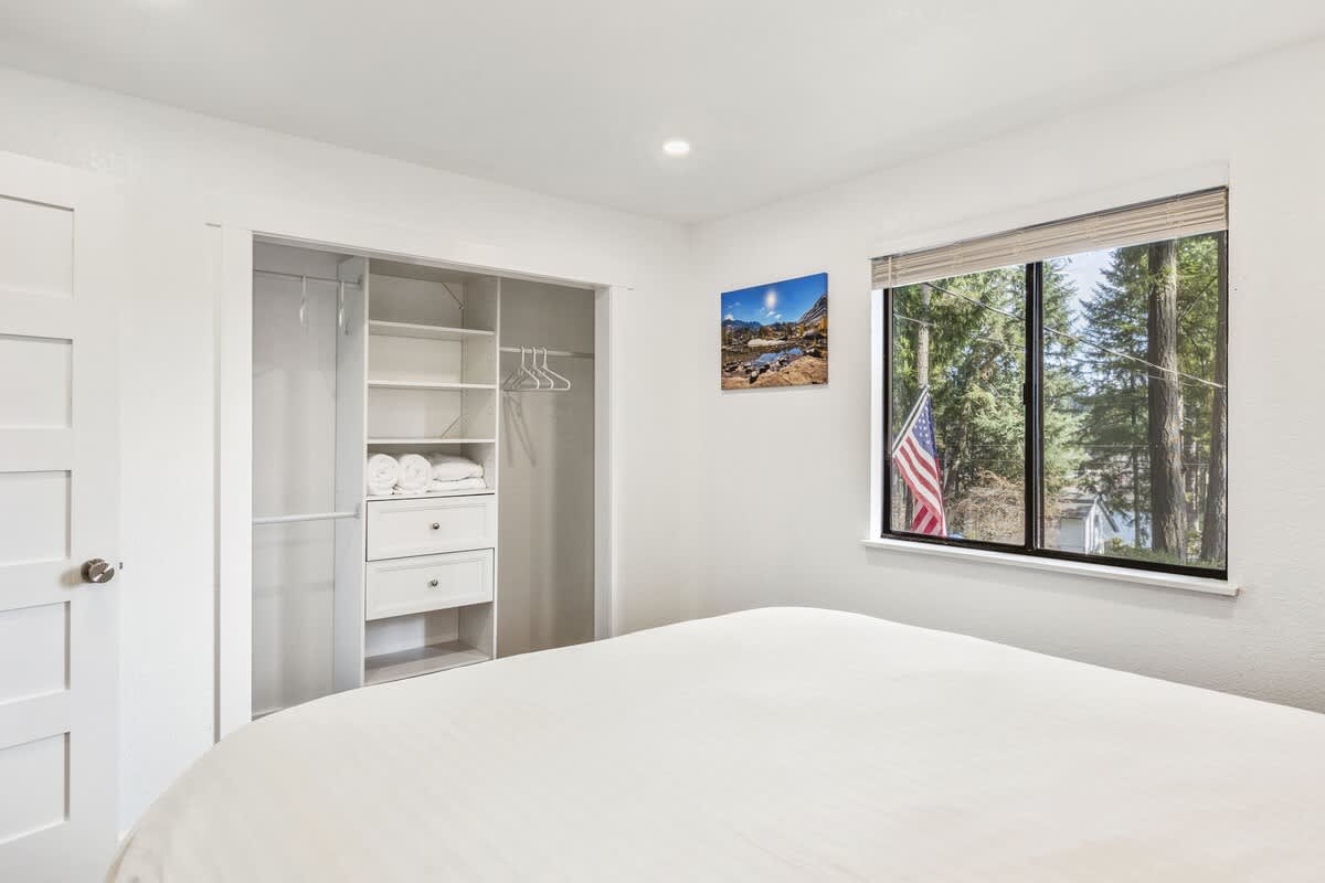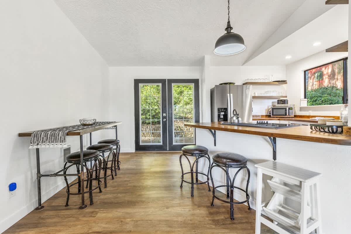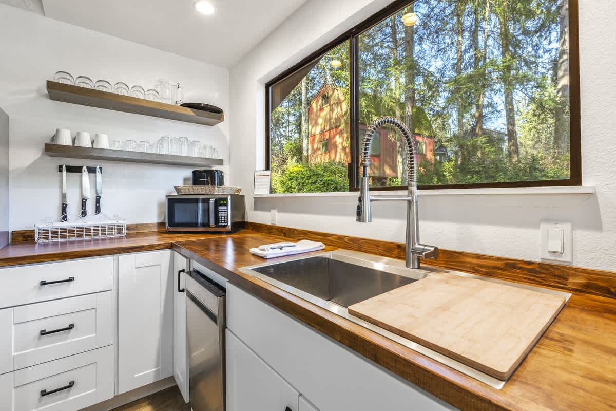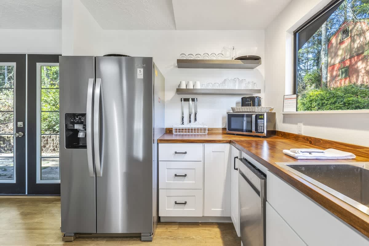 The coziness is on display in the living room where a rustic wood burning stove will warm you on chilly nights, while you nestle into the comfortable furnishings. The well-appointed kitchen features wood countertops, updated appliances, and an island overlooking the living and dining area. In addition to plenty of pots, pans and dinnerware, the kitchen also includes a microwave, toaster and gourmet coffee maker.