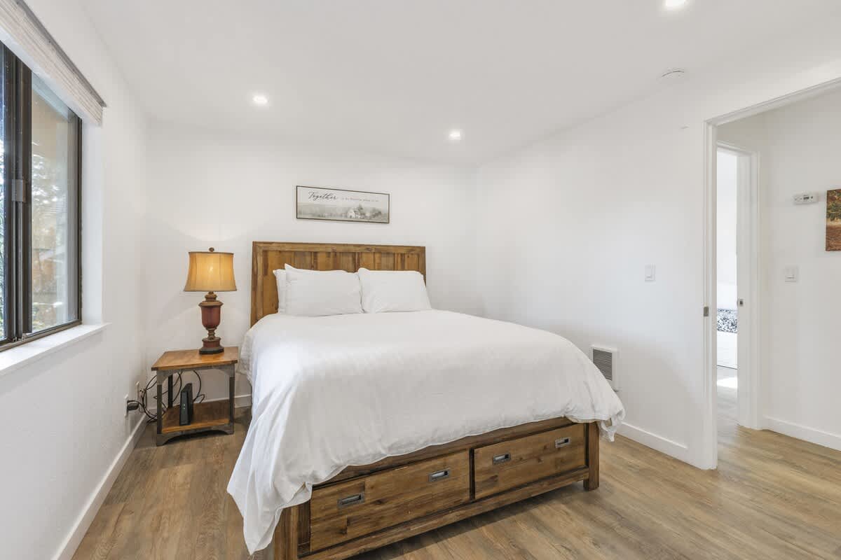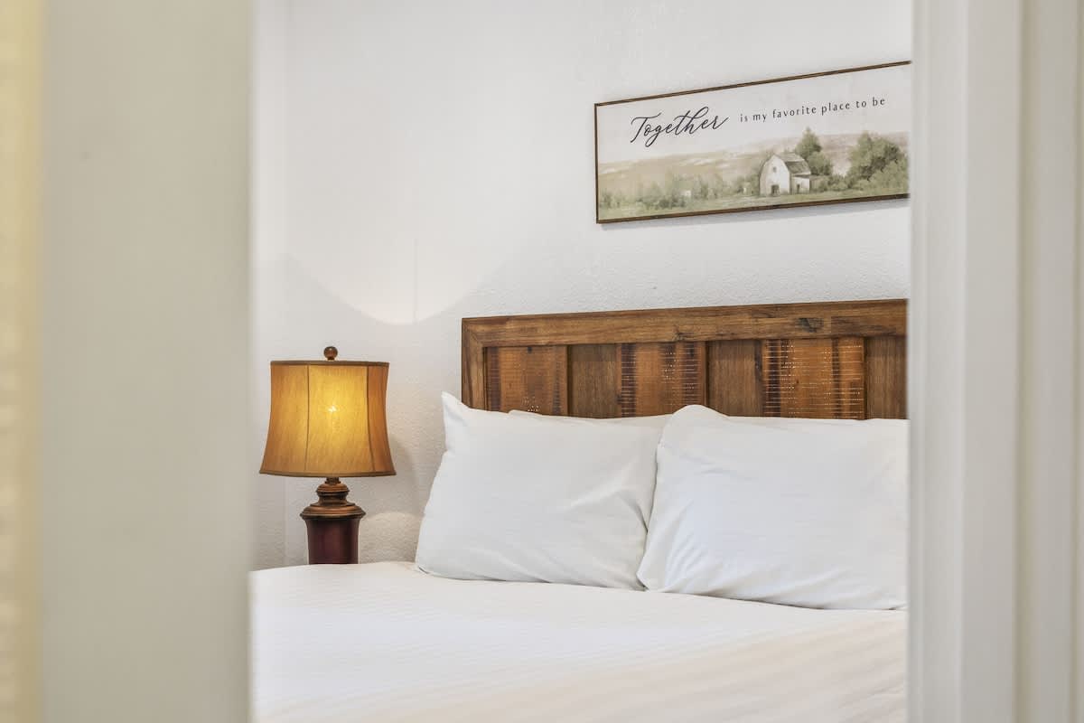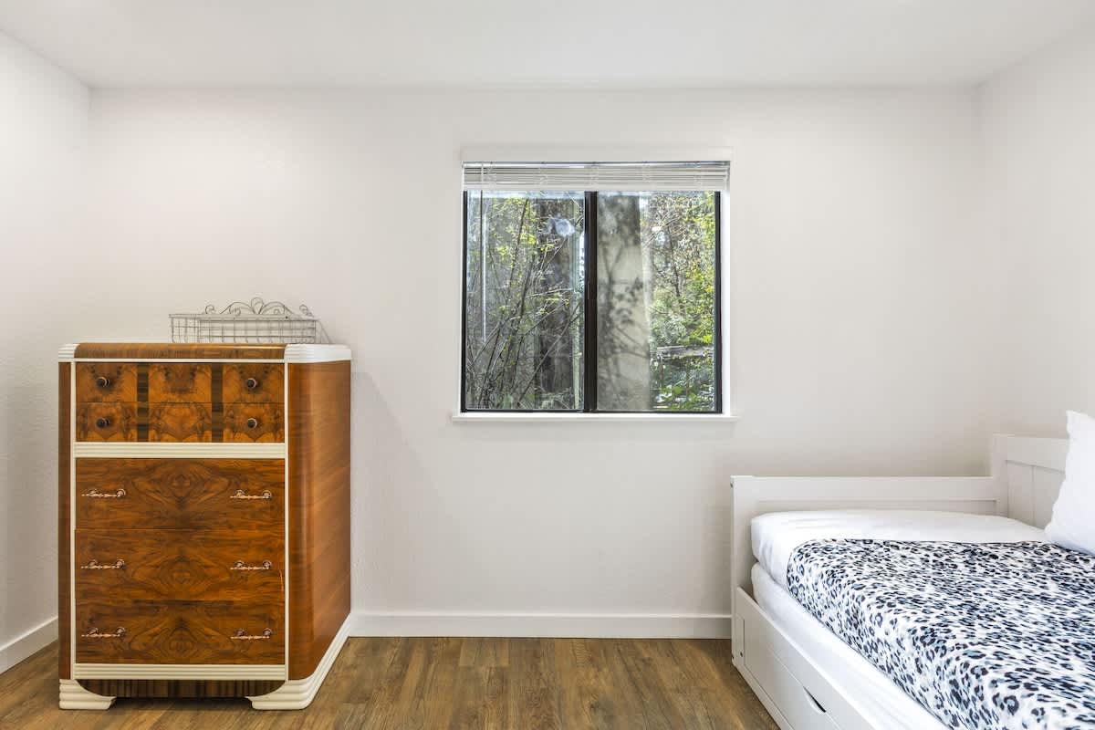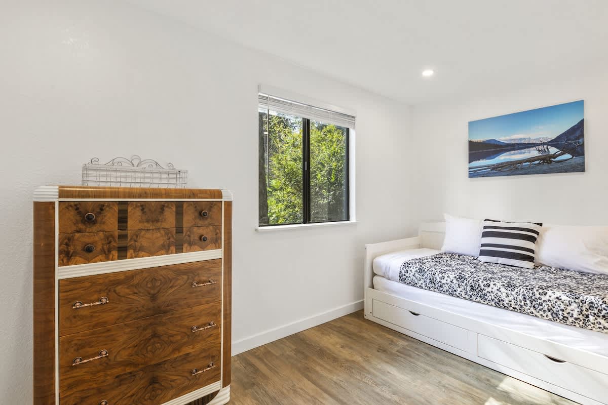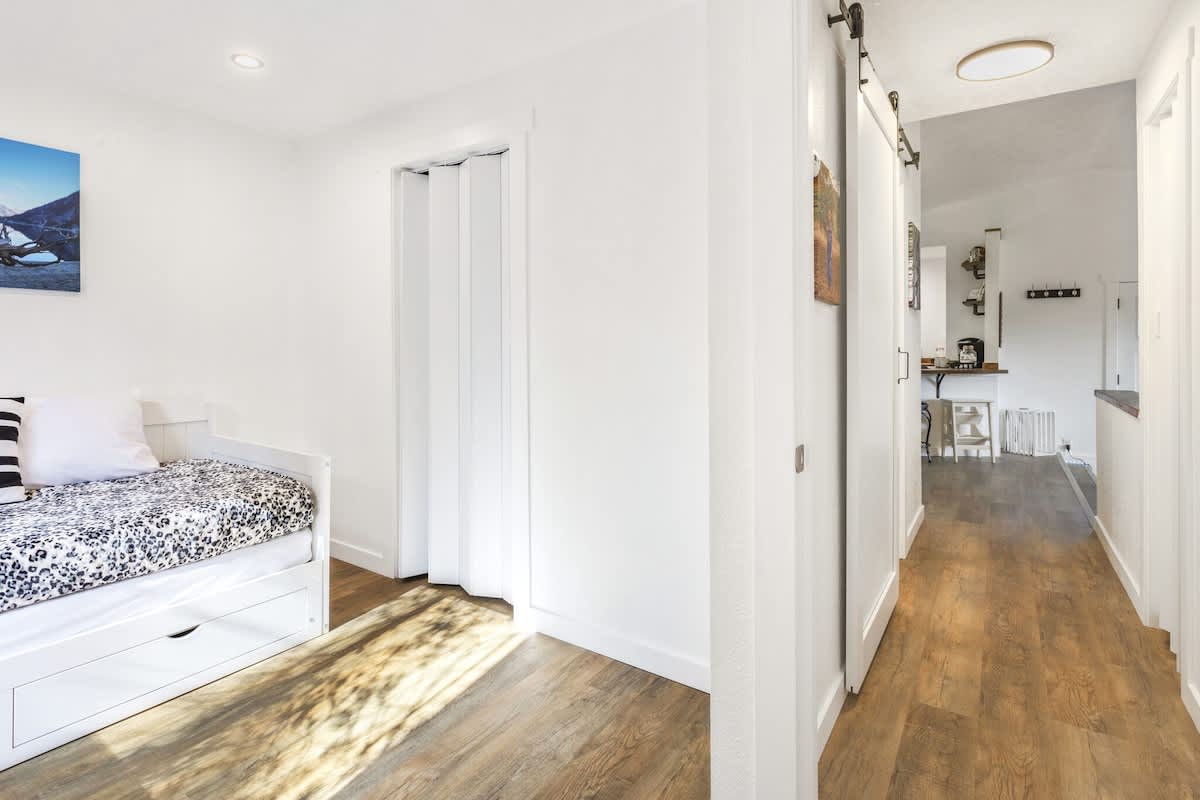 Down the hall is the sliding door to the bathroom, complete with stall shower. Past this are two charming bedrooms to put down your head and let your troubles fade away. One bedroom features a queen-sized bed, the second a queen-sized trundle bed.