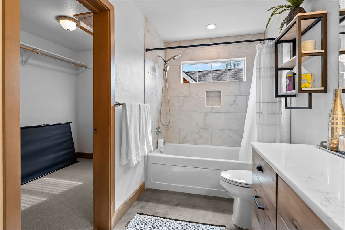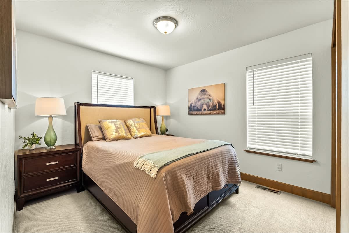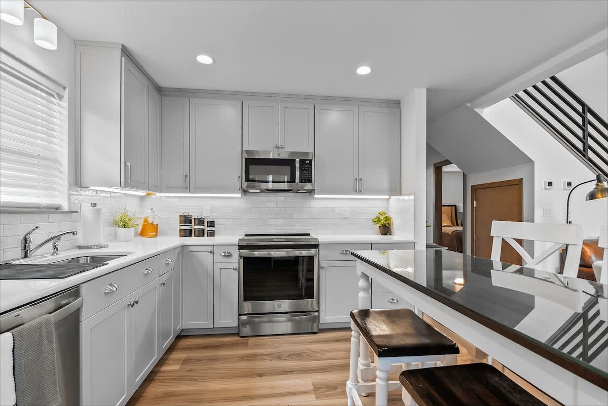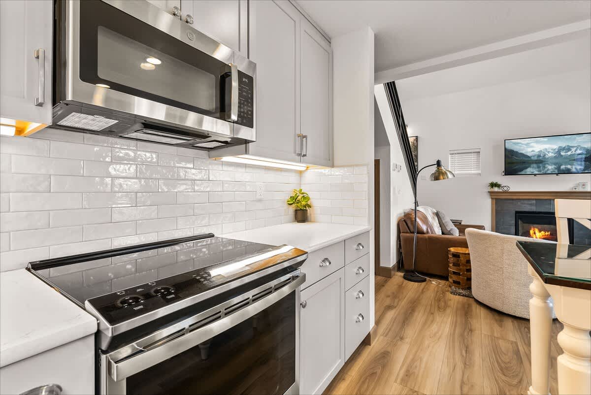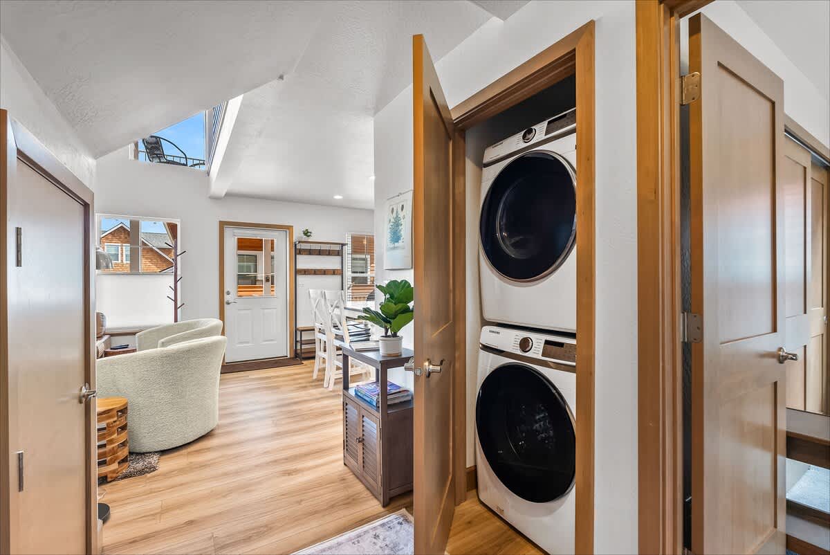 The kitchen is fully equipped with everything you need, including a dishwasher, microwave, oven, and all the pots and pans to cook up a delicious dinner. For your convenience, there's also a washer and dryer in the laundry room.
