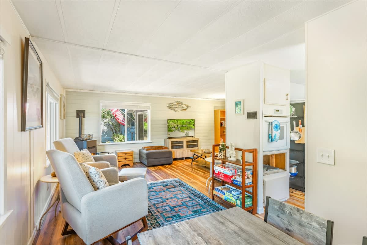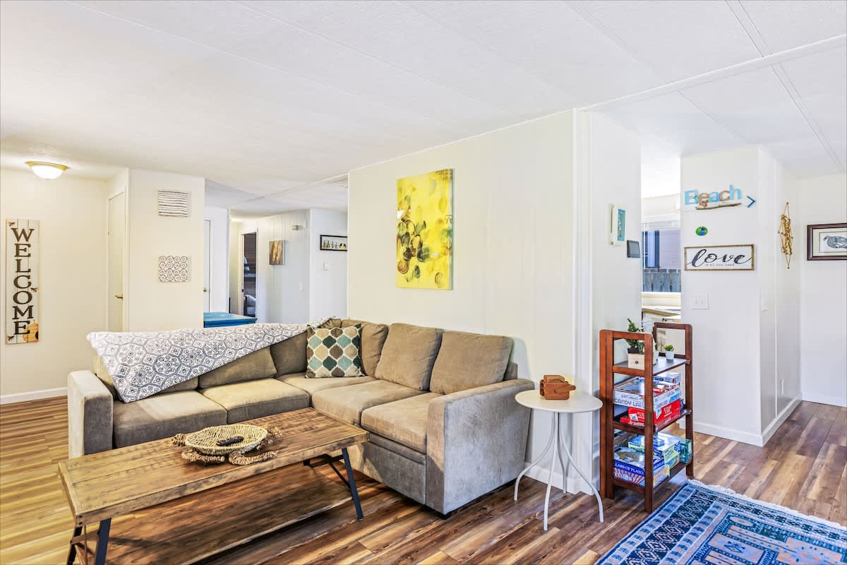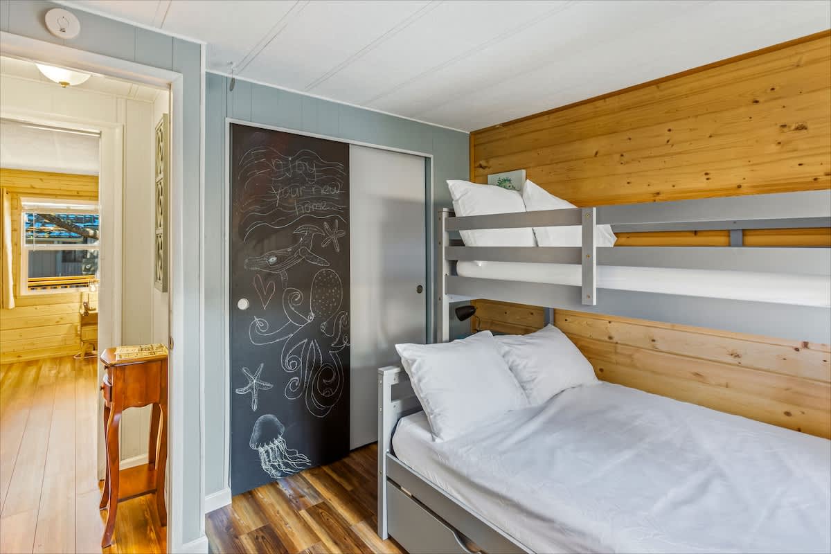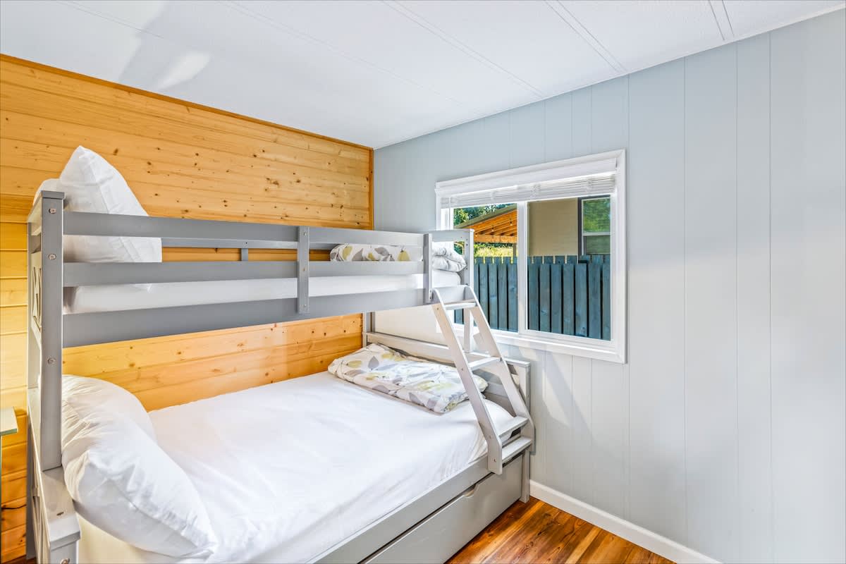 With 1,392 sq. ft. of living space, the home features two cozy bedrooms and two full bathrooms, including a private master suite for added comfort. In one bedroom, you'll find a queen-size bed, smart television and ensuite bathroom. The second bedroom features a twin over full bunk bed, plus a twin size trundle bed the kids will love! Of course, plush linens are provided for your stay.
