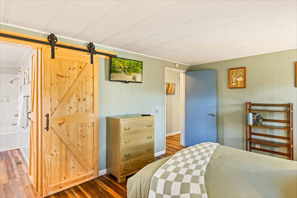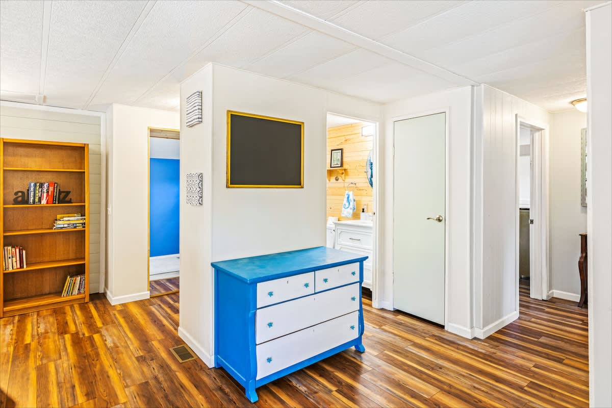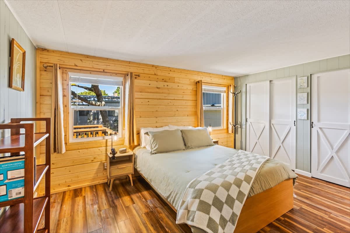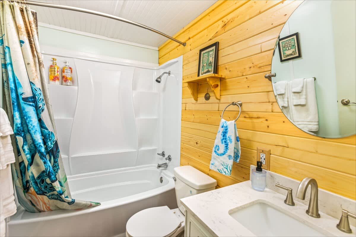 With 1,392 sq. ft. of living space, the home features two cozy bedrooms and two full bathrooms, including a private master suite for added comfort. In one bedroom, you'll find a queen-size bed, smart television and ensuite bathroom. The second bedroom features a twin over full bunk bed, plus a twin size trundle bed the kids will love! Of course, plush linens are provided for your stay.