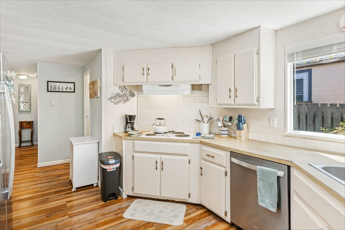 You’ll find modern updates throughout: luxury vinyl plank flooring, new vinyl windows that let in plenty of natural light, a warm and efficient pellet stove in the living room, and a fully equipped kitchen with newer appliances, including a refrigerator and dishwasher, and plenty of pots, pans and dinner ware.