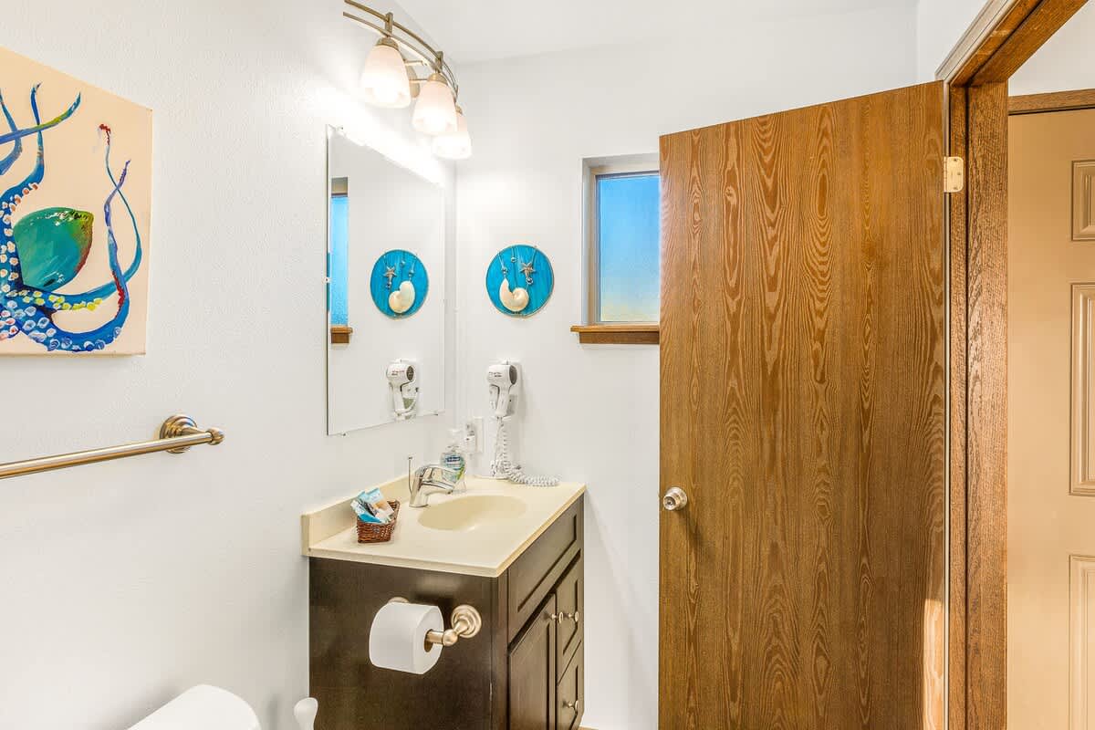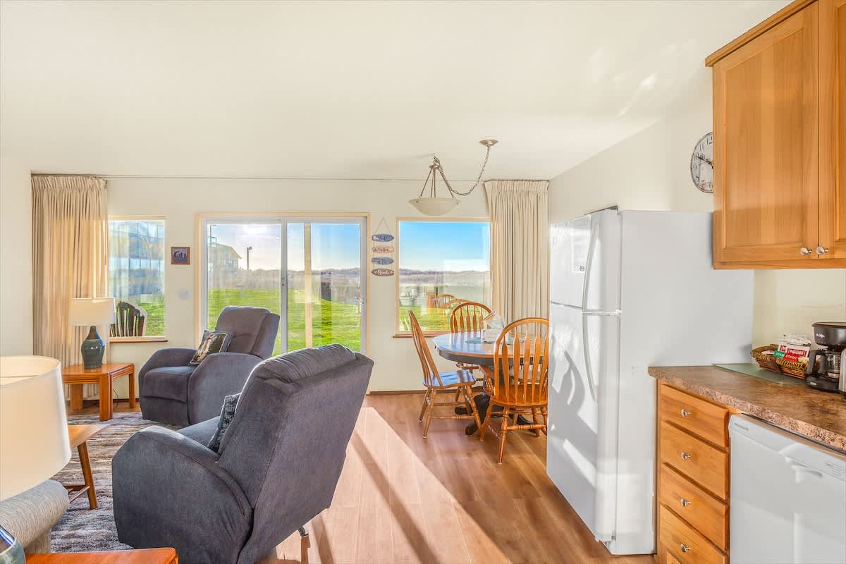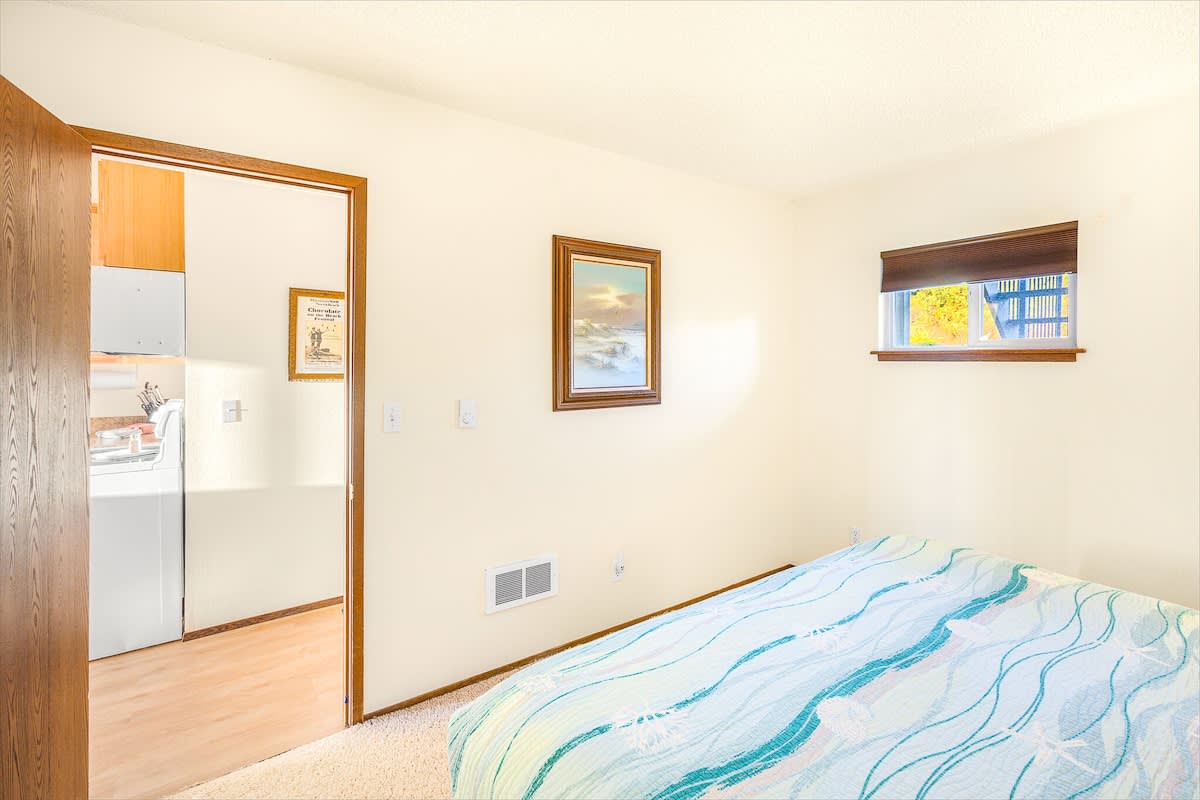 The charming living area features a couch, coffee table and two overstuffed leather recliners, all centered around a new 43" SMART TV with DVD player and a cozy, electric fireplace. From here, you can take in the tremendous view of the Pacific Ocean, the dunes, and the seabirds that flit about them. In good weather, you can adjourn to the private deck to smell the sea air. Dogs are welcome with our standard per dog, per night fee.