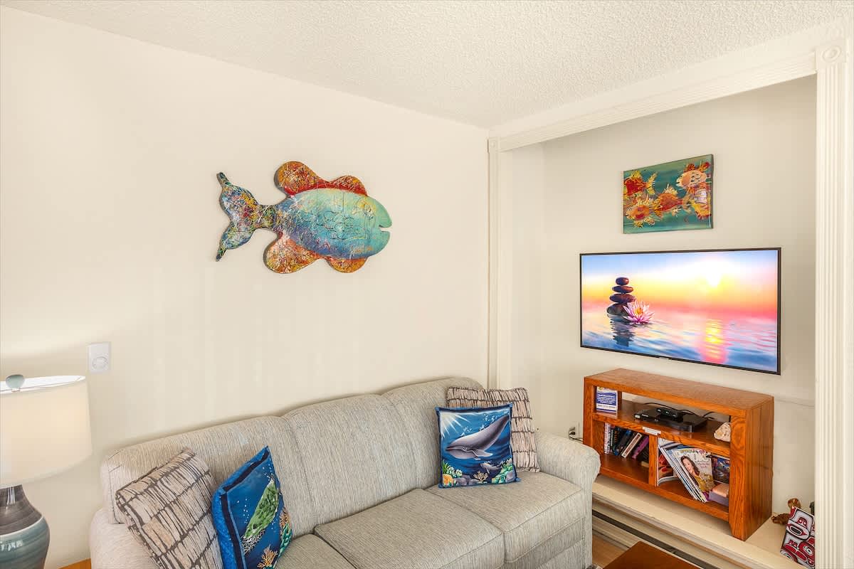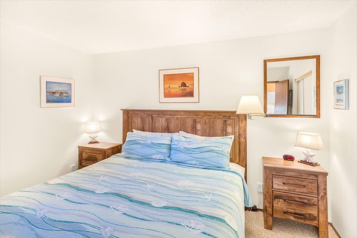 The bedroom features a high-quality king bed to help you wind down at the end of your day. Two more guests will find linens to make a comfortable bed on the sleeper sofa in the living area. A full kitchen is stocked with pots, pans, flatware and everything you need to cook your own meals before enjoying them at the adjacent dining area.