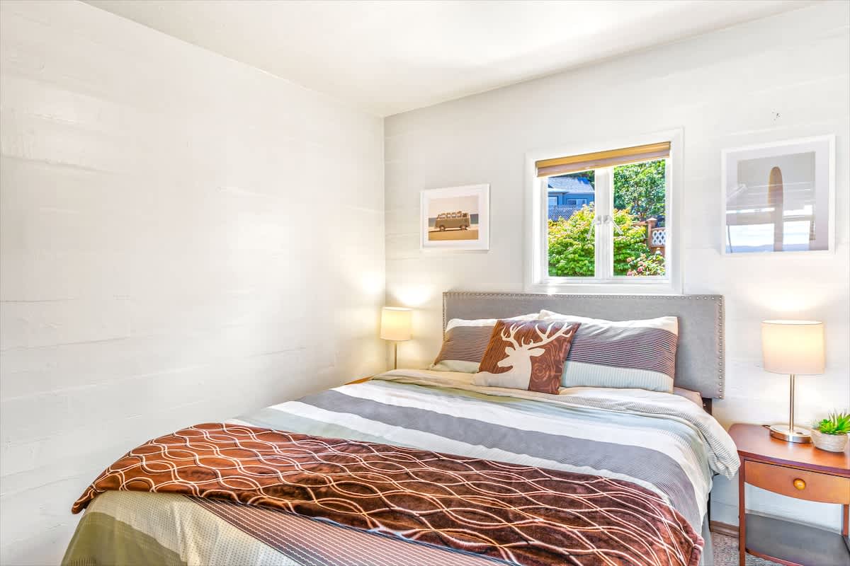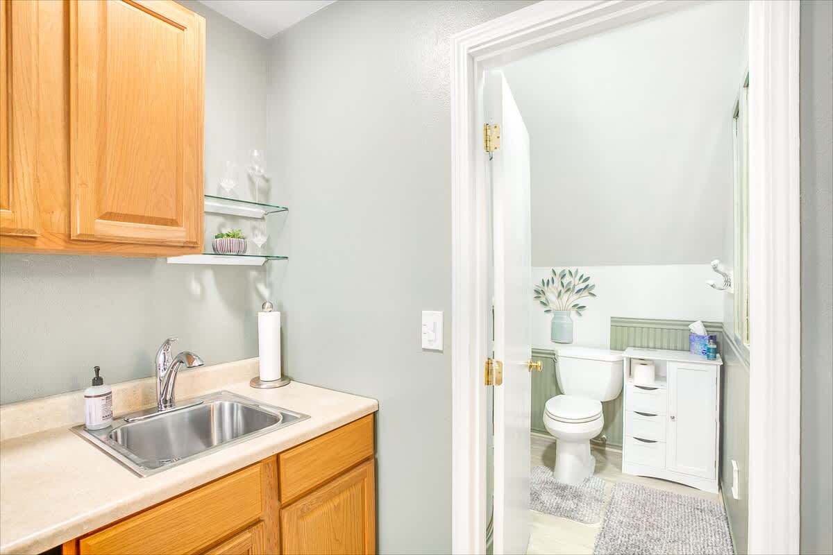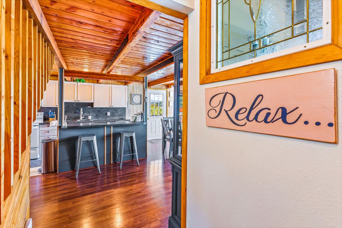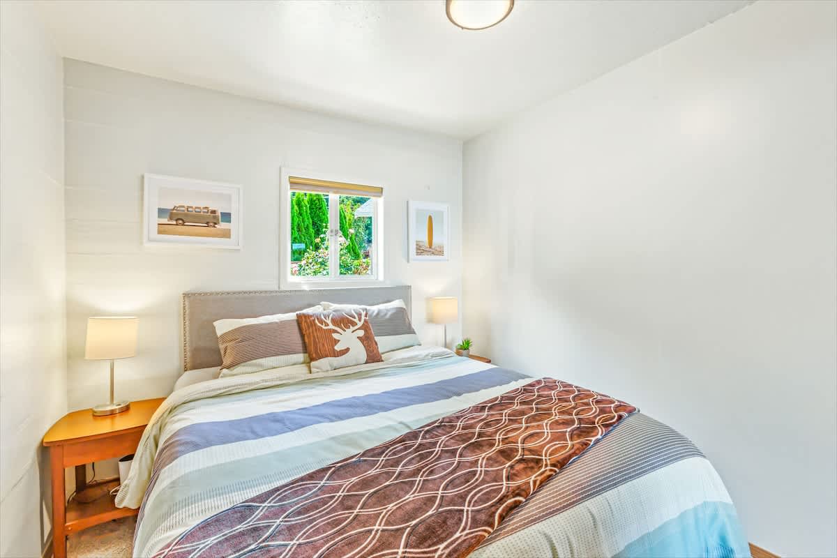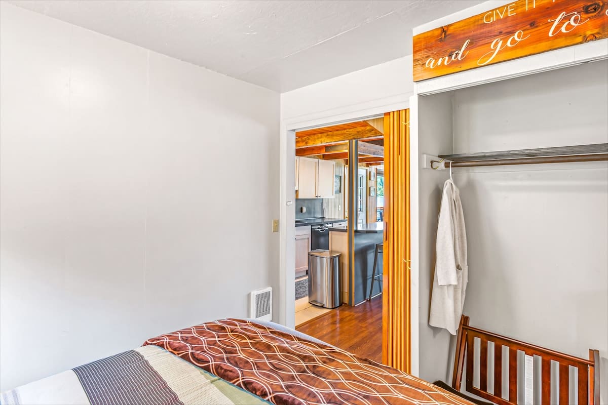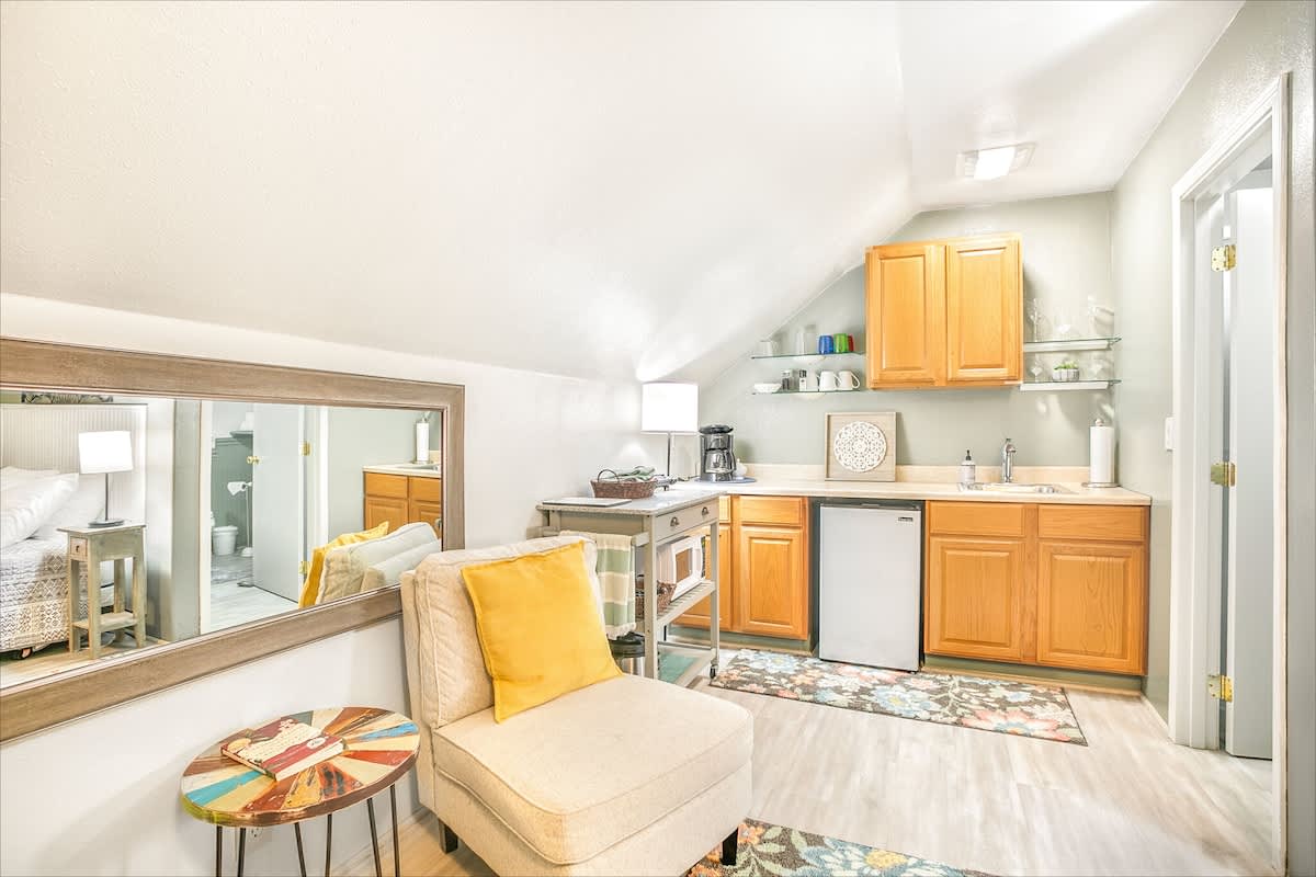 The main house offers three beautifully appointed bedrooms and two full bathrooms, plus a private apartment above the garage with a queen bed, kitchenette, and bathroom, perfect for guests seeking privacy or extra space.