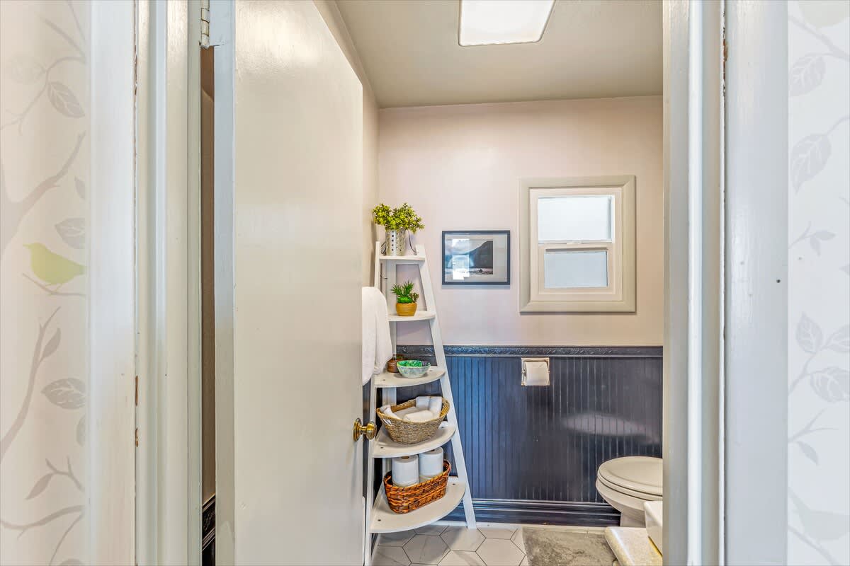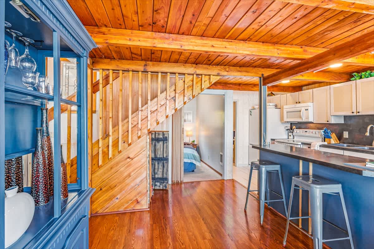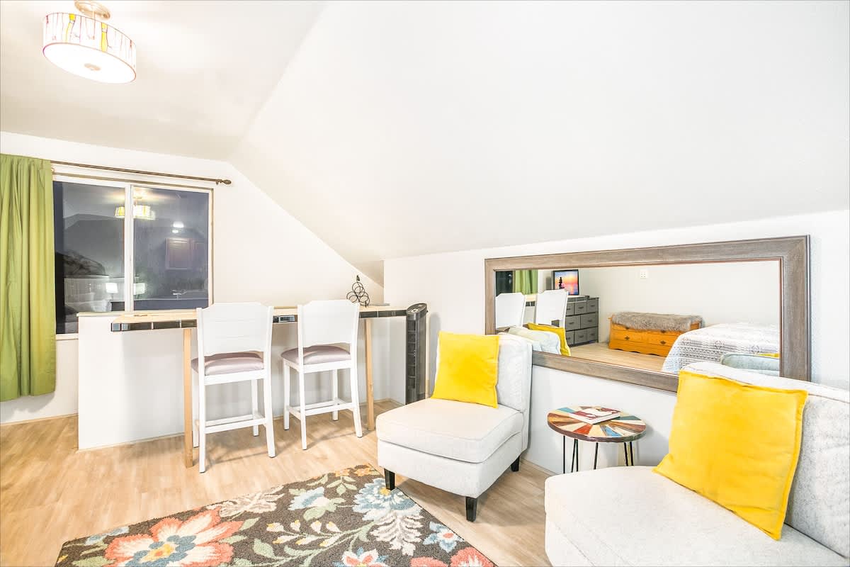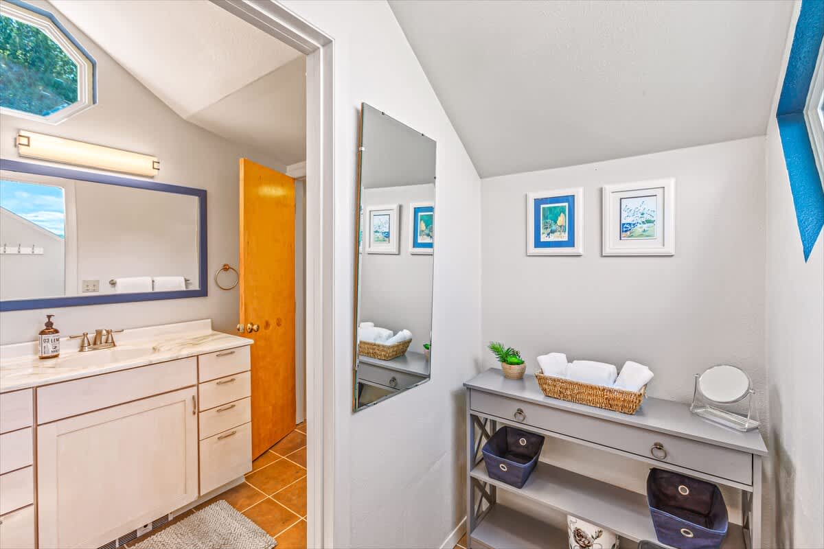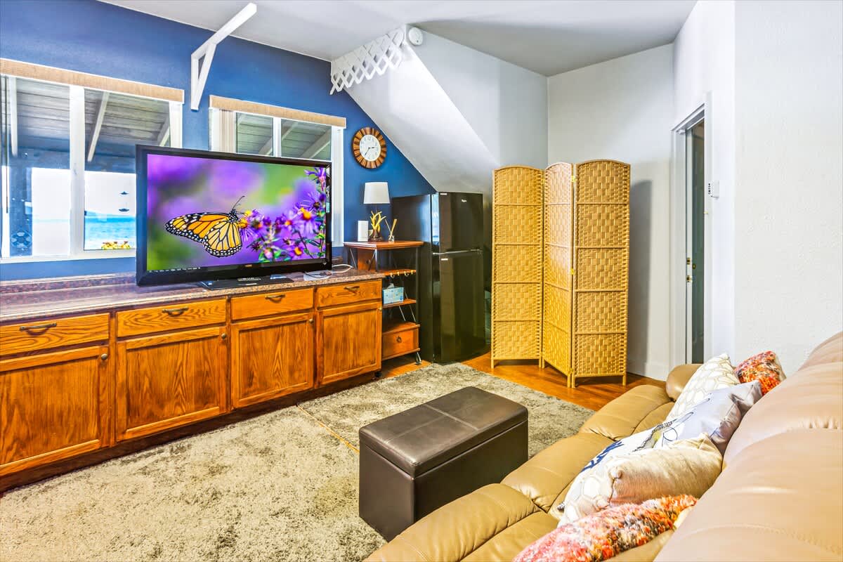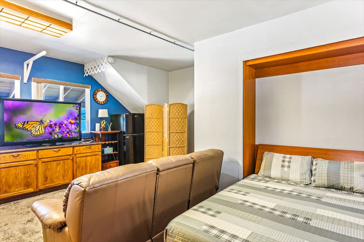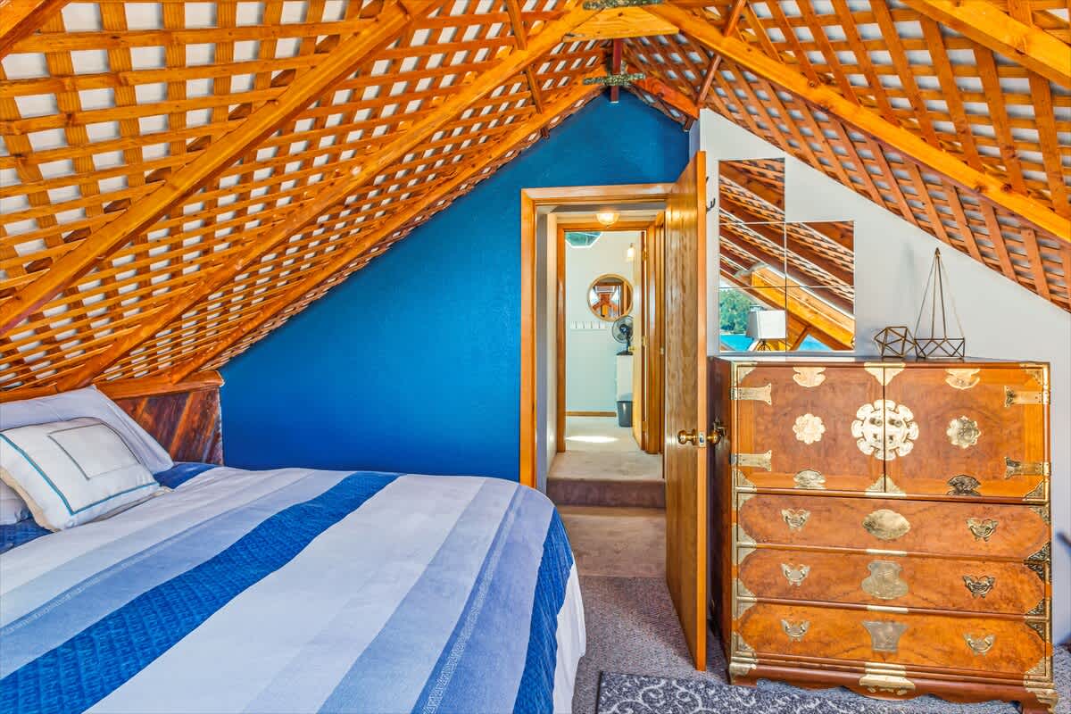 The main house offers three beautifully appointed bedrooms and two full bathrooms, plus a private apartment above the garage with a queen bed, kitchenette, and bathroom, perfect for guests seeking privacy or extra space.