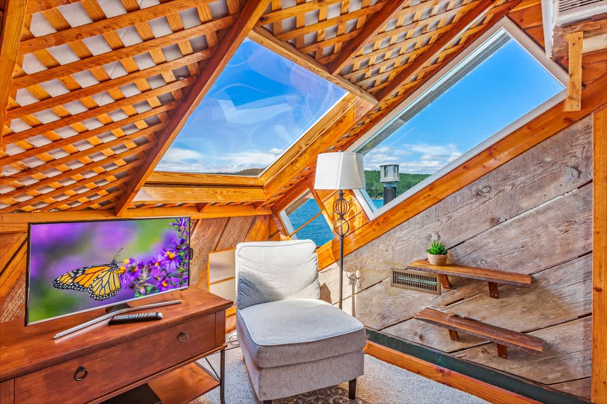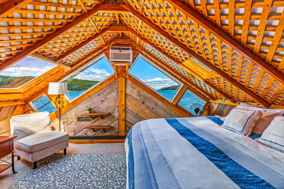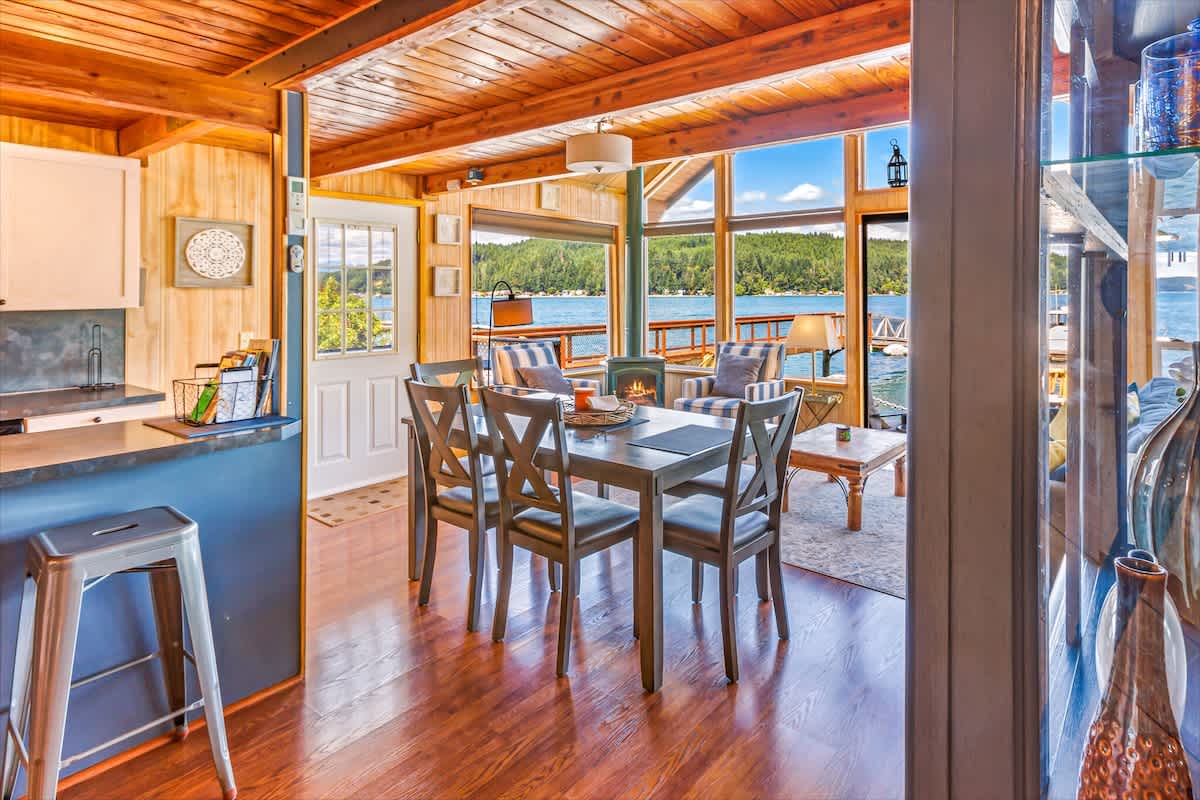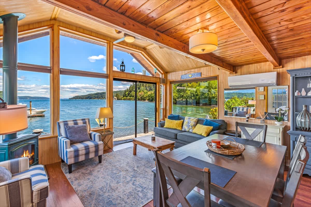 The kitchen is fully equipped with all appliances, cookware, and dinnerware you’ll need for easy home-cooked meals. The living room, with its propane fireplace and large windows, creates a warm and inviting space with breathtaking views of Hood Canal and the Olympic Mountains.