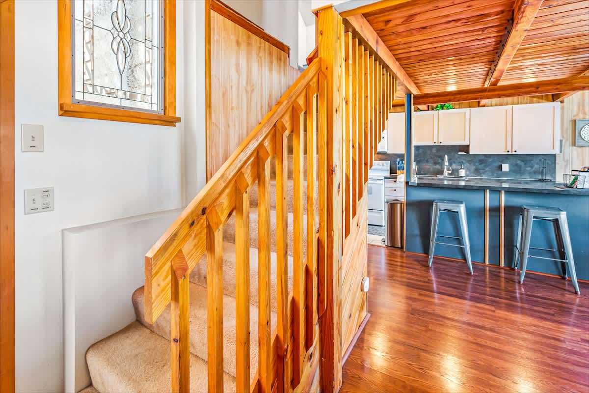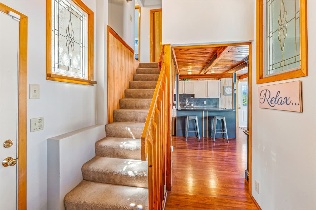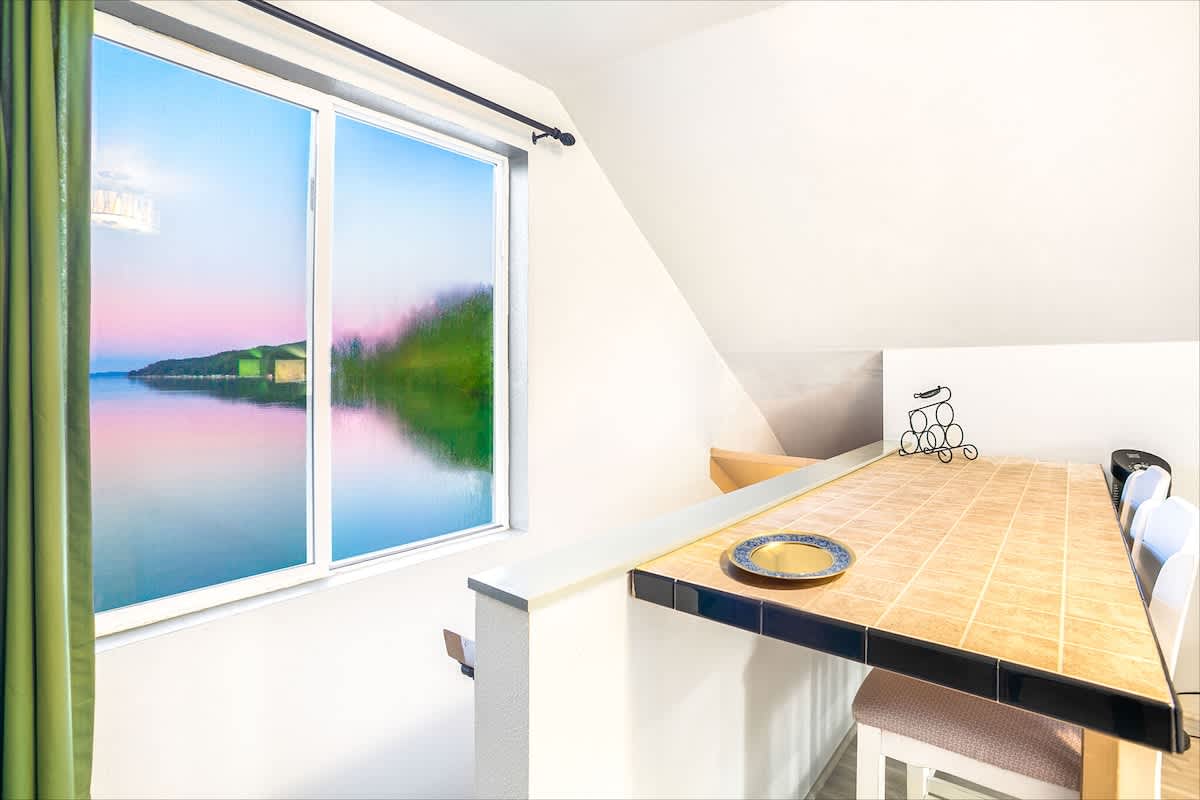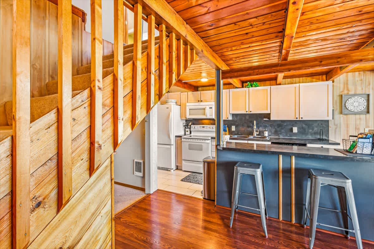 The kitchen is fully equipped with all appliances, cookware, and dinnerware you’ll need for easy home-cooked meals. The living room, with its propane fireplace and large windows, creates a warm and inviting space with breathtaking views of Hood Canal and the Olympic Mountains.
