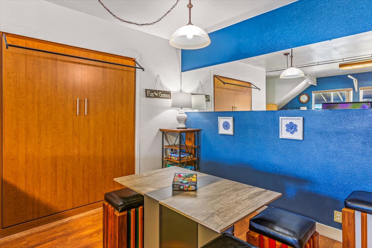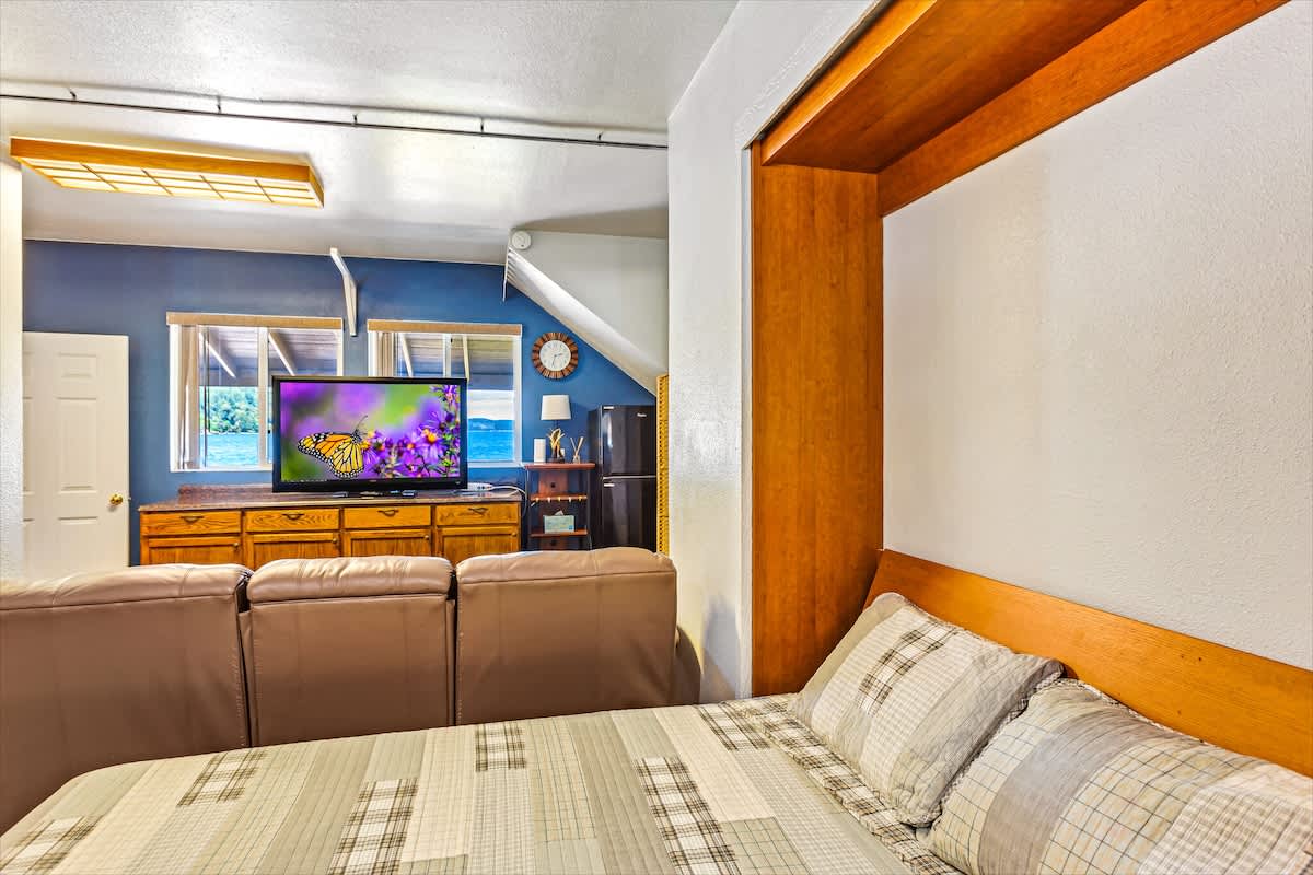 The primary suite features a king bed with stunning water views, while an upstairs bedroom and main-level bedroom each have a queen bed. The recreation room includes a built-in Murphy bed, ideal for families or larger groups.