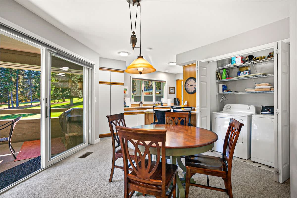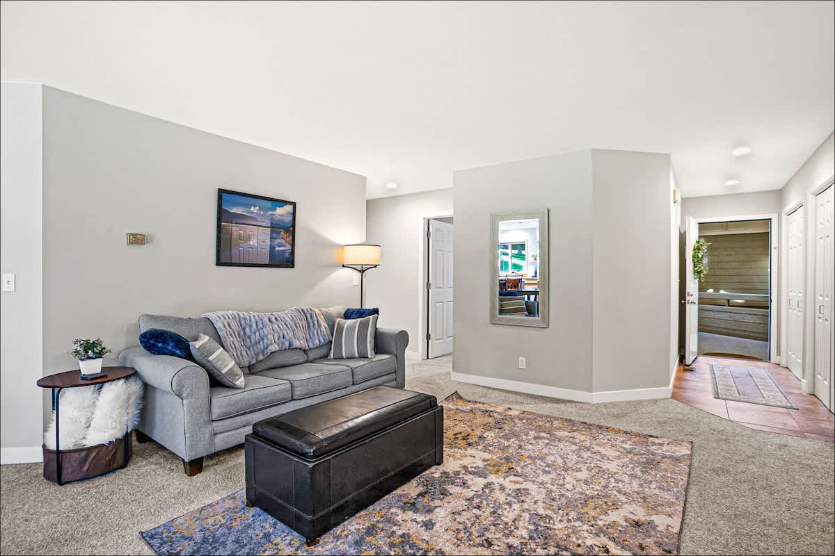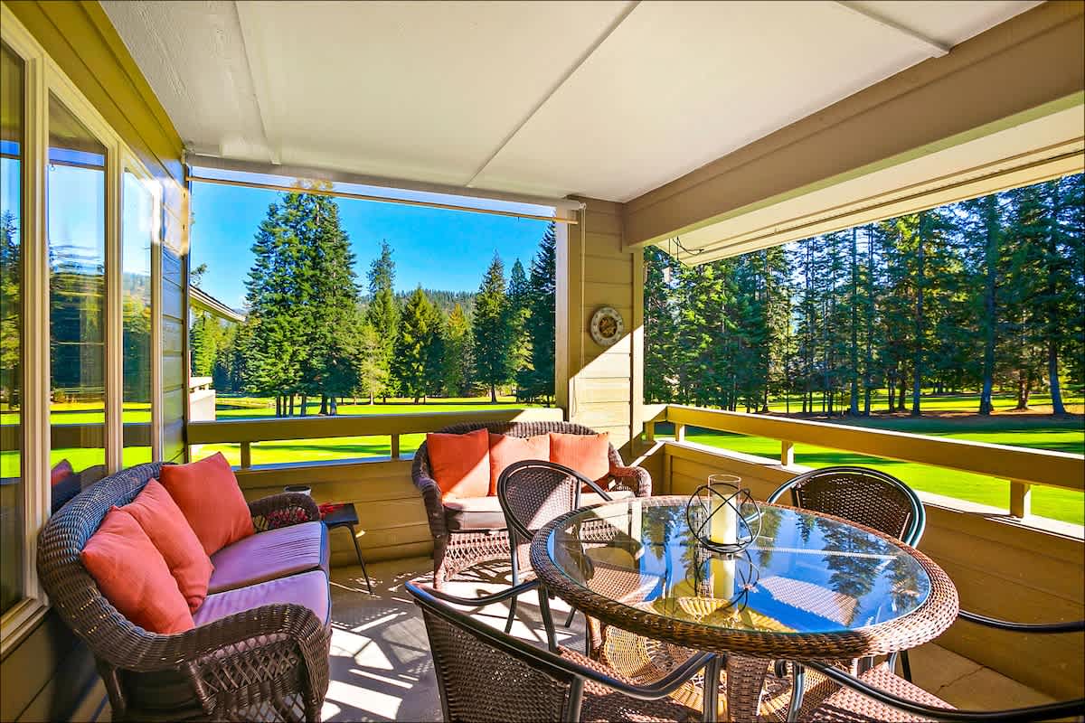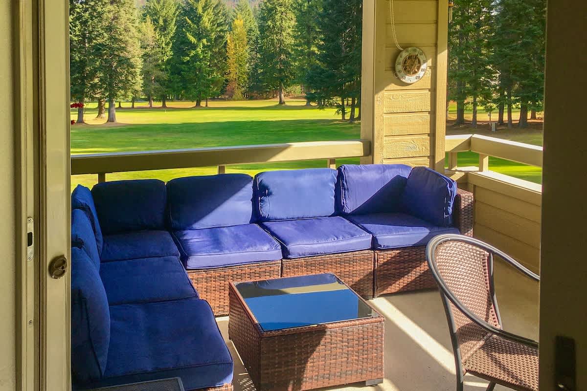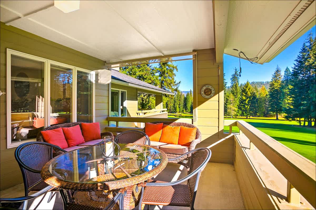 The living room is full of cozy furniture with an adjoining deck for enjoying the views. The deck has a comfortable patio set, perfect for sipping your morning coffee and enjoying the golf course view.