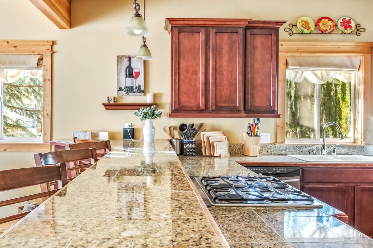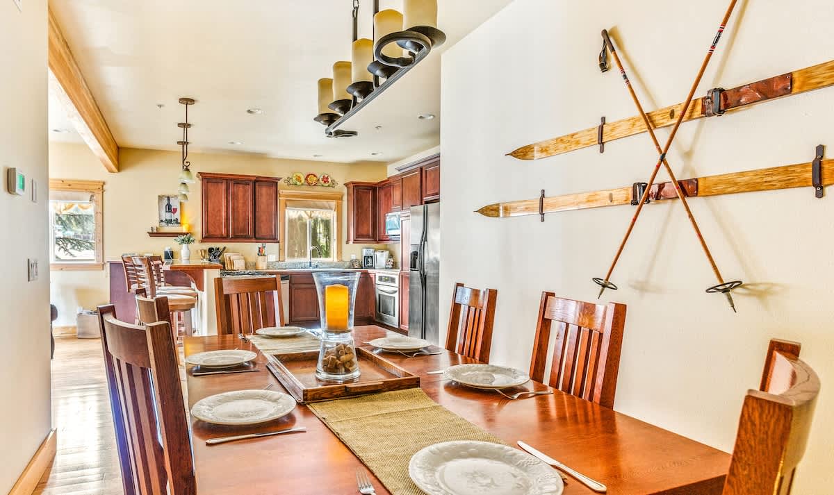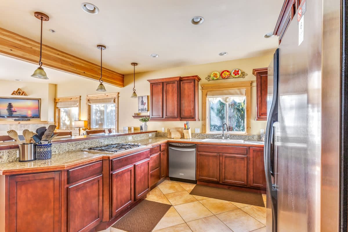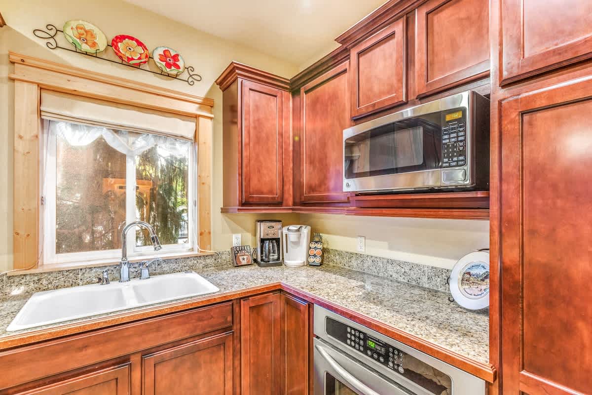 The kitchen of Harlin Haus is decked out in a deep beautiful brown cabinetry with newer appliances. Prepare your meals here or take a short stroll further into town where you'll find fine dining restaurants.