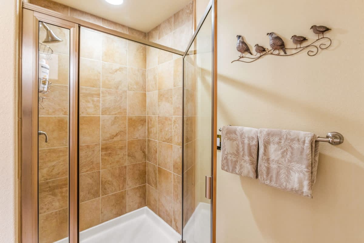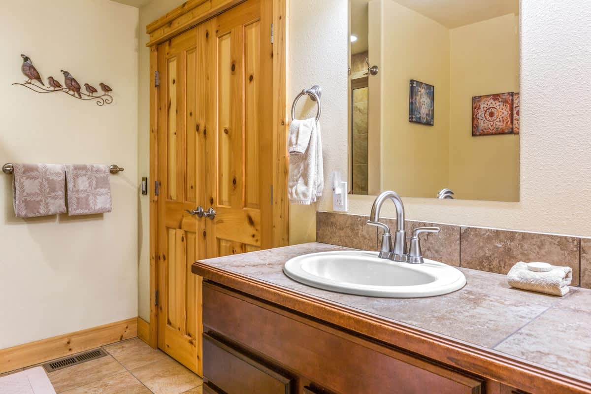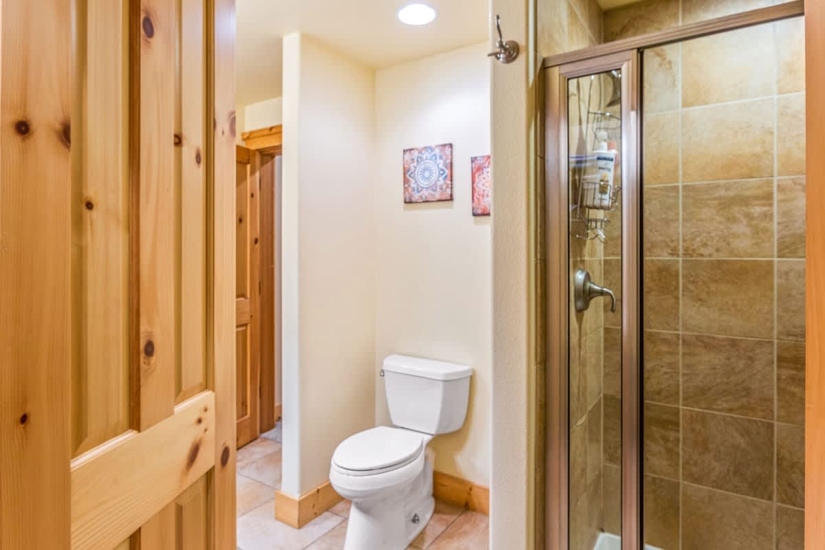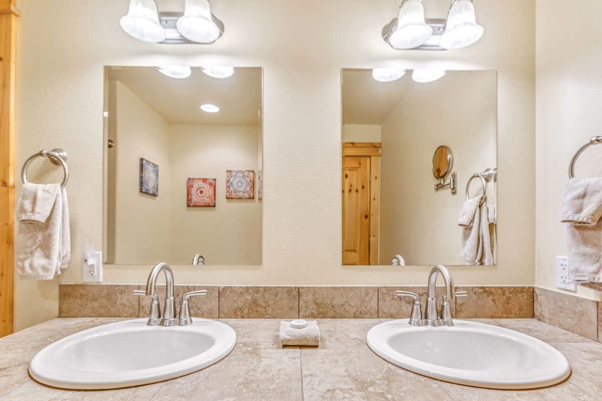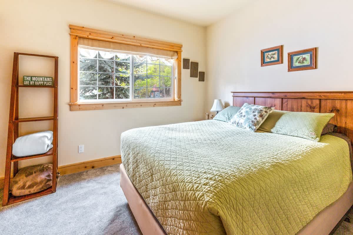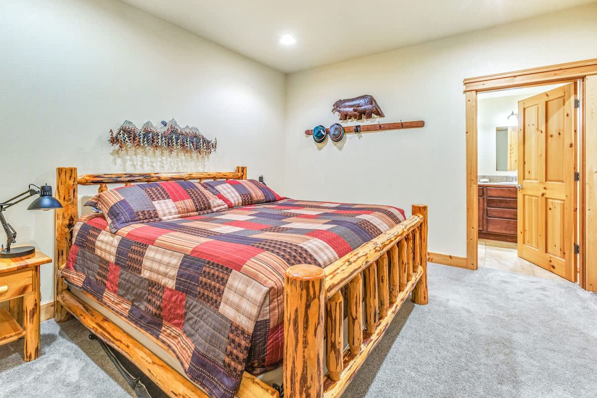 The master suite has a king sized log-made bed with a private bathroom. The second bedroom holds a comfortable queen sized bed for your accompanying guests. We allow up to 6 total people, but you'll have to throw the other two on the couches in the living room.