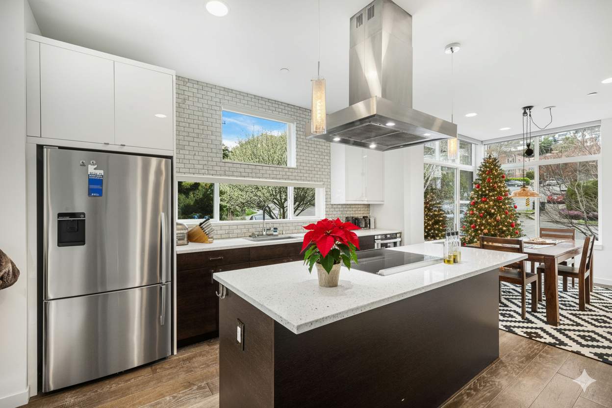 This exceptionally designed corner unit offers a blend of comfort, luxury, and style, featuring floor-to-ceiling windows that fill the space with natural light. The entry level boasts a designer kitchen, an open living area, and a floating staircase with glass walls. Upstairs, you'll find two spacious bedrooms, including a master suite with a private bath. The large private rooftop deck with a gas hookup is perfect for entertaining with views of downtown Seattle. Downstairs, enjoy a den that opens to a covered patio, along with a full-size laundry area and additional bathroom. The rare underground private garage includes extra storage for your convenience.
