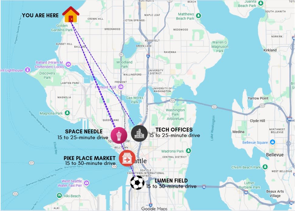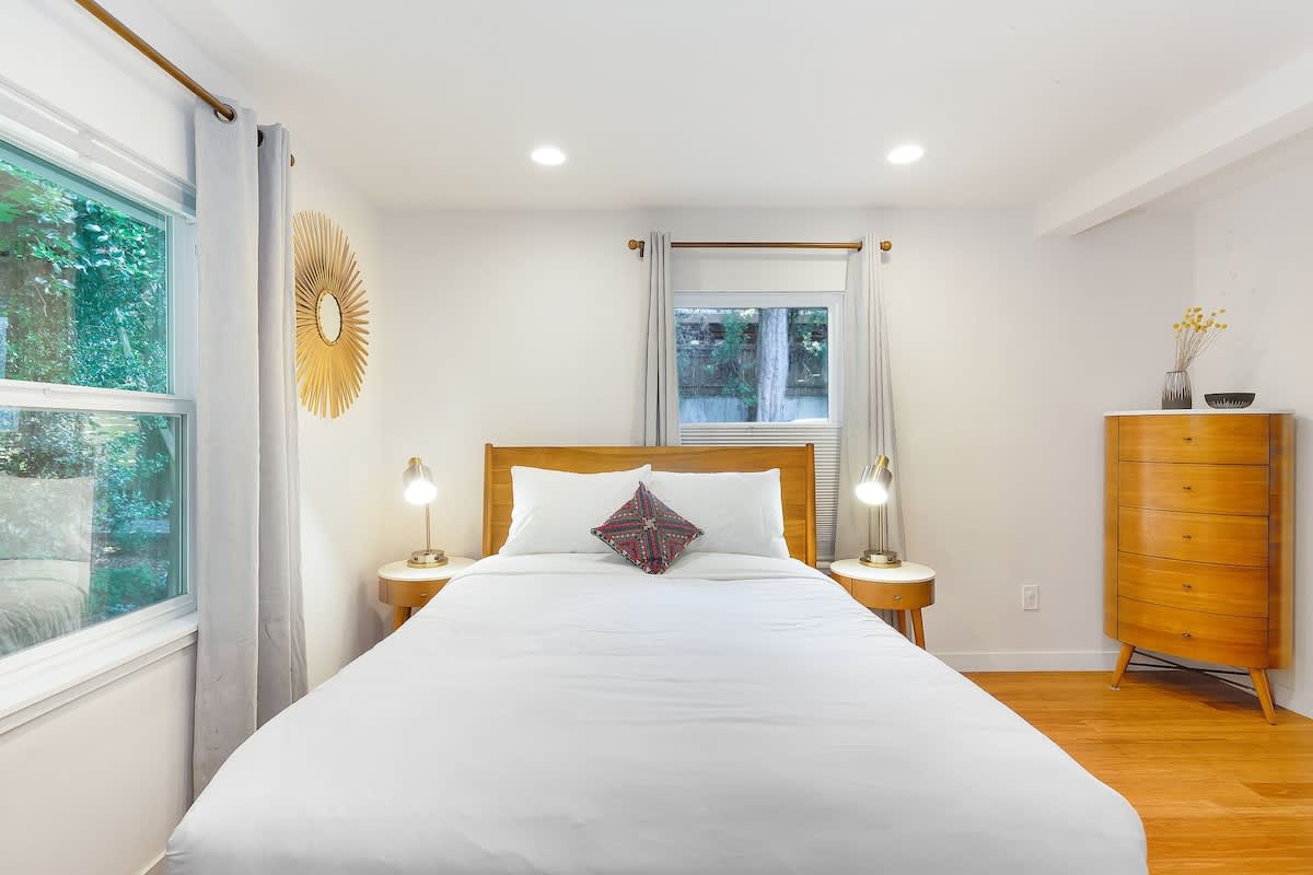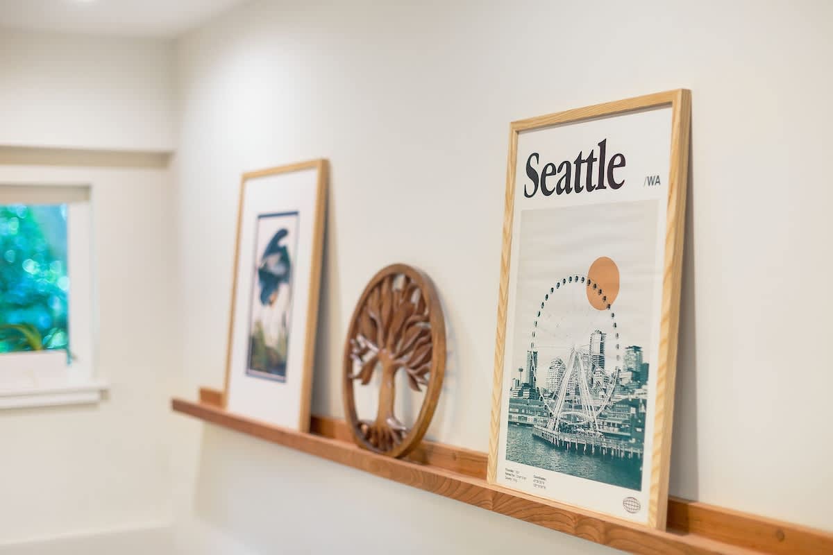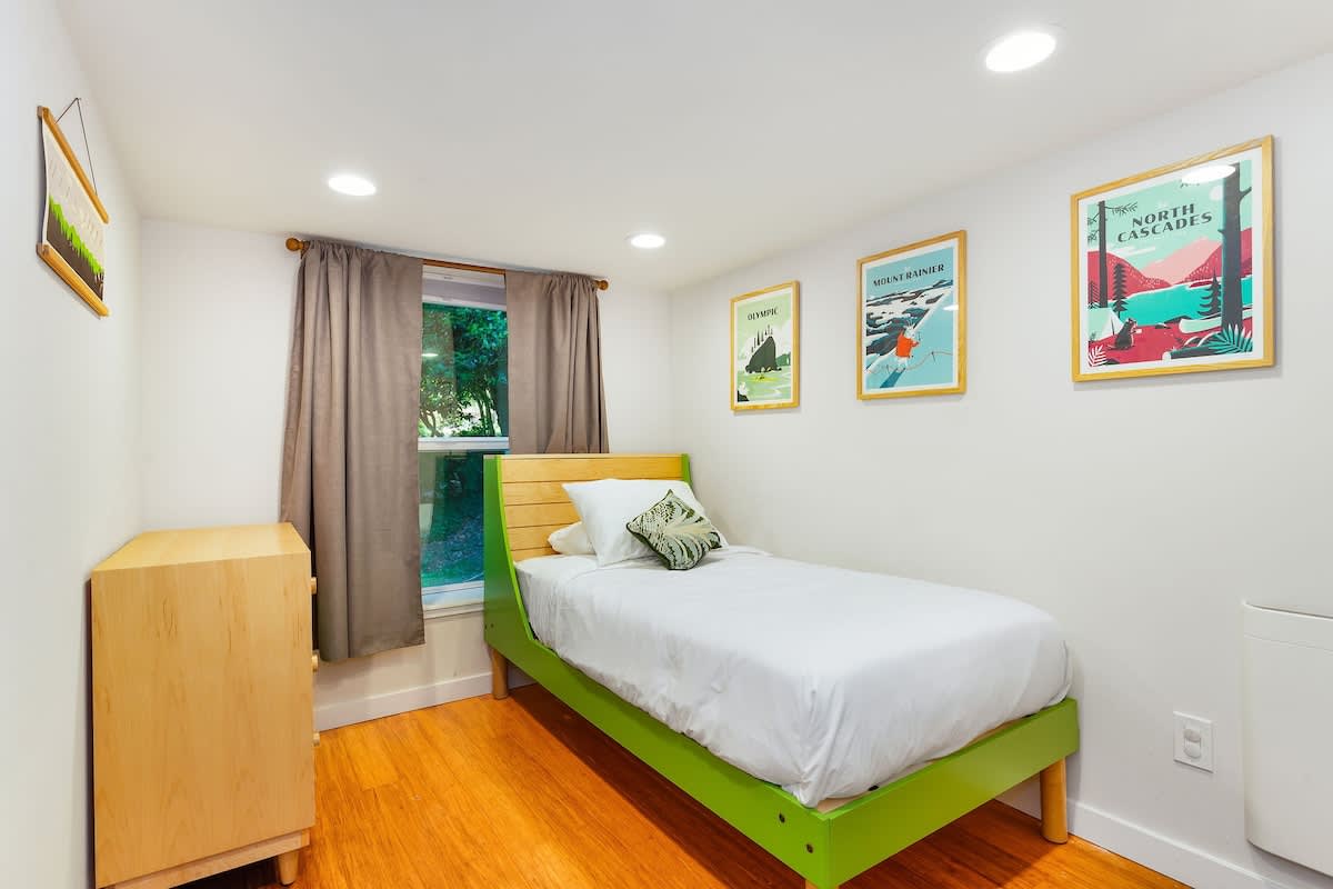 Tucked into a wooded lot near Golden Gardens, this stylish North Beach home offers comfort, character, and room to breathe. With a spacious yard, cozy fire pit, and whimsical treehouse, it’s a favorite for families and longer stays.