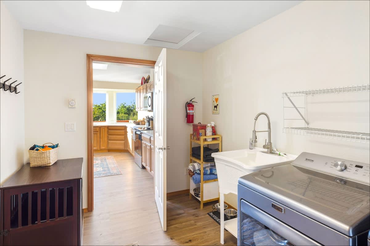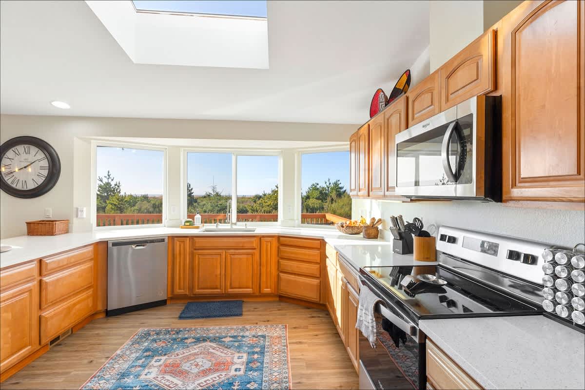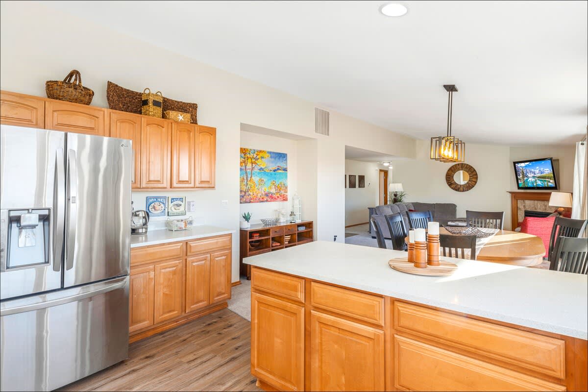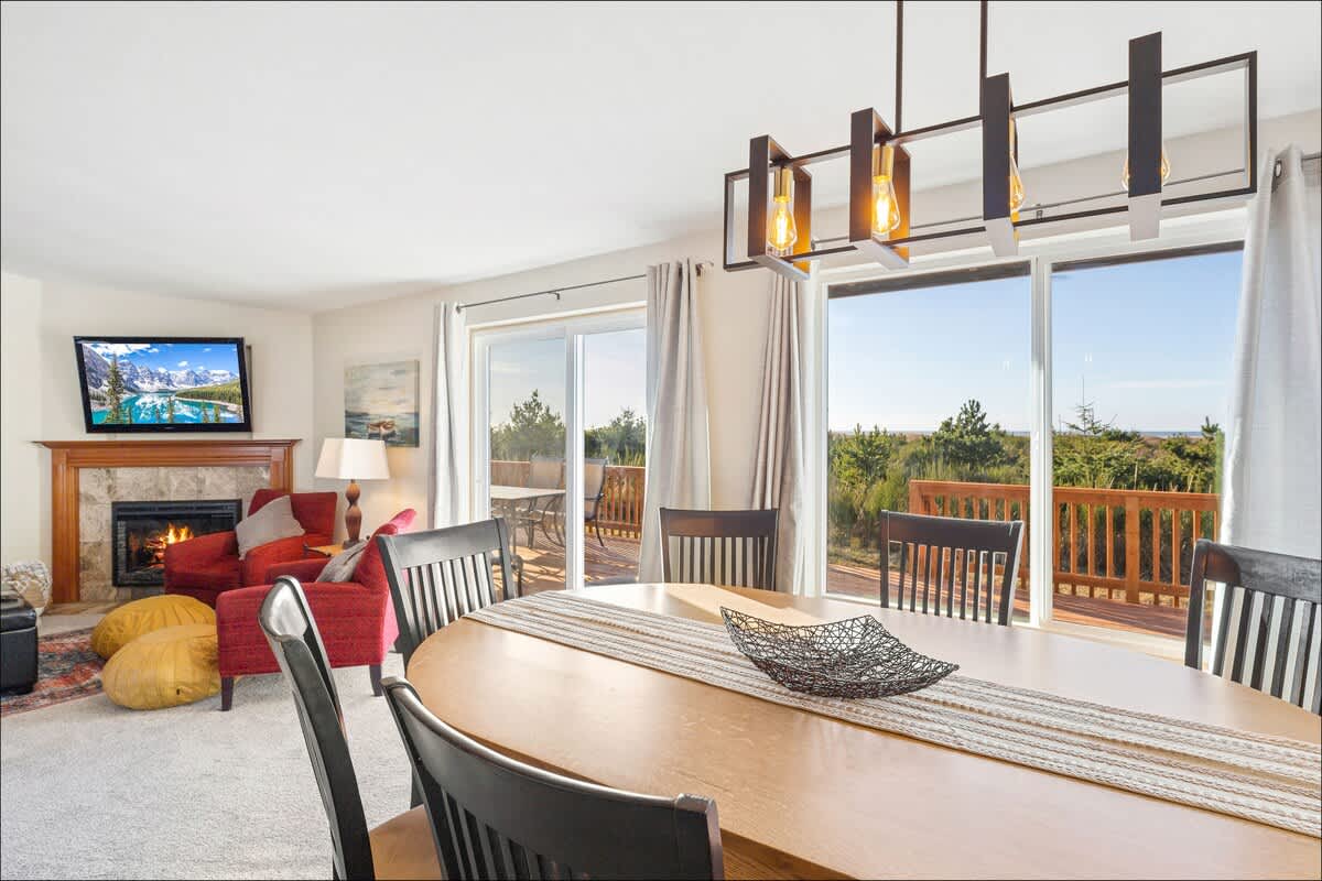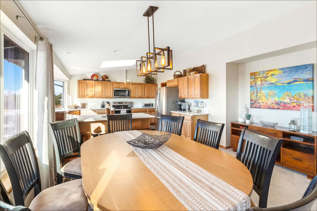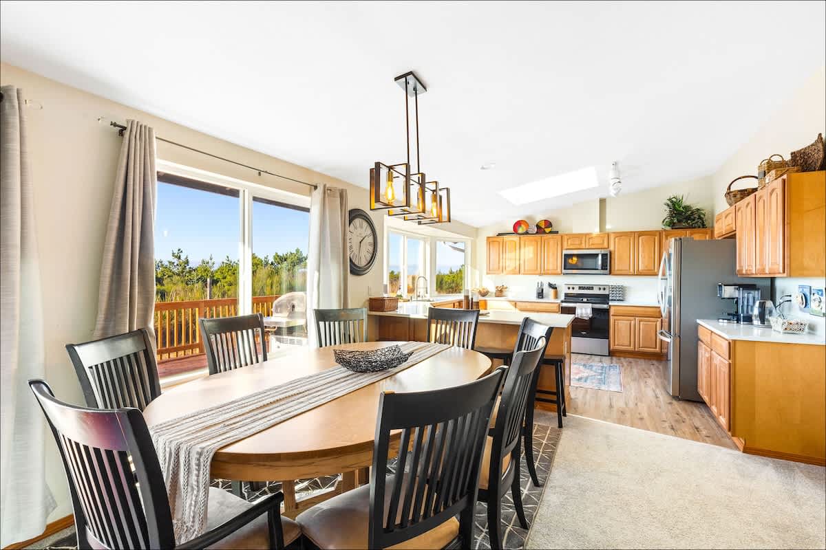 The updated kitchen has all the appliances you'll need - including a gourmet coffee maker, an air fryer and toaster oven. Plenty of pots, pans, dinnerware and even baking ware are here for you, as well. In addition to the dining area, with room to seat eight, there's a kitchen bar to handle a few more. It's also