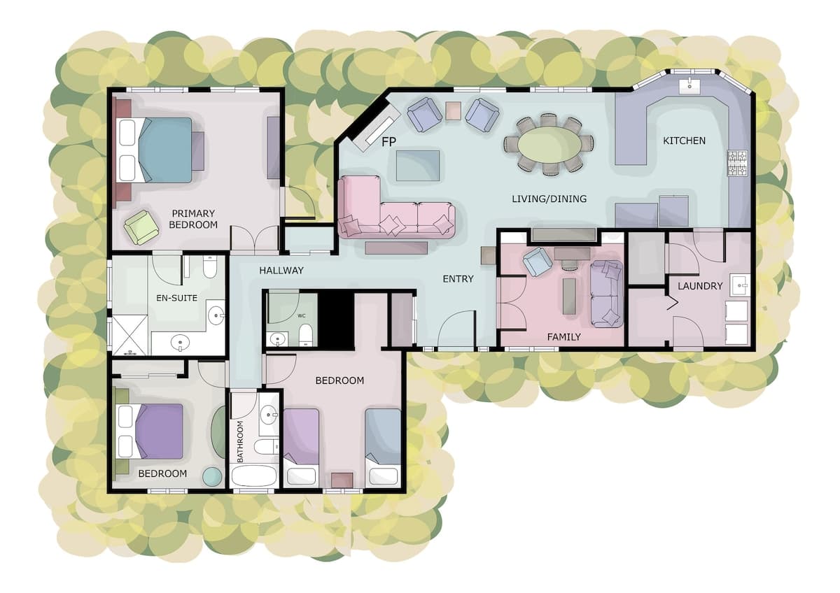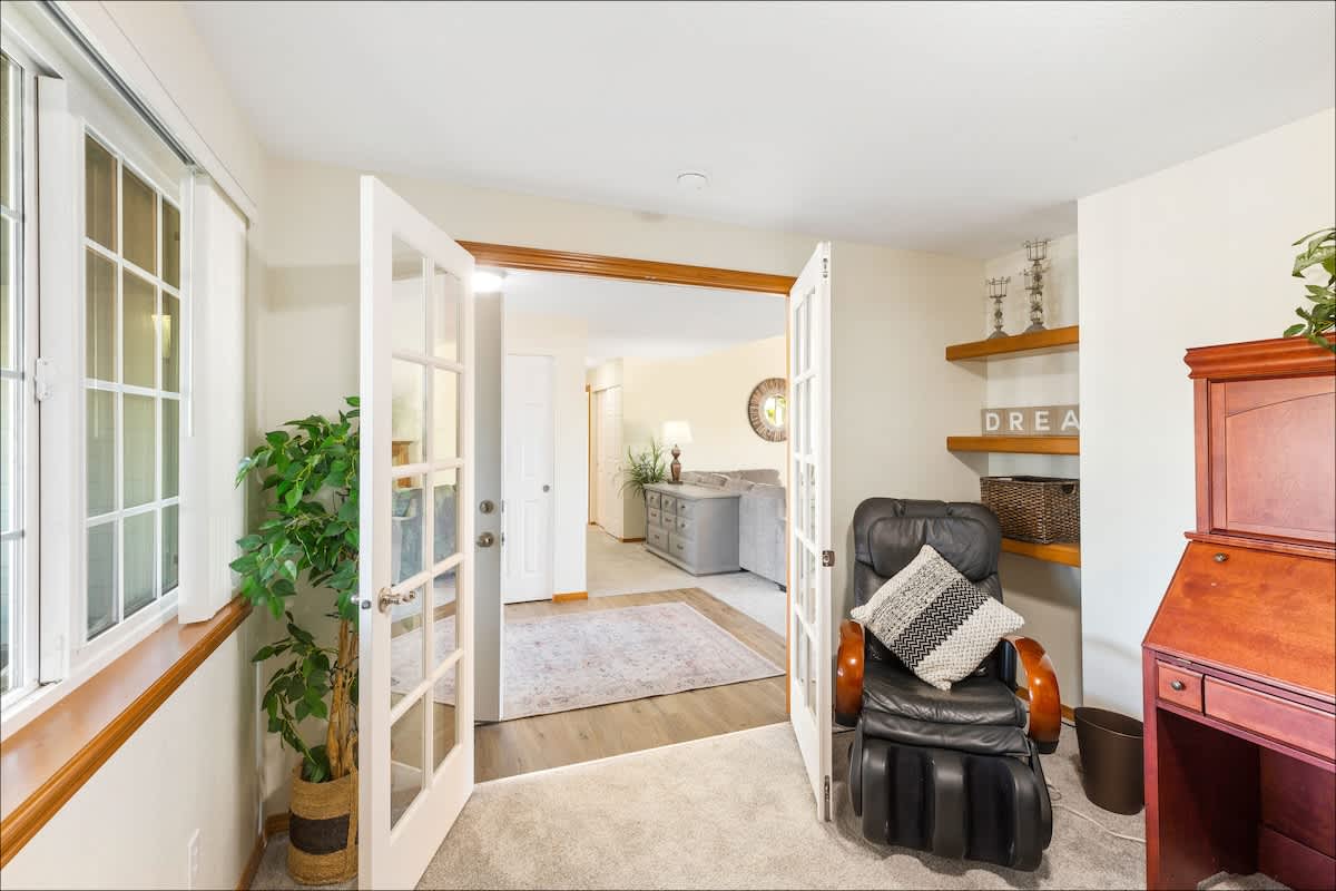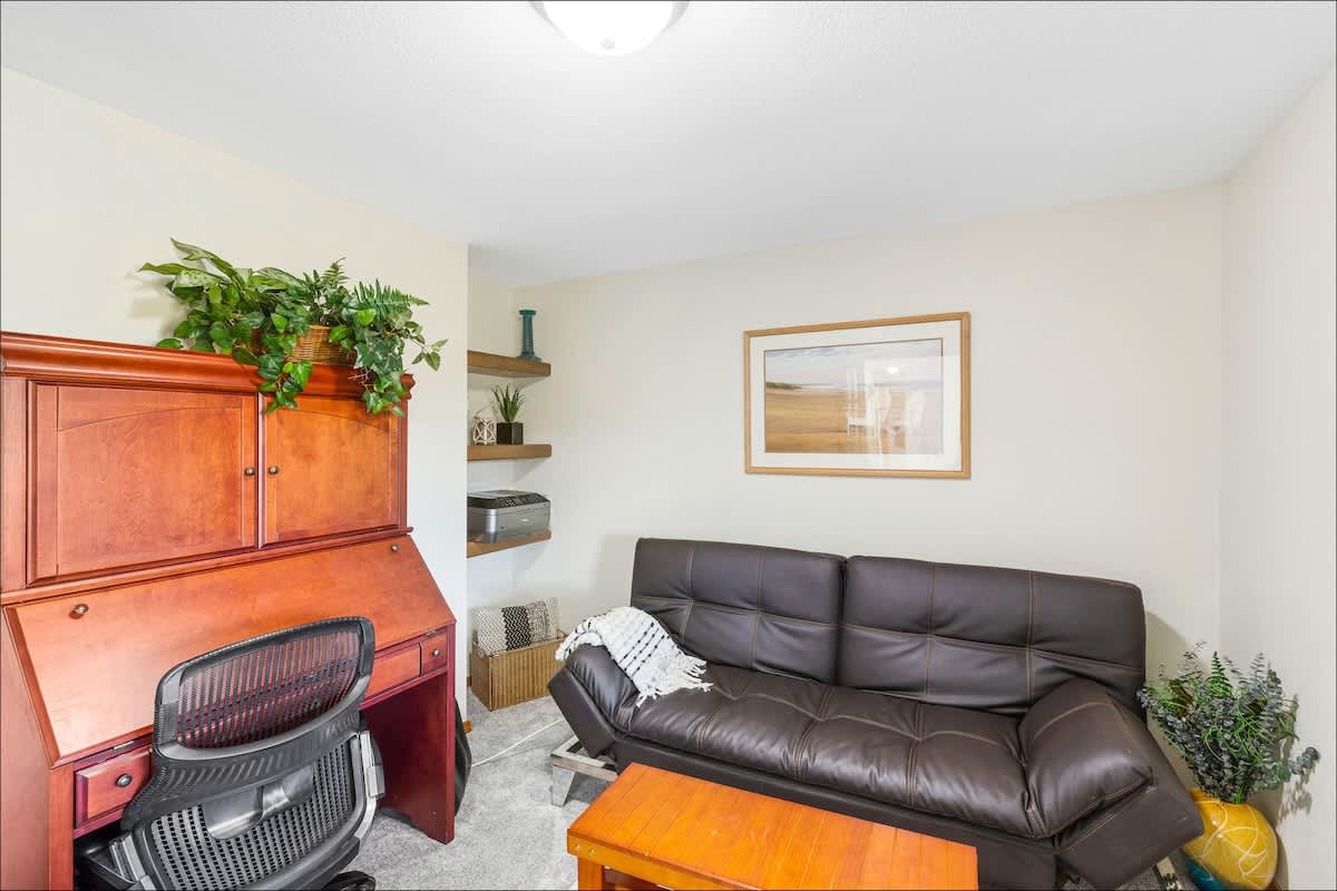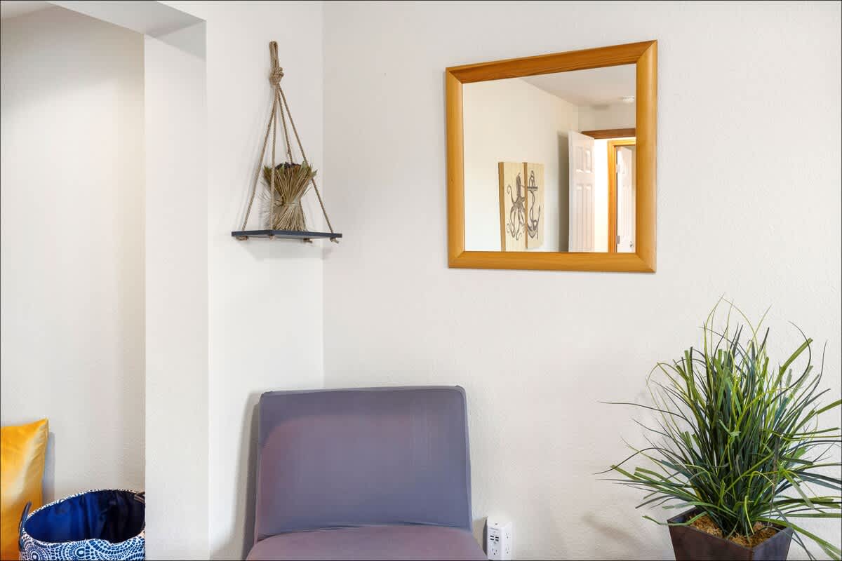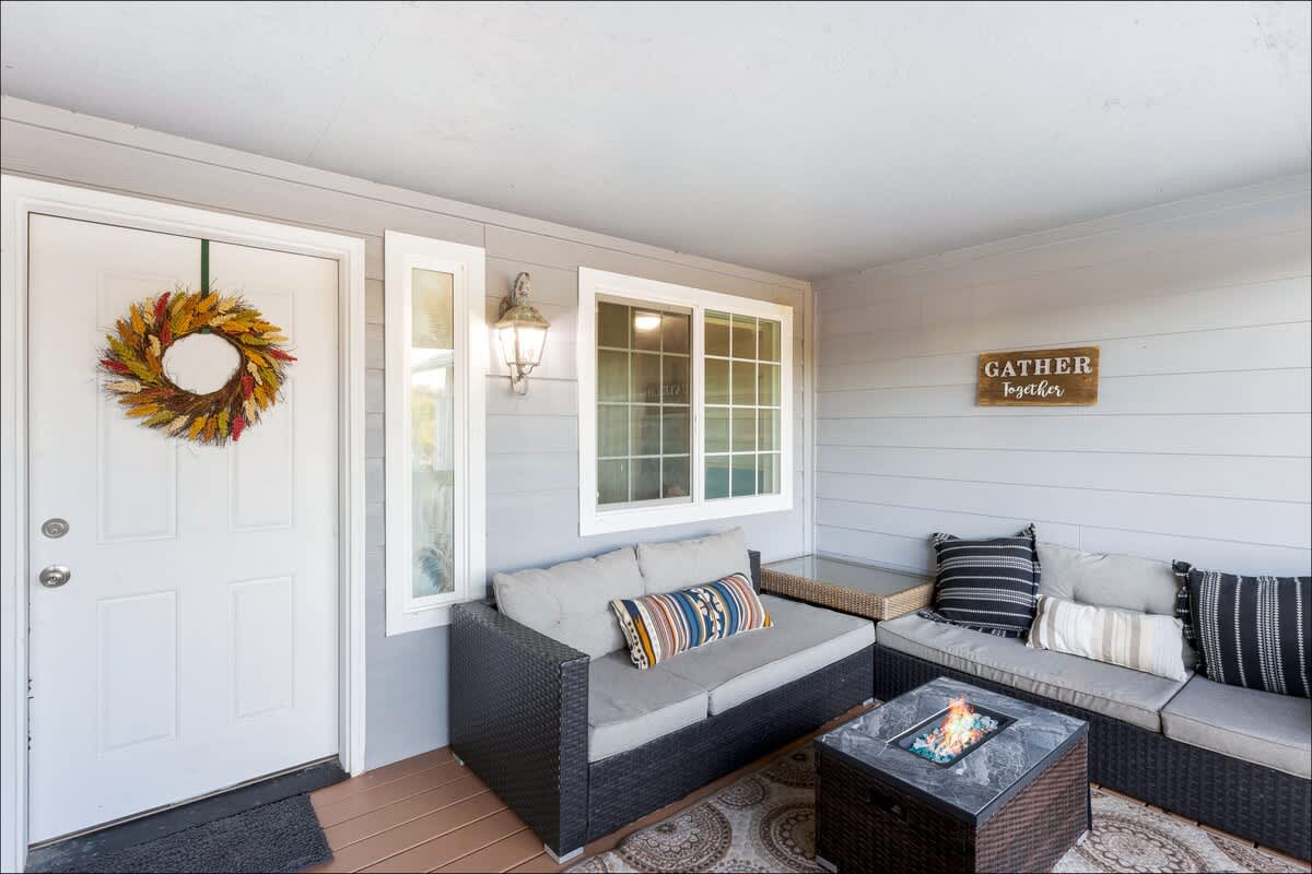 The updated kitchen has all the appliances you'll need - including a gourmet coffee maker, an air fryer and toaster oven. Plenty of pots, pans, dinnerware and even baking ware are here for you, as well. In addition to the dining area, with room to seat eight, there's a kitchen bar to handle a few more. It's also