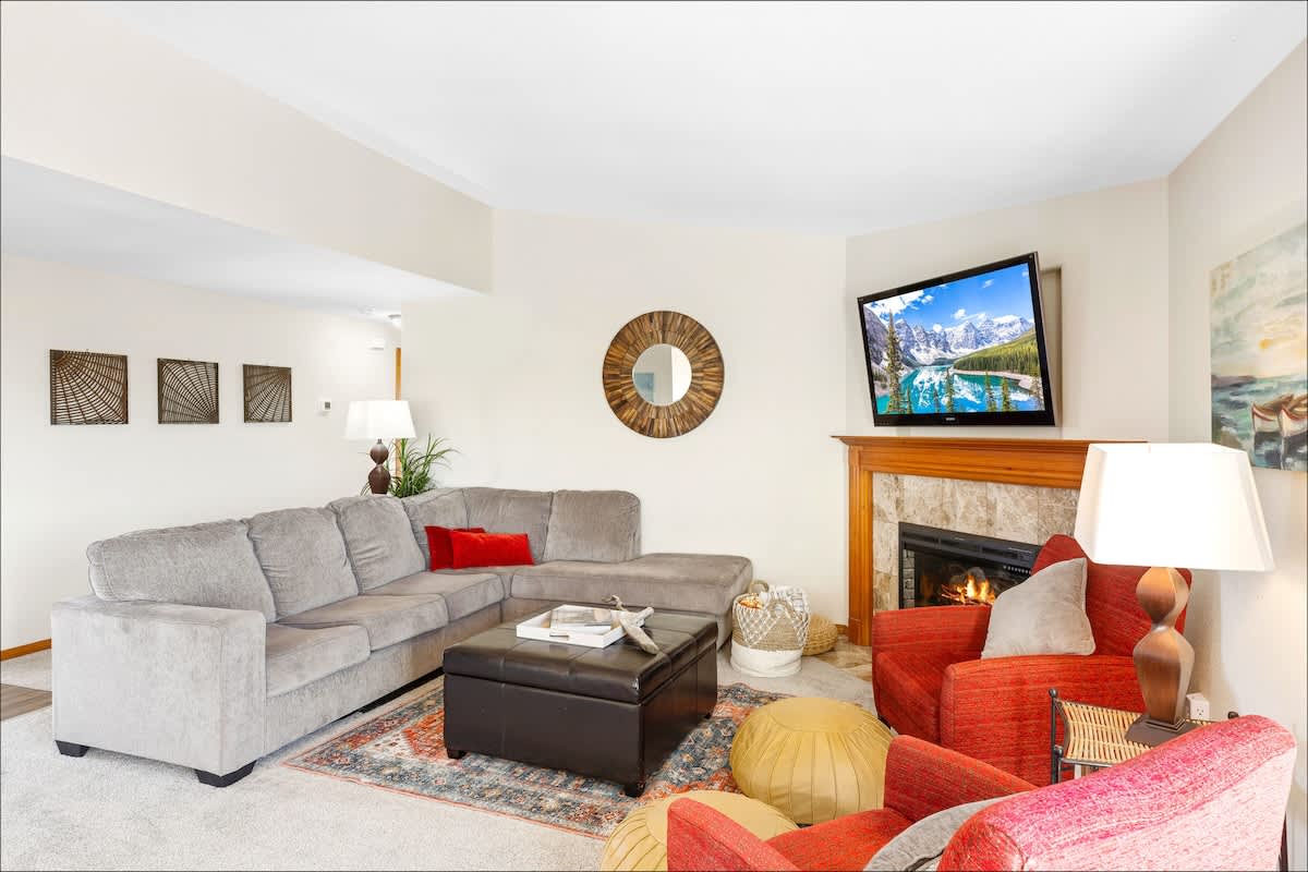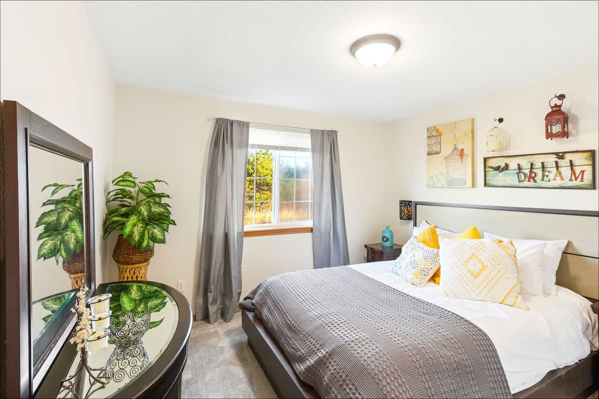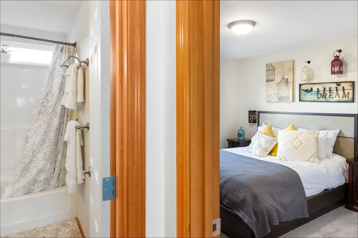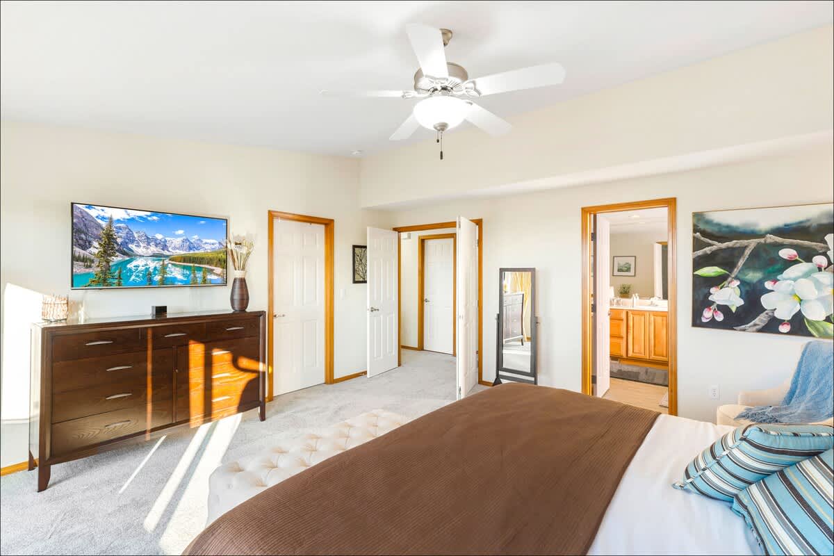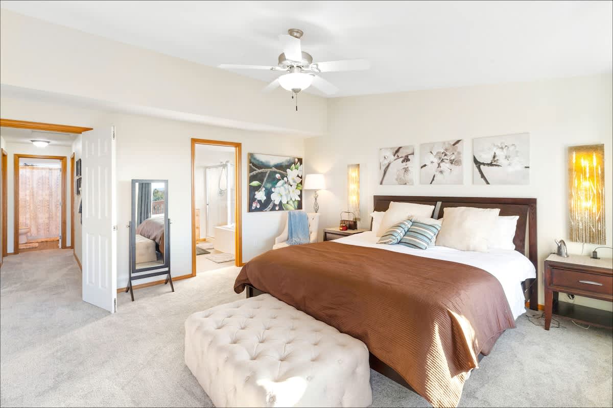 When you walk in, you'll find the great room with a comfortable sectional, chairs, gas fireplace and floor-to-ceiling windows overlooking the back deck and yard. Windows throughout the great room bring in tons of light and are also a feature of the master bedroom.