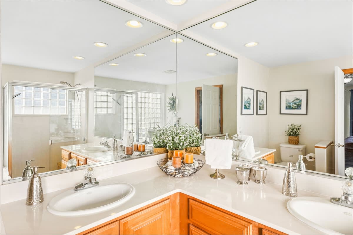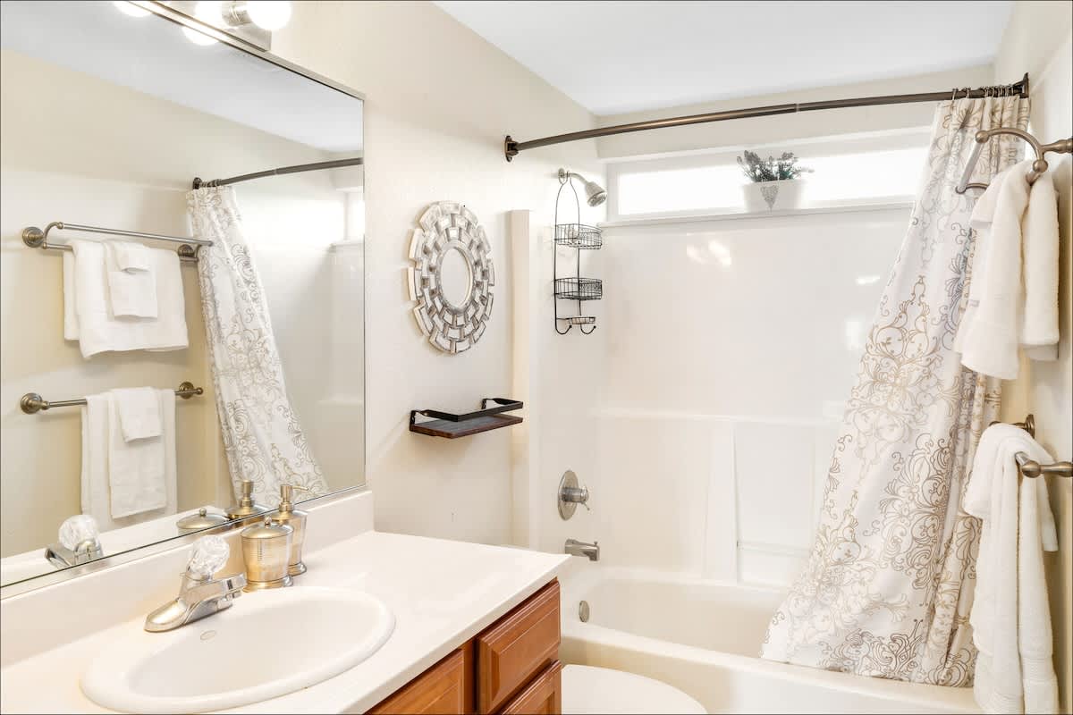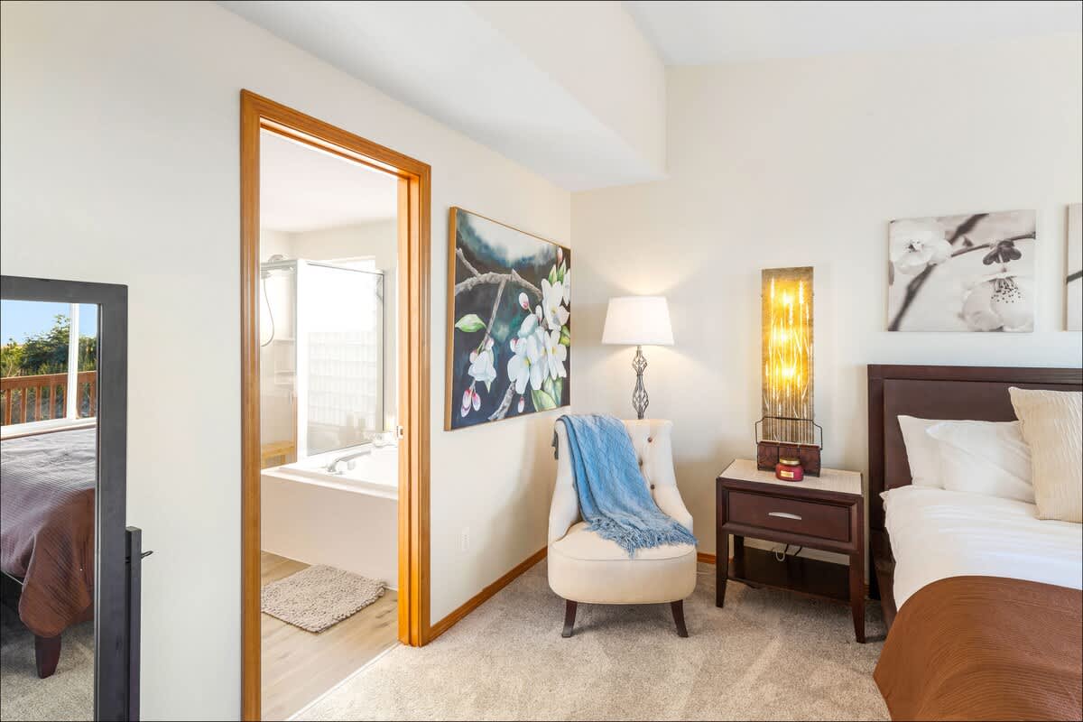 The master suite features an ensuite bathroom with separate shower and soaking tub, so welcome after a day at the beach. The second bathroom has a tub/shower combo. And there's also a powder room. Fluffy towels and bed linens are provided.
