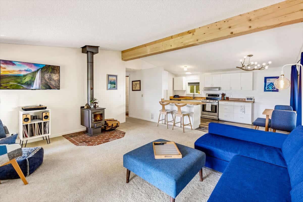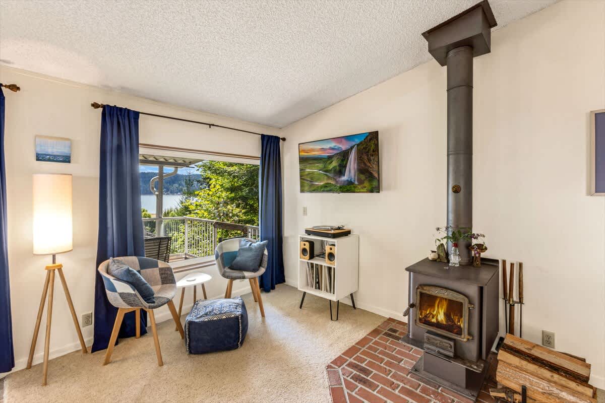 As you step inside, you'll be greeted by a warm and inviting atmosphere. The spacious living area features large windows and a sliding door that frame picturesque views of Hood Canal. Sink into the comfortable sofa and plush chairs to unwind after a day of exploration. Enjoy the wood burning stove and a movie on the smart television as you gather with friends or family at end the day.