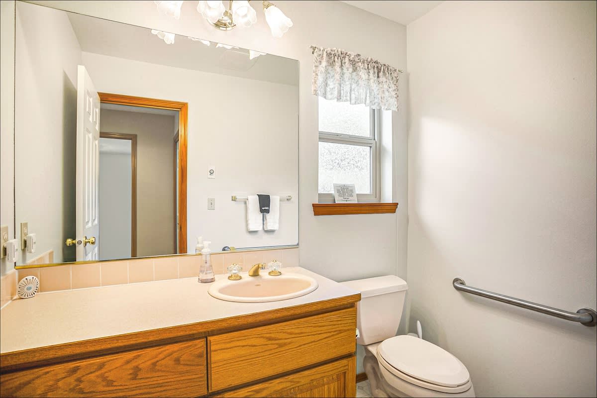 The other two bedrooms can be found on the first floor, along with the second bath with a tub/shower combo. There's also a powder room on the second floor. Towels and linens for all baths and beds are provided.