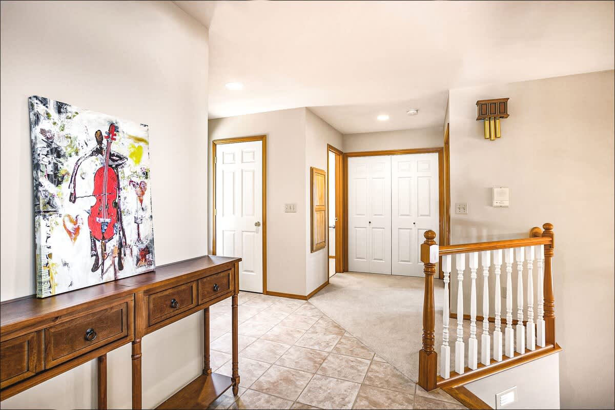 The common rooms - living, family, dining and kitchen - are all on the second floor, accessed by both stairway and elevator, making it a breeze to get upstairs. The living room and family room are served by the two-way gas fireplace, providing cozy warmth to both rooms, which also feature plush sofas, couches and recliners.