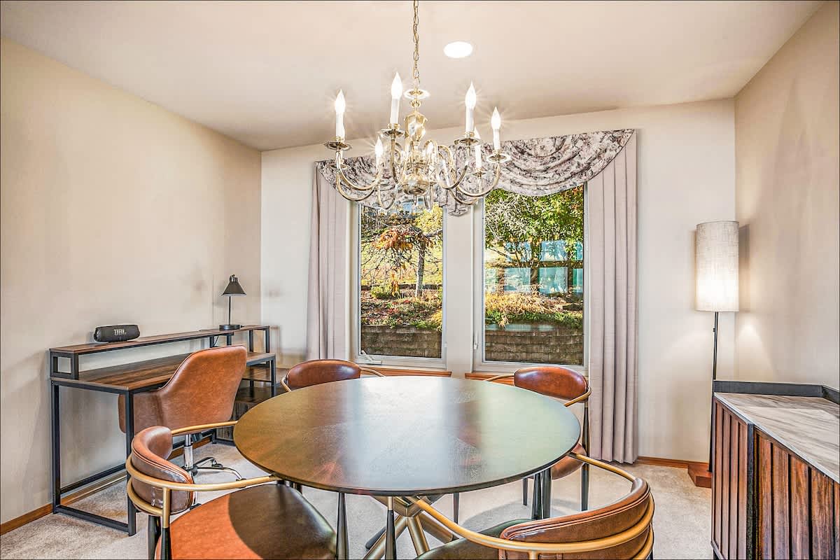 The formal dining room, adjacent to the kitchen, is perfect for family meals. The kitchen's breakfast bar will be a favorite spot - where kids will love eating their cereal and adults will enjoy being able to chat with your party's chef while dinner's being prepared. Of course, the kitchen has a full complement of appliances, including a gourmet coffee machine for morning lattes or espressos, and plenty of dinnerware, pots and pans.