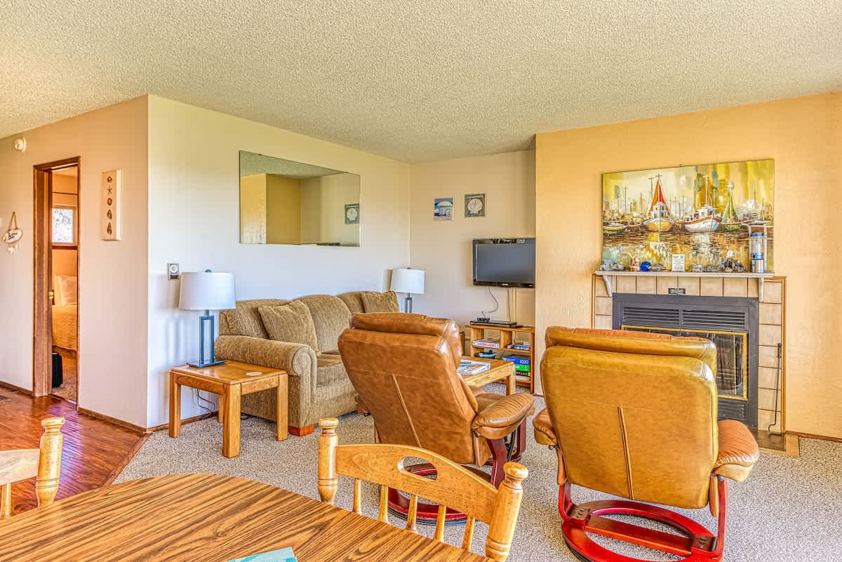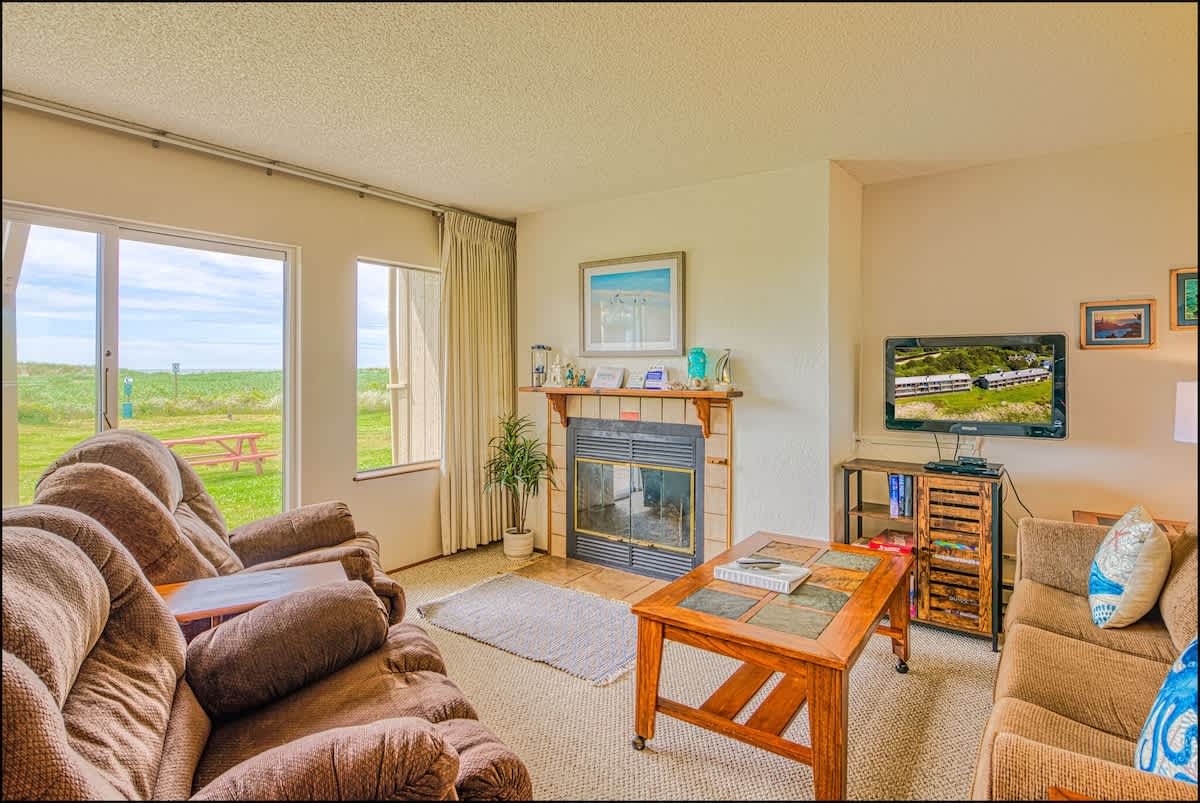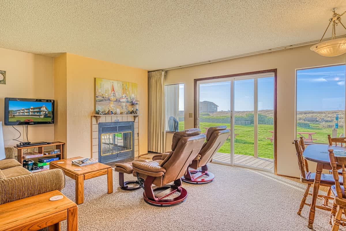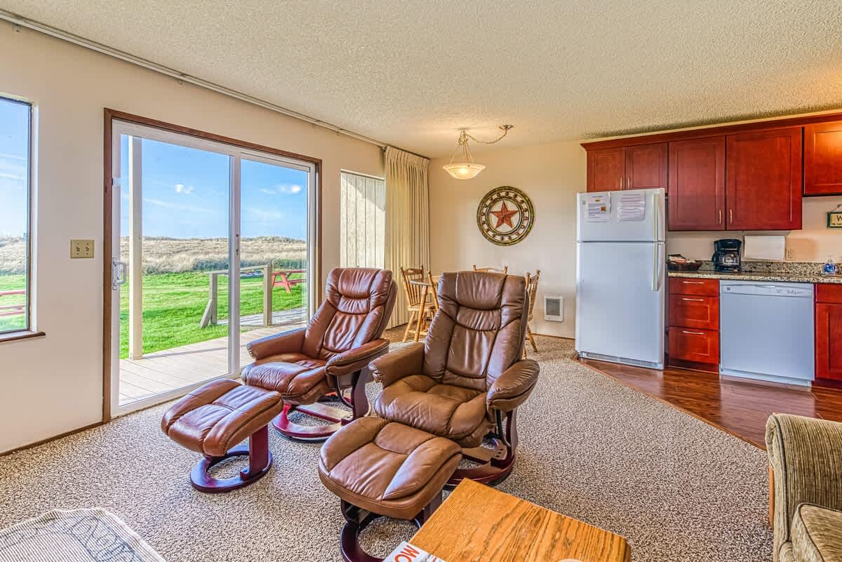 The charming living area features a couch, coffee table and two overstuffed leather recliners, all centered around a TV with DVD player. From here, you can take in the tremendous view of the Pacific Ocean, the dunes, and the seabirds that flit above them. In good weather, you can adjourn to the private deck to smell the fragrant sea air. Dogs are welcome with our standard per dog, per night fee.