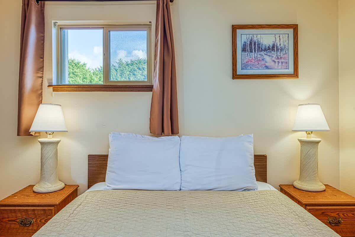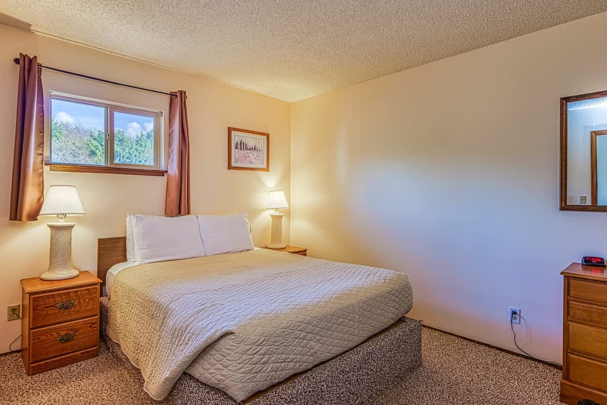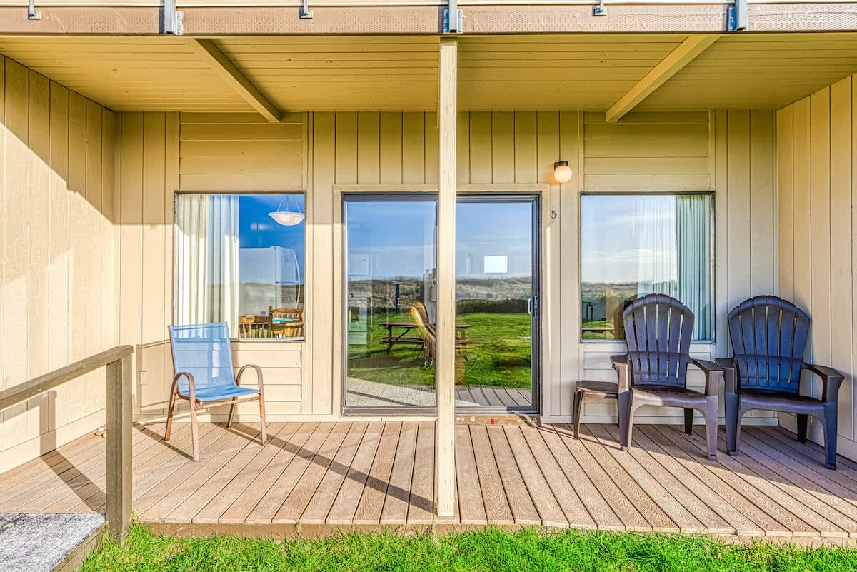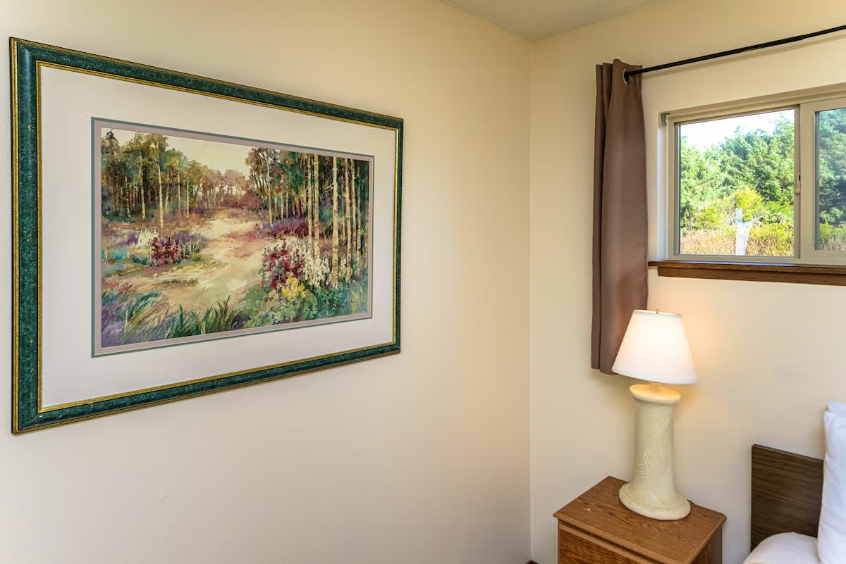 The charming living area features a couch, coffee table and two overstuffed leather recliners, all centered around a TV with DVD player. From here, you can take in the tremendous view of the Pacific Ocean, the dunes, and the seabirds that flit above them. In good weather, you can adjourn to the private deck to smell the fragrant sea air. Dogs are welcome with our standard per dog, per night fee.