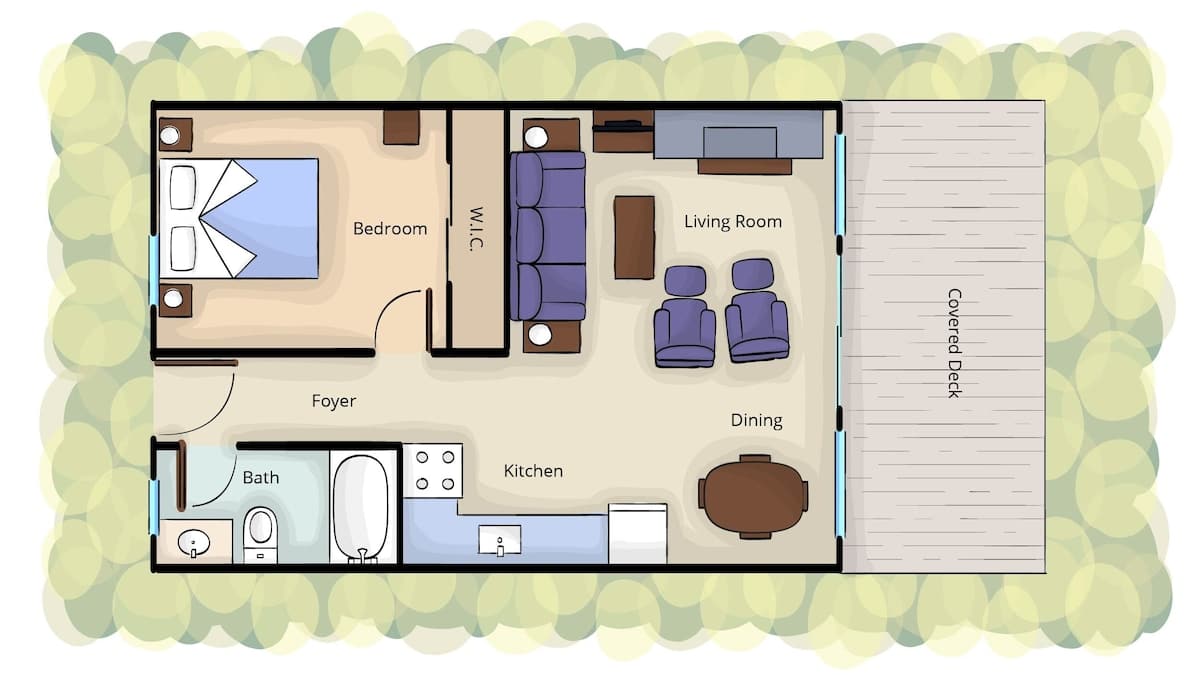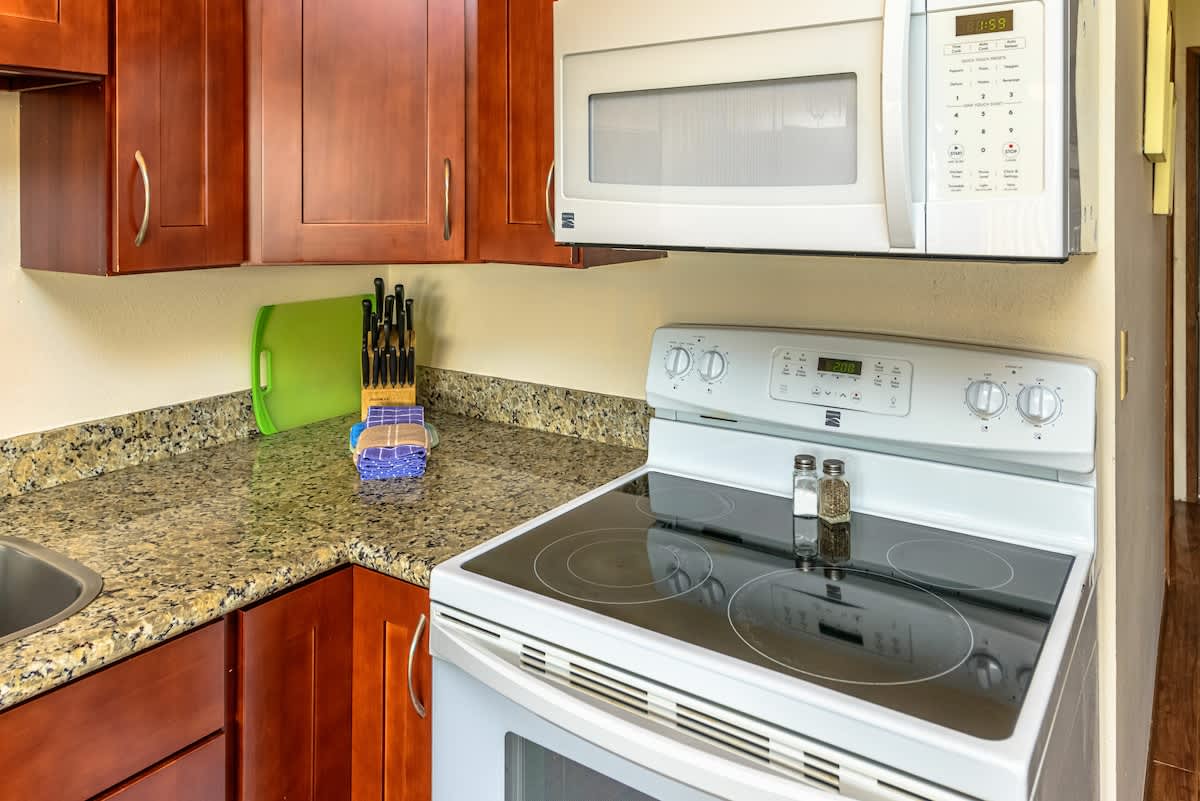 The bedroom features a high-quality queen bed and a wall-mounted TV to help you wind down at the end of your day. Two more guests will find linens to make a comfortable bed on the sleeper sofa in the living area. A full kitchen is stocked with pots, pans, flatware, and everything you need to cook your own meals before enjoying them at the adjacent dining area.