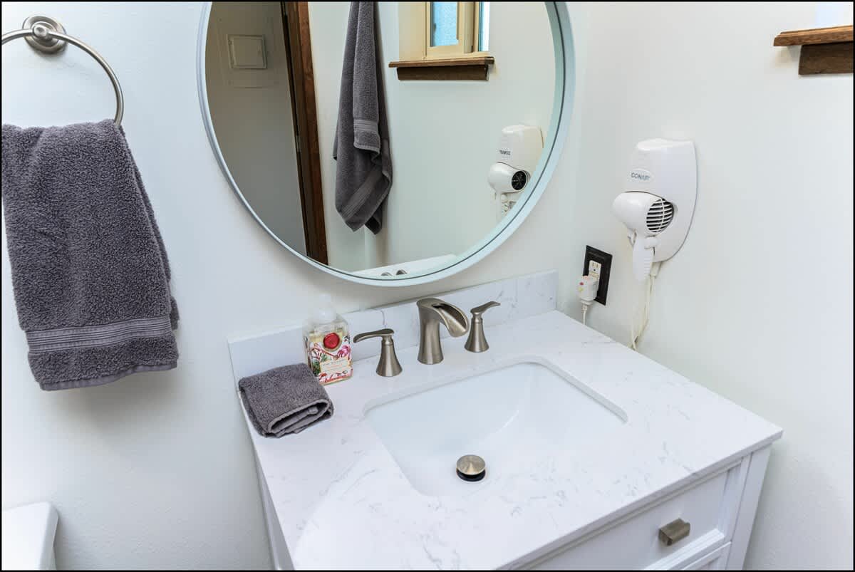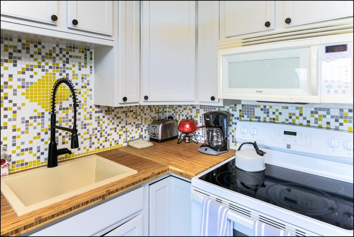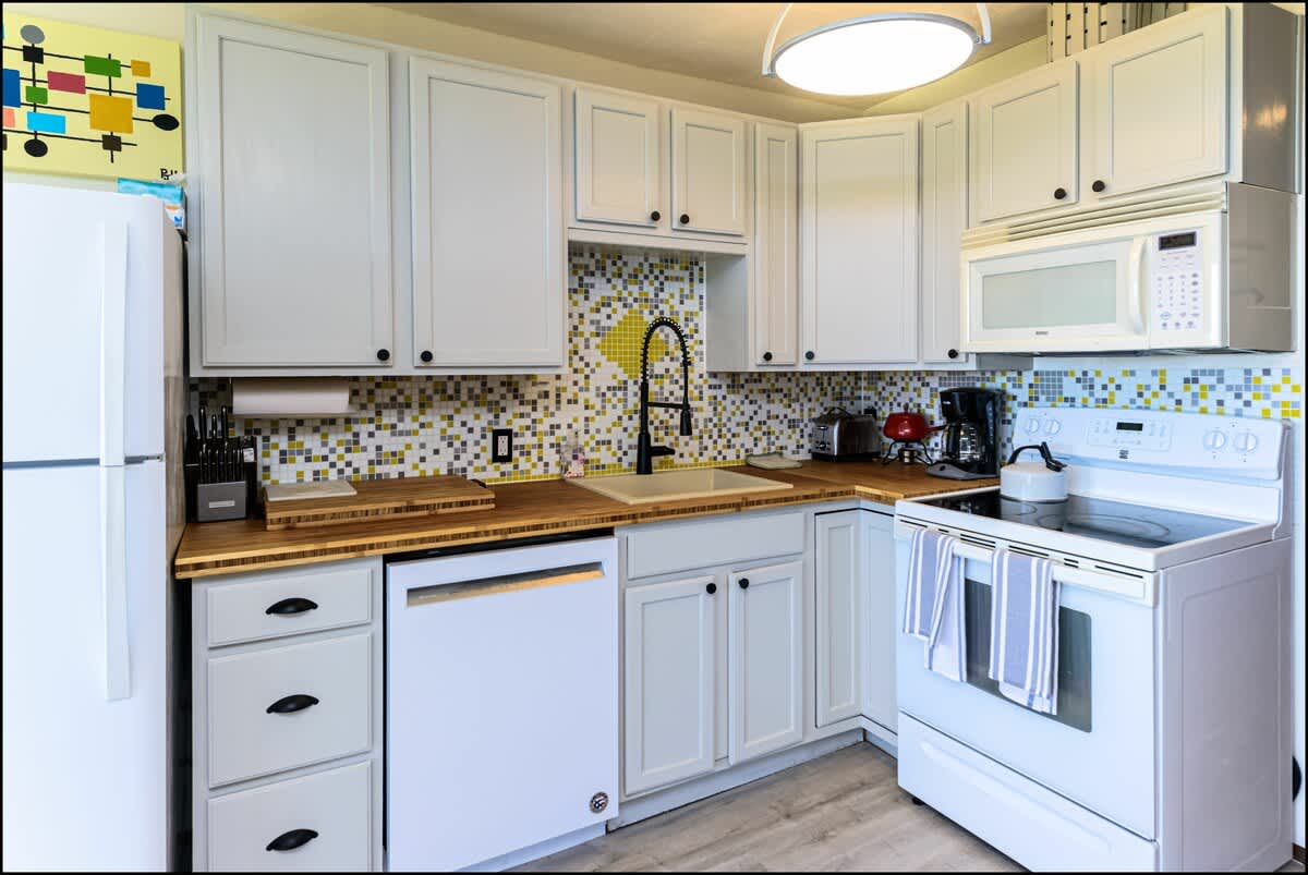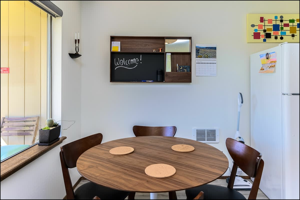 The bedroom features a high-quality king bed and a 42" wall-mounted TV to help you wind down at the end of your day. A full kitchen is stocked with pots, pans, flatware, and everything you need to cook your own meals before enjoying them at the adjacent dining area. You'll enjoy by the new countertops and bright tile backsplash. They really give the kitchen a modern look that will have you saying, "Wow."