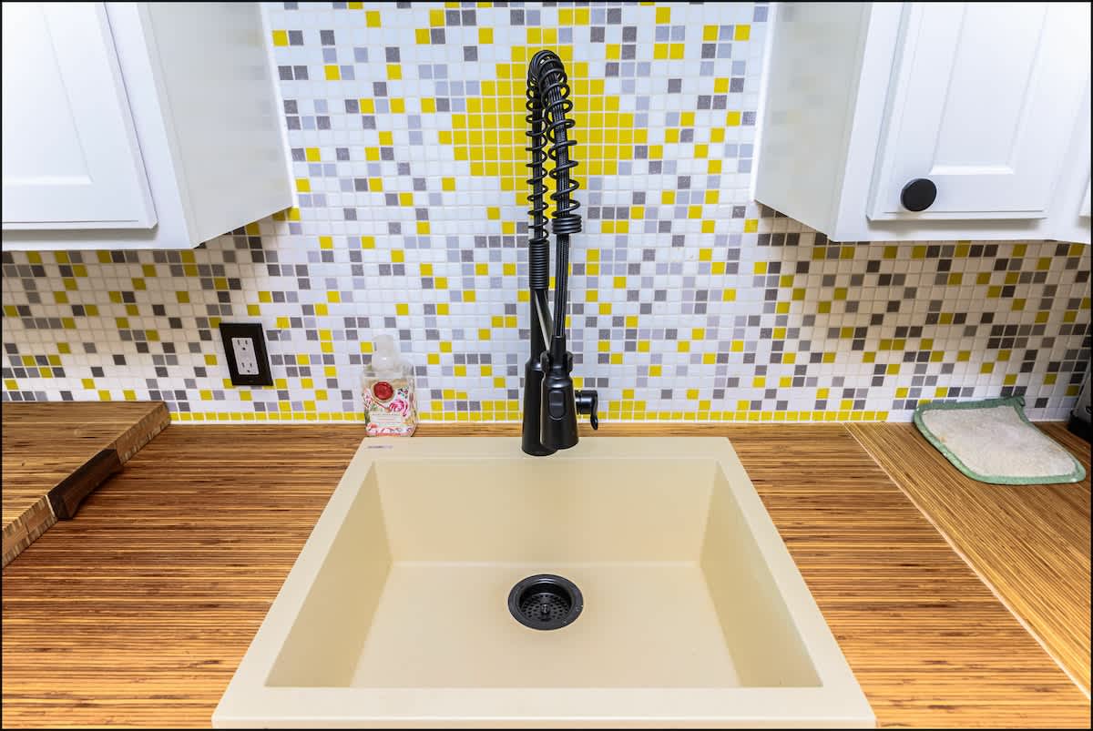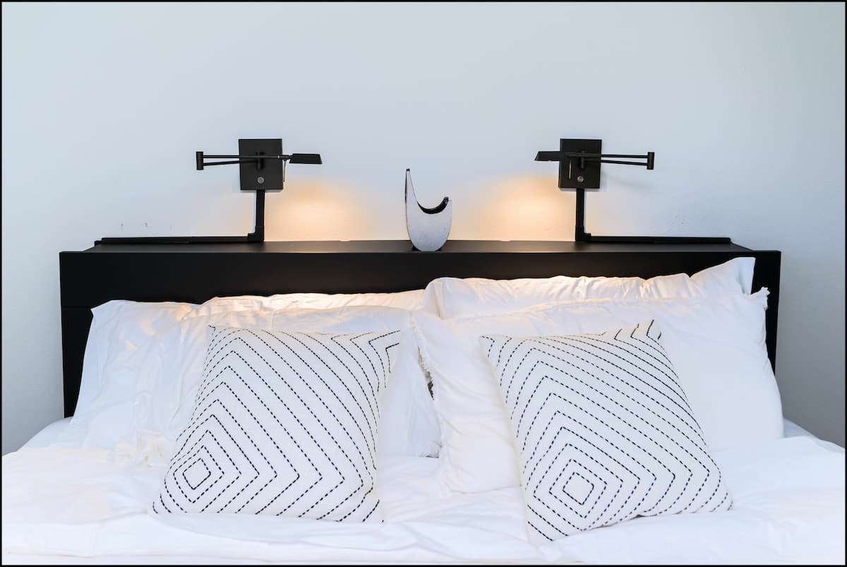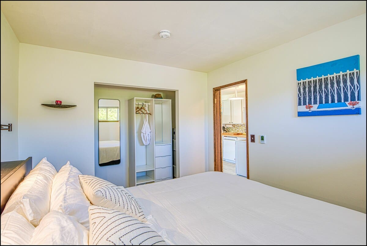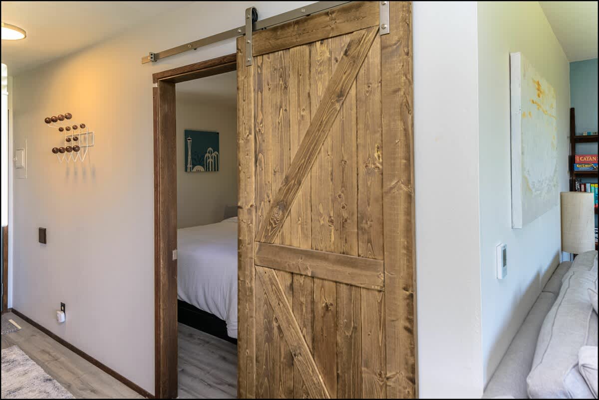 The bedroom features a high-quality king bed and a 42" wall-mounted TV to help you wind down at the end of your day. A full kitchen is stocked with pots, pans, flatware, and everything you need to cook your own meals before enjoying them at the adjacent dining area. You'll enjoy by the new countertops and bright tile backsplash. They really give the kitchen a modern look that will have you saying, "Wow."