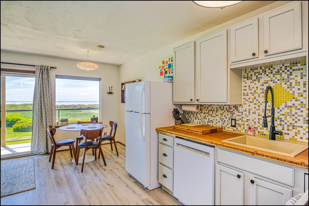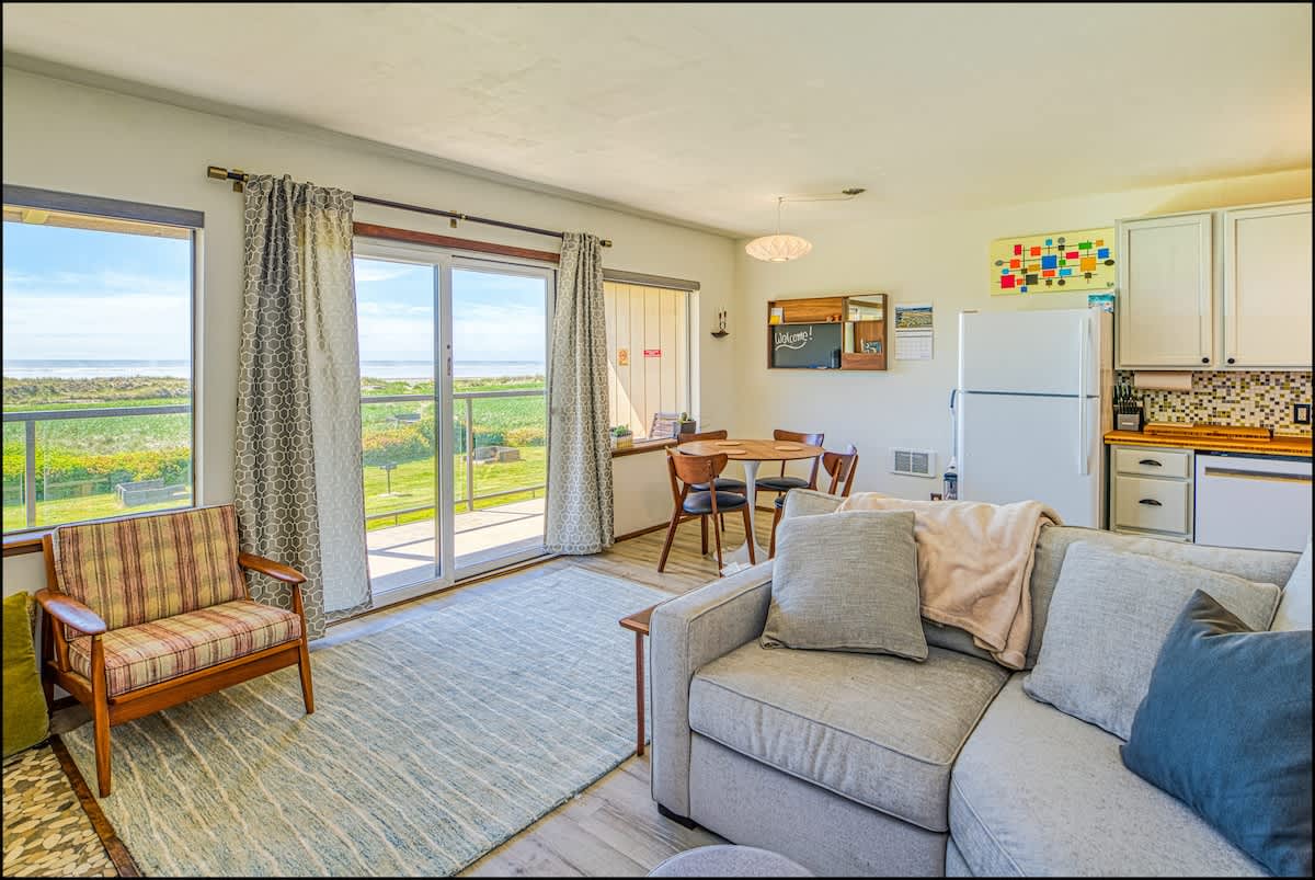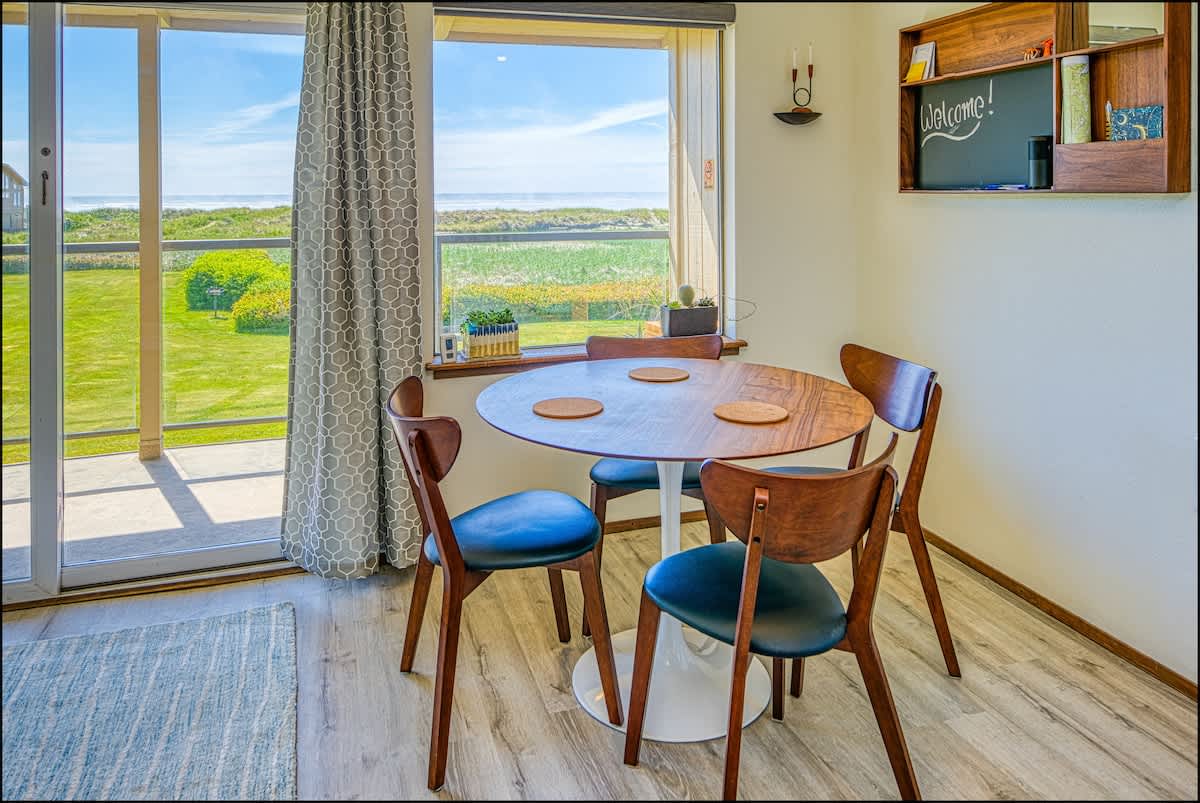 The charming living & dining areas boast all new, mid-century modern furniture for a fun and unusual vibe. In the living room, you'll find a big new sectional couch, coffee, table and comfortable lounge chair, all centered around a flat screen TV with DVD player, with a wood burning fireplace. From here, you can take in the tremendous view of the Pacific Ocean, the dunes, and the seabirds that fly around them. In good weather, you can adjourn to the private deck to enjoy the fragrant sea air.