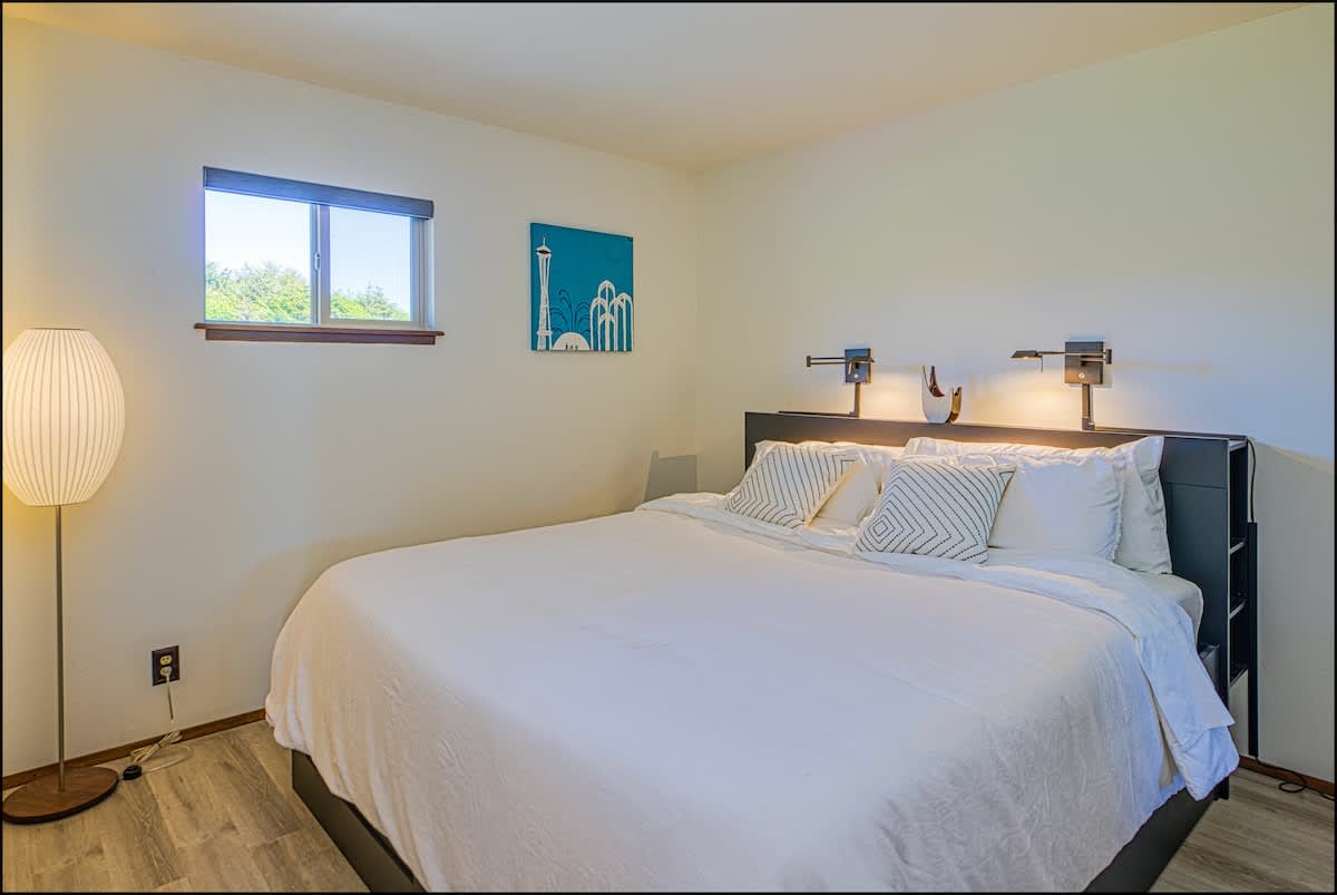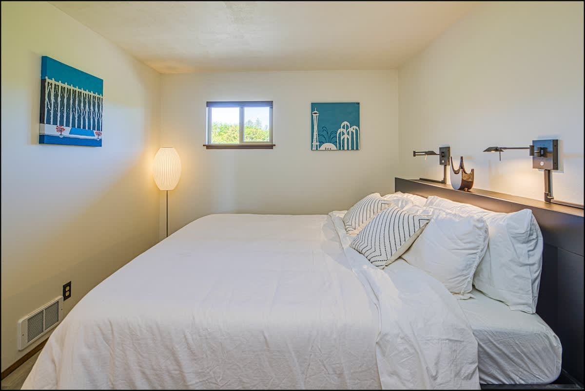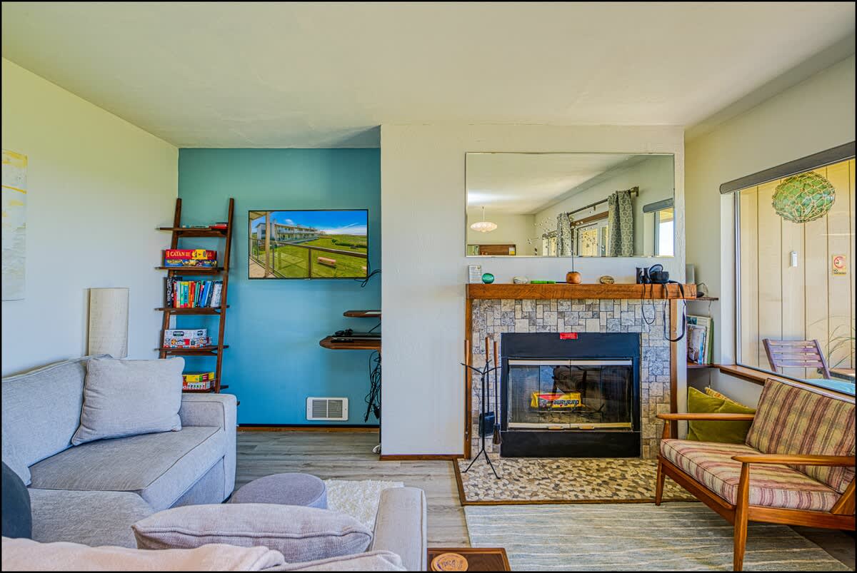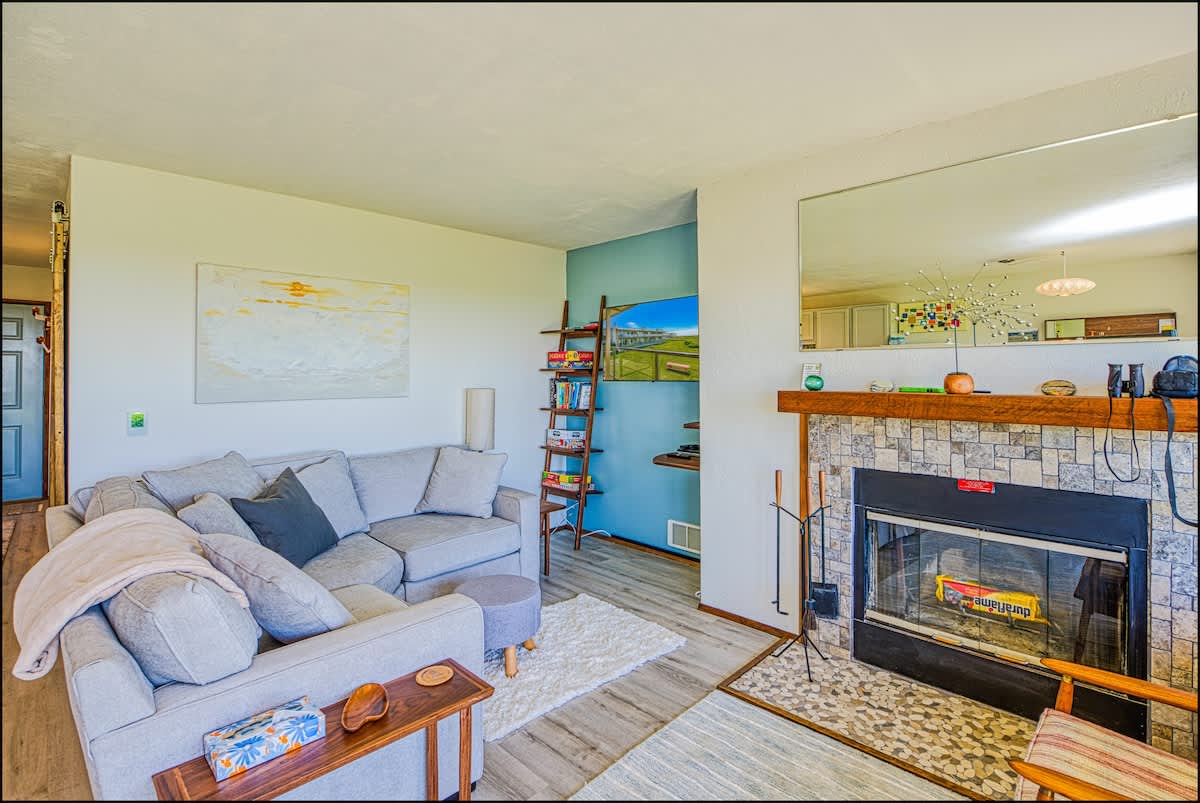 The charming living & dining areas boast all new, mid-century modern furniture for a fun and unusual vibe. In the living room, you'll find a big new sectional couch, coffee, table and comfortable lounge chair, all centered around a flat screen TV with DVD player, with a wood burning fireplace. From here, you can take in the tremendous view of the Pacific Ocean, the dunes, and the seabirds that fly around them. In good weather, you can adjourn to the private deck to enjoy the fragrant sea air.
