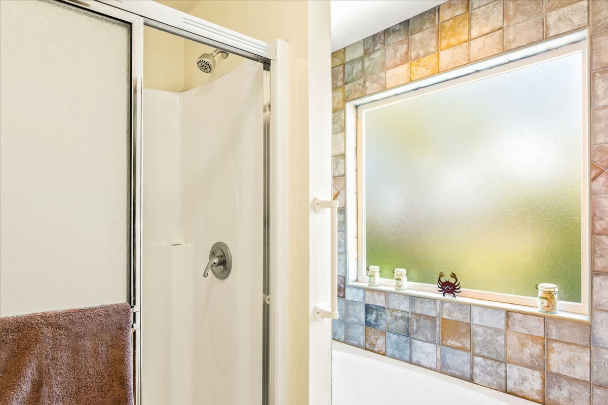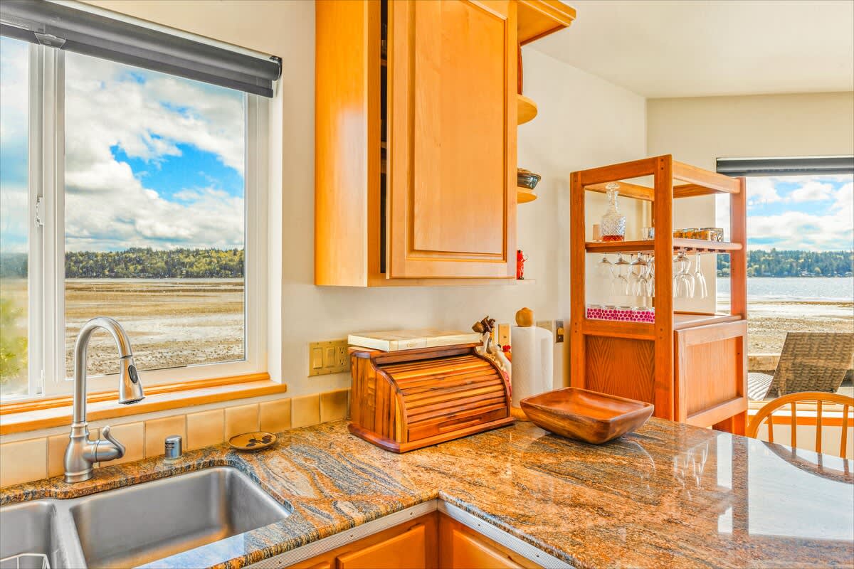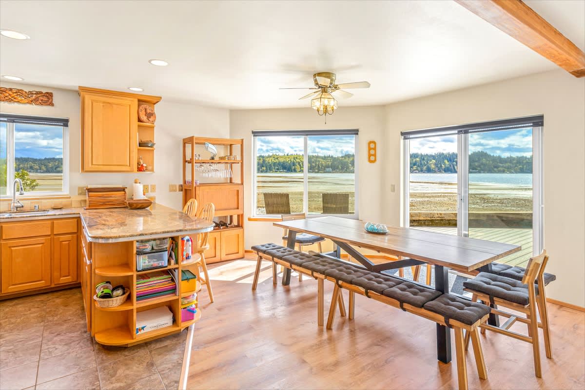 The fully-equipped kitchen boasts modern appliances and ample counter space, making meal preparation a breeze. Whether you're whipping up a hearty breakfast before a day of hiking or enjoying a leisurely dinner with fresh seafood caught nearby, you'll find everything you need to satisfy your culinary cravings. The kitchen includes a breakfast bar where guests can chat up the chef while meals are being prepared.