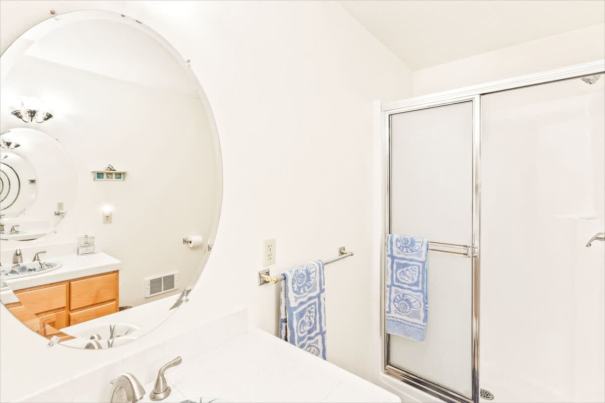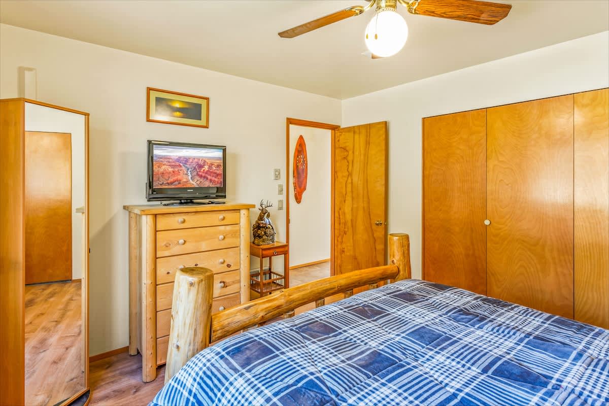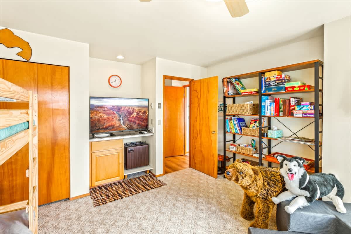 Three bedrooms offer comfortable sleeping arrangements for up to eight guests. Two bedrooms are furnished with plush queen-sized beds, providing a peaceful haven for restful nights. The third bedroom is perfect for kids or young adults, featuring two sets of bunk beds with soft linens and cozy blankets. The bunk room has a smart television with Roku, as well as games and puzzles to entertain the crew. There's also another smart television in one of the downstairs bedrooms.
