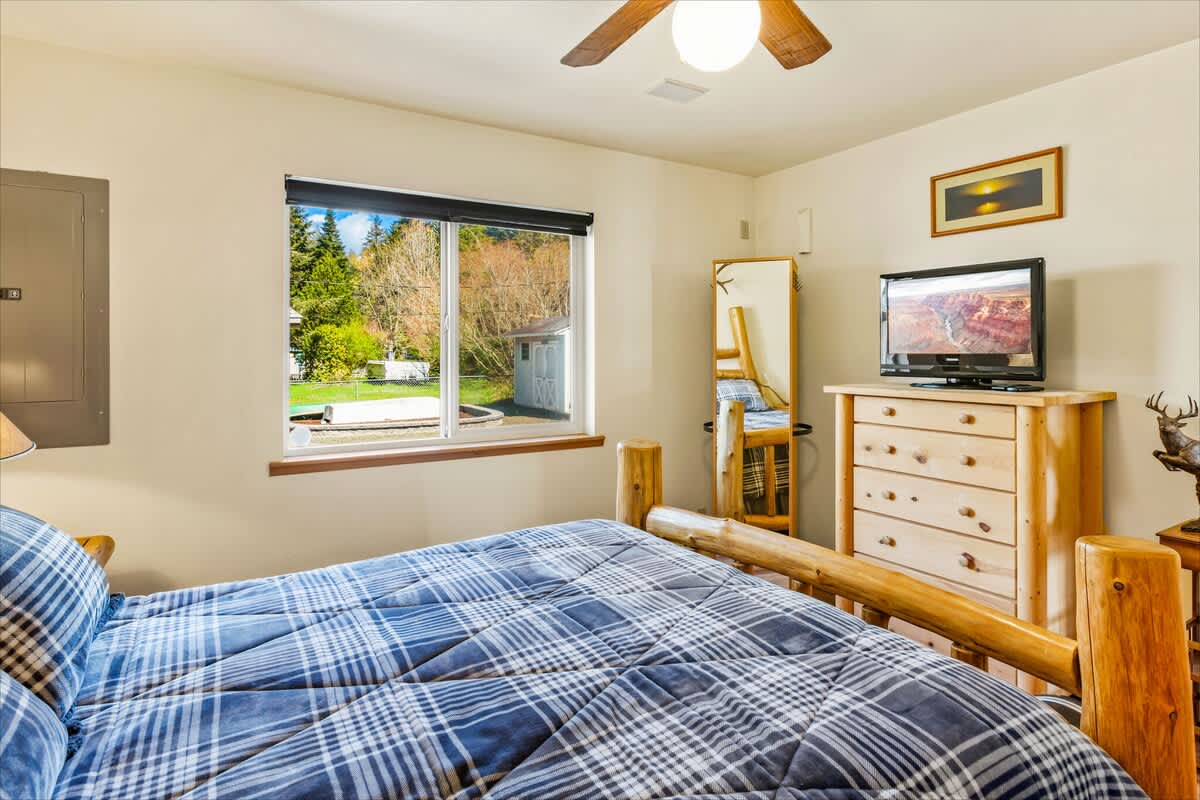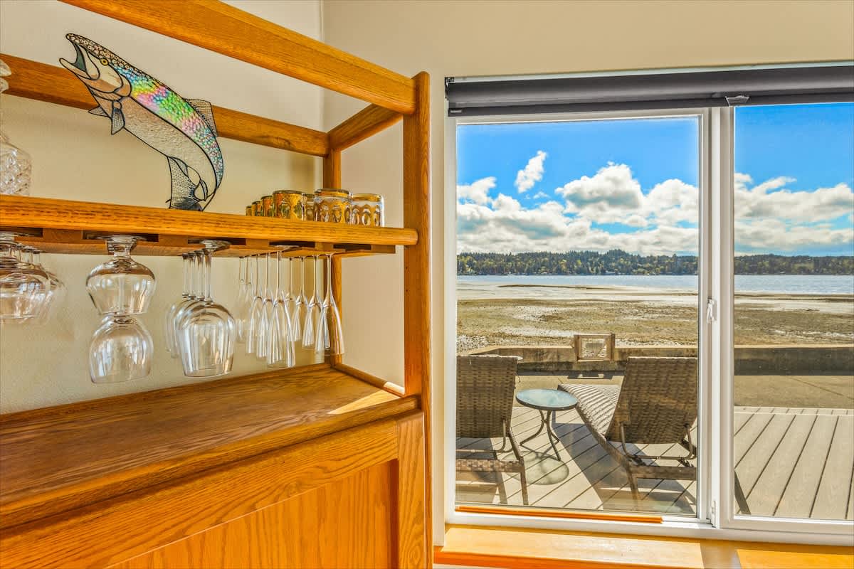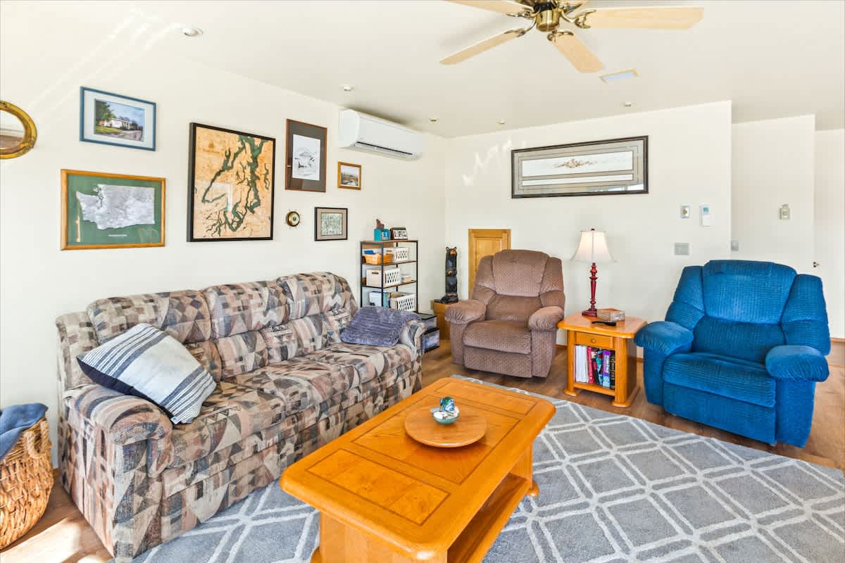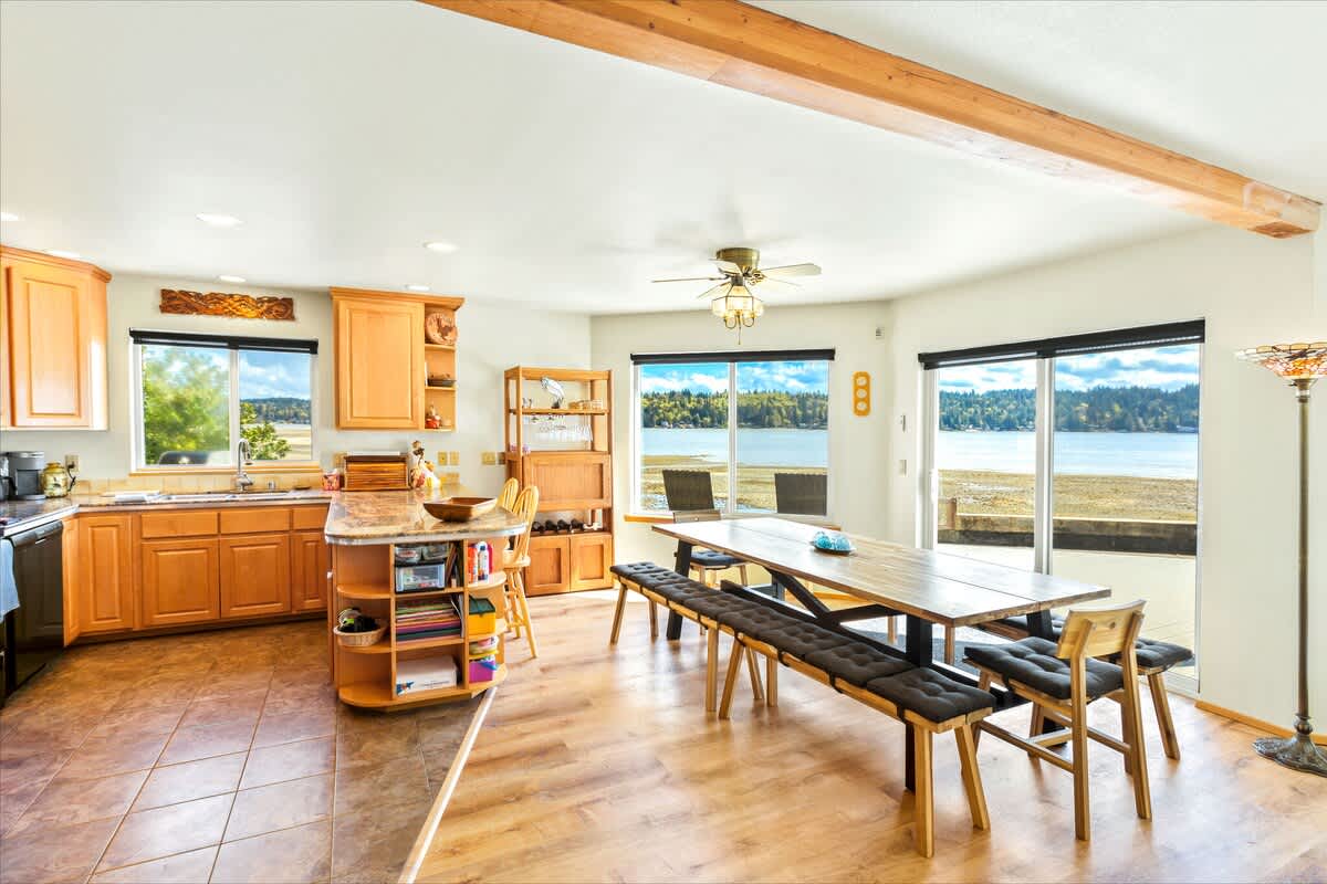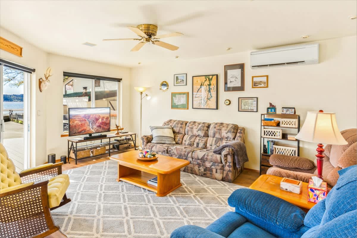 As you step inside, you'll be greeted by a warm and inviting atmosphere. The spacious living area features large windows and sliding glass doors that frame picturesque views of Hood Canal. Sink into the comfortable sofa and plush chairs to unwind after a day of exploration. A smart television with Roku and DVD lets you gather the family for a favorite movie as you end your day.